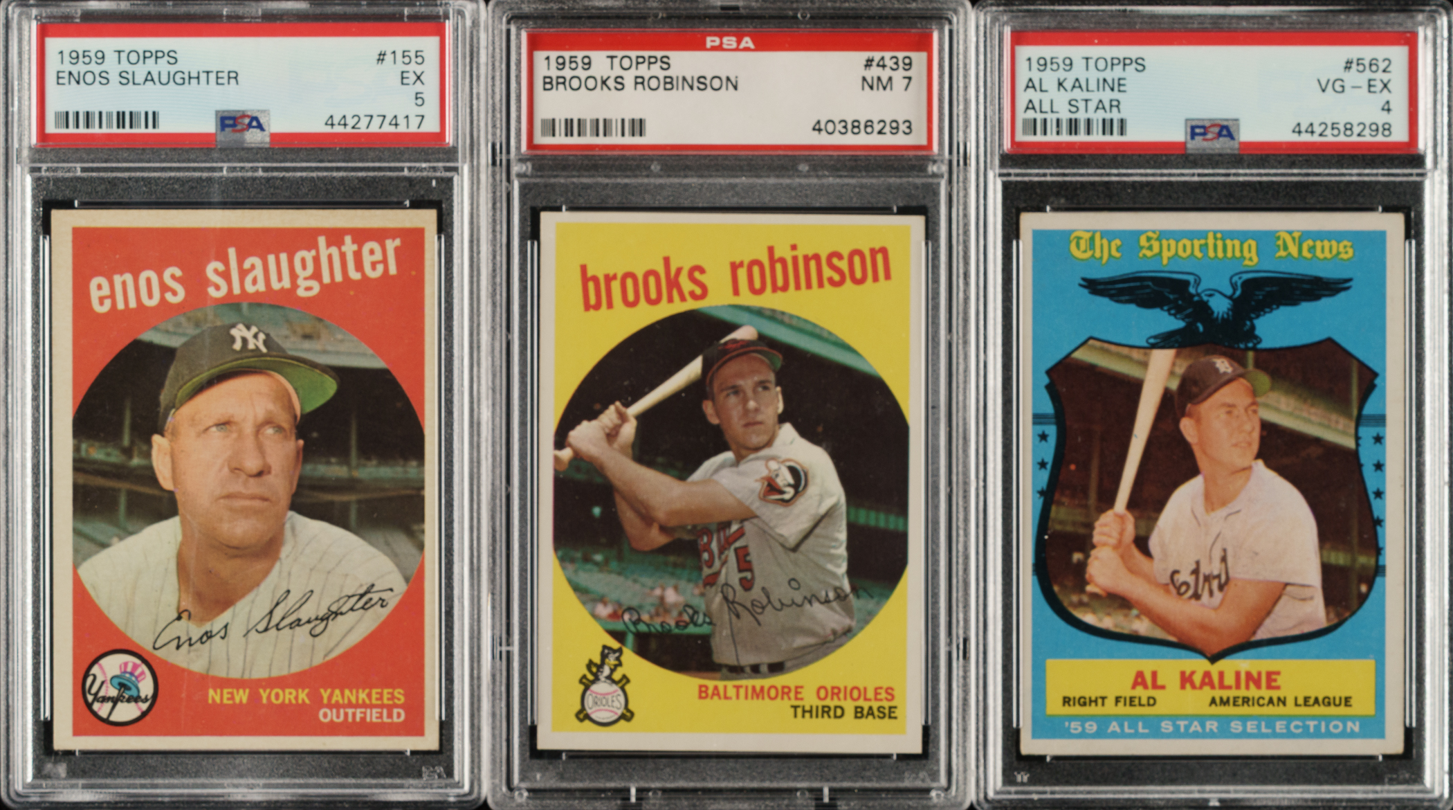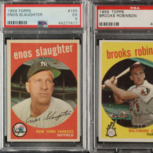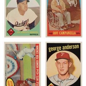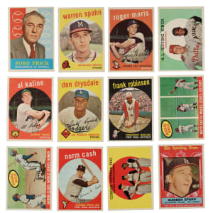 Presented is a near-complete set of 1959 Topps baseball consisting of 546 different cards (out of 572 in the set). Missing the following 26 cards for completion: #10 Mantle, 50 Mays, 61, 150 Musial, 163 Koufax, 180 Berra, 205, 212 Fence Busters, 270, 310, 350 Banks, 380 Aaron, 390, 430 Ford, 450 Mathews, 478 Clemente, 480, 510 Yankees Team, 514 Gibson, 515 Killebrew, 537, 559 Banks AS, 561 Aaron AS, 563 Mays AS, 564 Mantle AS, and 572. This near set is highlighted by dozens of stars and Hall of Famers of the era, including Roger Maris, Al Kaline, Frank Robinson, and Brooks Robinson. Condition is 17% Ex-Mt to Nr/Mt (including a few Nr/Mt-Mt), 69% Vg-Ex to Ex, and 14% Gd to Vg (including a couple lesser, four trimmed, and a couple with a slight miscut). Three cards have been professionally graded and encapsulated by PSA. Keys: #1 Frick (Gd+), 20 Snider (Ex), 40c Spahn/1921 (Vg-Ex+), 155 Slaughter (EX 5), 202 Maris (Vg-Ex+), 317 NL Hitting Kings (Vg+), 338 Anderson RC (Ex), 360 Kaline (Vg-Ex+), 387 Drysdale (Ex+), 435 F. Robinson (Vg), 439 B. Robinson (NM 7), 461 Mantle Homer (Vg-Ex+), 464 Mays' Catch (Ex), 467 Aaron Clubs Homer (trimmed left edge, otherwise Ex-Mt), 509 Cash RC (Ex), 543 Corsair Outfield Trio w/ Clemente (Vg-Ex), 550 Campanella (Ex), 562 Kaline AS (VG-EX 4), and 571 Spahn AS (Vg-Ex+). Very attractive and mostly mid- to high-grade near-complete set of 1959 Topps, one of the most popular and classic of all baseball-card sets. Total: 546 cards.