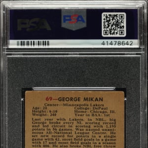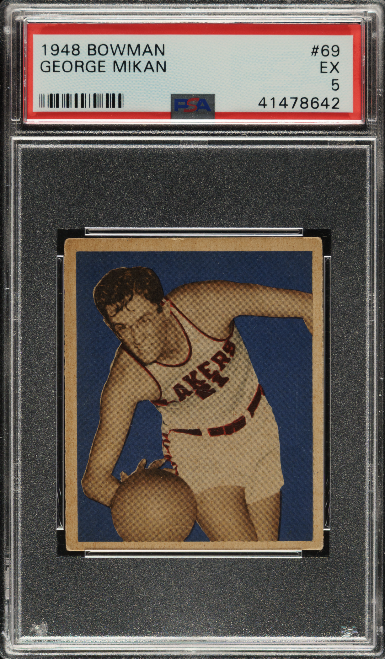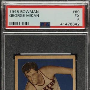 Graded EX 5 by PSA. Superb mid-grade example of Hall of Famer George Mikan's rookie card from the 1948 Bowman basketball set, widely regarded as the king of all basketball cards. The 1948 Bowman Basketball series is particularly significant as this was the first set ever issued devoted exclusively to basketball and the only basketball set ever produced by Bowman. The George Mikan card in this set is considered the most sought-after and valuable of all basketball cards. Cards from this set are extremely hard to find in high grade, in part because these cards (like 1949 Bowman baseball) often have soft corners due to the quality of the paper stock on which they are printed. The offered card has a beautiful blue background, a crisp, clean image, and light corner wear. Clean reverse with bold text. This card represents an outstanding opportunity to acquire a strong example of one of the most important vintage basketball cards at perhaps a fraction of the cost of a higher-graded example.