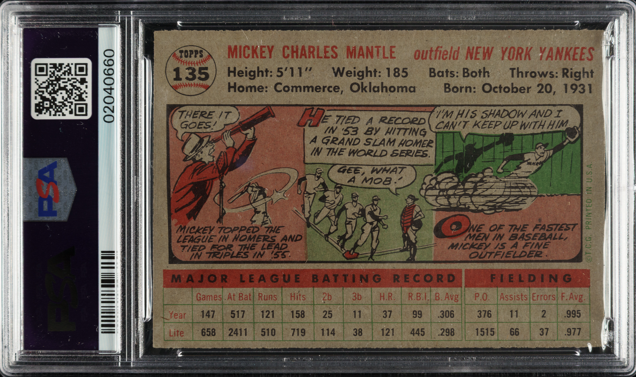 Graded NM 7 by PSA. A beautiful gray-back variety of New York Yankees Hall of Famer Mickey Mantle's 1956 Topps card. The 1956 Topps Mantle card is highly regarded by collectors on many counts. In addition to being a striking card with an exceptional design, this card dates from Mantle's Triple Crown season. This example has bold colors, outstanding registration, crisp white borders, and strong corners. The gray back is clean. This is the key card in the set and one of the cornerstones to a high-grade 1950s Mantle card collection or classic 1950s card collection.
