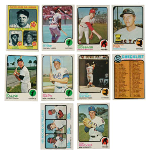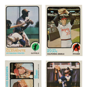 Presented is a complete set of the 1973 Topps series consisting of 660 different cards. The rookie cards of Hall of Famers Mike Schmidt and Rich Gossage, as well as the final cards of Roberto Clemente and Willie Mays, highlight the 1973 Topps issue, one of the most popular sets of the 1970s. Condition is 40% Nr/Mt to Nr/Mt-Mt, 46% Ex to Ex-Mt, and 14% Vg to Vg-Ex (including a few lesser). Keys: #1 Ruth/Mays/Aaron (15/85 T/B, otherwise Vg-Ex), 50 Clemente (25/75 L/R, otherwise Nr/Mt), 100 Aaron (Ex+), 130 Rose (Ex), 174 Gossage RC (Vg-Ex), 193 Fisk (Ex), 220 Ryan (30/70 L/R, otherwise Ex-Mt), 280 Kaline (Ex-Mt due to centering), 305 Mays (Vg), 350 Seaver (Nr/Mt-Mt), 380 Bench (Nr/Mt), 588 Checklist (Nr/Mt), 614 Evans RC (Nr/Mt+), and 615 Schmidt RC (Nr/Mt). This is a very attractive 1973 Topps complete set with numerous highlights. Total: 660 cards.