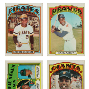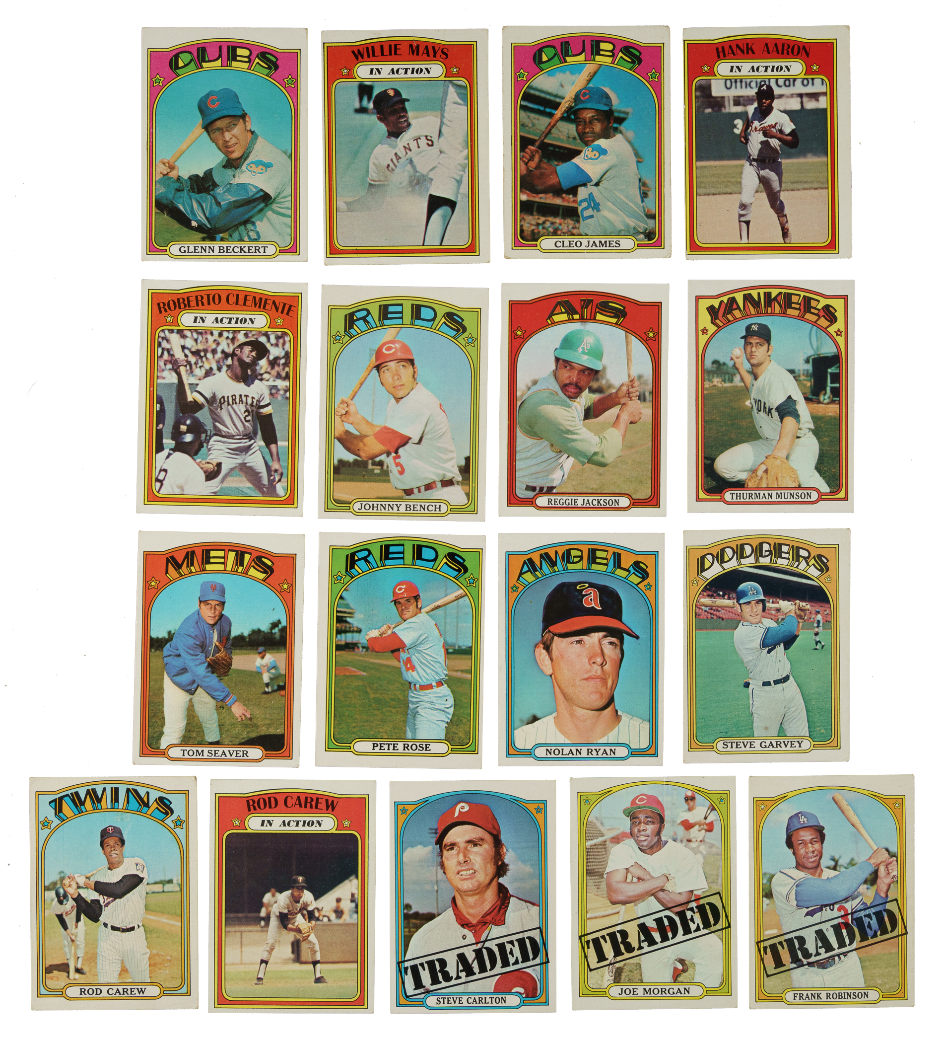 Presented is a mixed-grade near-complete set (784 out of 787) of 1972 Topps, one of the most popular Topps sets of the decade. Missing only the following three cards for completion: #54, 550 B. Robinson, and 741. Condition is 11% Ex to Ex-Mt (including 3% better from the high-number series), 75% Vg to Vg-Ex, and 14% lesser. Keys: #45a Beckert/green under "c" and "s" (Vg), 49 Mays (Vg), 50 Mays IA (Vg), 79 Fisk RC (Vg-Ex), 117a James/green under "c" and "s" (Gd), 299 Aaron (Vg), 300 Aaron IA (5/95 L/R, otherwise Vg), 309 Clemente (Vg), 310 Clemente IA (Vg+), 433 Bench (Ex-Mt), 435 Jackson (Ex), 441 Munson (Nr/Mt-Mt), 445 Seaver (Vg+), 559 Rose (80/20 L/R and B/T, otherwise Ex+), 595 Ryan (Gd+), 686 Garvey (Vg), 695 Carew (Vg), 696 Carew IA (Vg-Ex), 751 Carlton Traded (Vg-Ex+), 752 Morgan Traded (Vg), and 754 F. Robinson Traded (Vg). This is an attractive, mostly mid-grade near-complete set of one of the great Topps classics of the era. Total: 784 cards.