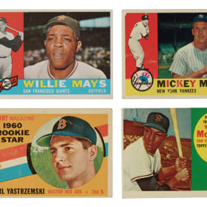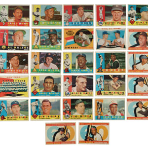 Presented is a complete set of 1960 Topps baseball, which was Topps' last horizontal issue, highlighted by the rookie cards of Hall of Famers Carl Yastrzemski and Willie McCovey. Many of the biggest stars in the set, including Mantle, Mays, and Aaron, appear in the set more than once due to the All-Star card series. Mantle has three cards in this set, as he also appears on the #160 "Rival All-Stars" card with Ken Boyer. Condition is 20% Ex to Ex-Mt (approximately two-thirds Ex and including a couple Nr/Mt), 64% Vg to Vg-Ex, and 16% lesser (including one trimmed). Keys: #1 Wynn (Vg), 10 Banks (Vg), 28 B. Robinson (Pr), 35 Ford (Gd), 50 Kaline (Fr), 73 Gibson (Vg), 136 Kaat RC (Vg-Ex), 148 Yastrzemski RC (Pr), 160 Mantle/Boyer (Fr), 200 Mays (Ex+), 210 Killebrew (Pr), 250 Musial (small pencil marks on front, otherwise Gd), 300 Aaron (Gd), 316 McCovey RC (0/100 T/B, otherwise Vg-Ex), 326 Clemente (Fr), 332 Yankees Team (marked with pen, otherwise Vg), 343 Koufax (Vg-Ex), 350 Mantle (Pr), 377 Maris (Pr), 420 Mathews (Gd+), 445 Spahn (ink marks on reverse, otherwise Vg), 475 Drysdale (Vg), 480 Berra (Pr-Fr), 490 F. Robinson (Vg), 493 Snider (Vg), 554 McCovey AS (100/0 T/B, otherwise Vg), 560 Banks AS (Vg-Ex+), 563 Mantle AS (Vg-Ex+), 564 Mays AS (Vg-Ex+), 565 Maris AS (Vg+), and 566 Aaron AS (Vg). This is an attractive and mostly mid-grade complete set which, in addition to all the special cards and scarce high numbers (#507-572), is loaded with Hall of Famers and stars from the 1960s. Total: 572 cards.
