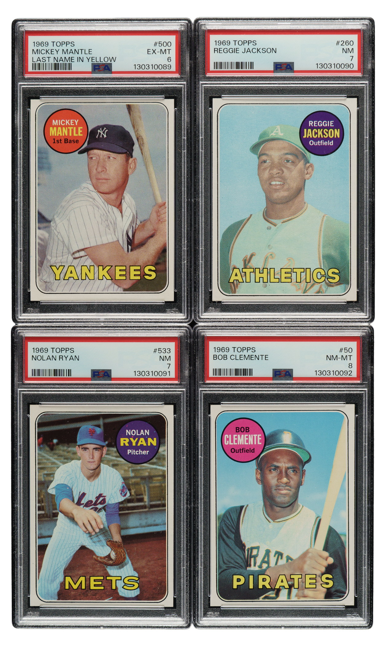 Outstanding complete set of one of the great classics of the 1960s! The 1969 Topps set is highlighted by the rookie cards of Oakland A's Hall of Famers Reggie Jackson and Rollie Fingers, plus the last card of Mickey Mantle. This final card of "The Mick," who retired March 1, 1969, contains his complete statistical record on the reverse. Condition is 26% Nr/Mt to Nr/Mt-Mt, 53% Ex to Ex-Mt (including some due solely to centering), and 21% Vg to Vg-Ex (including some due to centering and a few with a slight miscut). We have selected four cards for grading and encapsulation by PSA. Keys: #20 Banks (Ex), 50 Clemente (NM-MT 8), 95 Bench (Ex due solely to centering), 100 Aaron (Ex), 120 Rose (Ex), 130 Yastrzemski (100/0 T/B, otherwise Vg-Ex), 190 Mays (Ex), 200 Gibson (slightly miscut left edge, otherwise Gd-Vg due to centering), 250 F. Robinson (Nr/Mt), 255 Carlton (Ex), 260 Jackson RC (NM 7), 375 Killebrew (Ex), 410 Kaline (Ex), 480 Seaver (Ex-Mt), 500 Mantle (EX-MT 6), 510 Carew (Nr/Mt+), 533 Ryan (NM 7), 550 B. Robinson (Ex-Mt), 573 Palmer (Ex-Mt), and 597 Fingers RC (Ex-Mt). This is a very attractive mid- to high-grade set of one of the great 1960s Topps issues, loaded with Hall of Famers. Total: 664 cards.