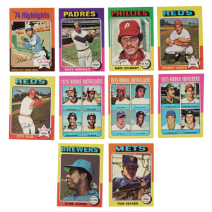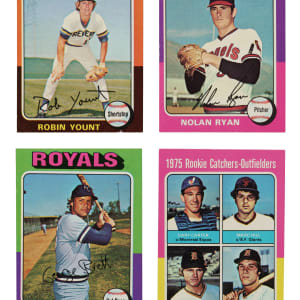 The rookie cards of Hall of Famers George Brett, Robin Yount, Gary Carter, and Jim Rice highlight the 1975 Topps Mini issue, one of the most popular and unusual sets of the 1970s. The colored flush-to-the-border design of the 1975 Topps Mini set makes this issue particularly challenging to collect in extremely high grade. Condition is 58% Nr/Mt to Nr/Mt-Mt, 35% Ex to Ex-Mt, and 5% Vg to Vg-Ex (including a few lesser and a few miscut). Keys: #1 Aaron HL (Vg-Ex), 61 Winfield (Ex-Mt+), 70 Schmidt (Nr/Mt), 223 Yount RC (80/20 T/B, otherwise Nr/Mt), 228 Brett RC (Ex+ due to centering), 260 Bench (80/20 T/B, otherwise Nr/Mt), 320 Rose (30/70 L/R, otherwise Nr/Mt), 370 Seaver (Nr/Mt-Mt), 500 Ryan (30/70 L/R, otherwise Nr/Mt+), 616 Rice RC (Nr/Mt+ due solely to centering), 620 Carter RC (Nr/Mt), 622 Lynn RC (Nr/Mt-Mt), 623 Hernandez RC (miscut side edges, otherwise Vg), and 660 Aaron (Vg). This is an extremely attractive and mostly high-grade complete set loaded with Hall of Famers and stars from the 1970s. Total: 660 cards.