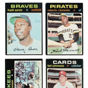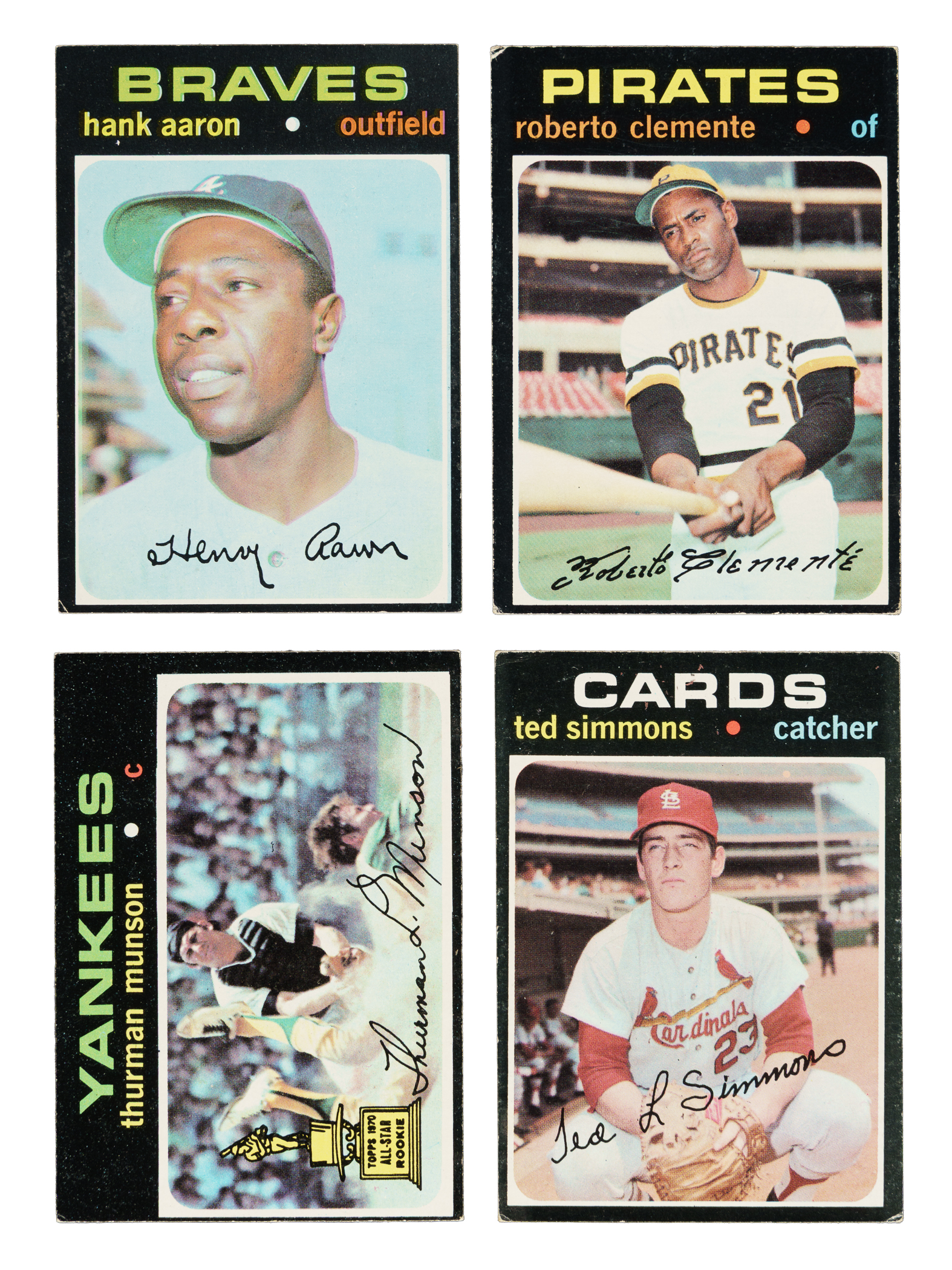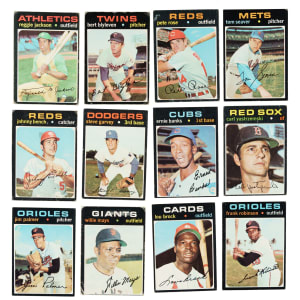 Presented is a near-complete set of 1971 Topps consisting of 664 different cards (out of 752 in the set). The black flush-to-the-border design of the 1971 Topps set makes this issue particularly challenging to collect in extremely high grade. Includes three duplicates (#424, 426, and 519). Condition is 19% Ex-Mt to Nr/Mt (approximately two-thirds Ex), 72% Vg to Vg-Ex, and 9% lesser (including a couple altered and a couple with a slight miscut). Keys: #5 Munson (Vg-Ex+), 20 Jackson (Gd+), 26 Blyleven RC (Fr), 100 Rose (Vg+), 117 Simmons RC (Vg), 160 Seaver (Vg-Ex), 250 Bench (Vg), 341 Garvey RC (Vg), 400 Aaron (Vg-Ex), 525 Banks (Vg), 530 Yastrzemski (Pr due to partially erased pencil), 570 Palmer (Ex), 600 Mays (erasure marks on front, otherwise Fr), 625 Brock (Vg), 630 Clemente (Vg), 640 F. Robinson (Vg-Ex+). Missing the following eighty-eight cards for completion: #180, 181, 213, 220, 329, 331, 353, 370, 385, 386, 406, 408, 417, 430, 439, 440, 444, 452, 454, 456, 469, 482, 492, 495, 510, 513 Ryan, 522, 532, 535, 538, 541, 543, 544, 550 Killebrew, 552, 561, 563, 567, 573, 574, 580, 592, 615, 618, 619, 626, 632, 635, 639, 641, 645, 646, 649, 650, 651, 658, 659, 660, 662, 664, 665, 666, 672, 673, 679, 680, 682, 687, 688, 692, 697, 698, 705, 706, 709 Baylor/Baker, 711, 713, 715, 720, 723, 725, 731, 739, 740, 742, 745, 747, and 751. Very attractive mid-grade near-complete set. Total: 667 cards (near set of 664 plus three duplicates).