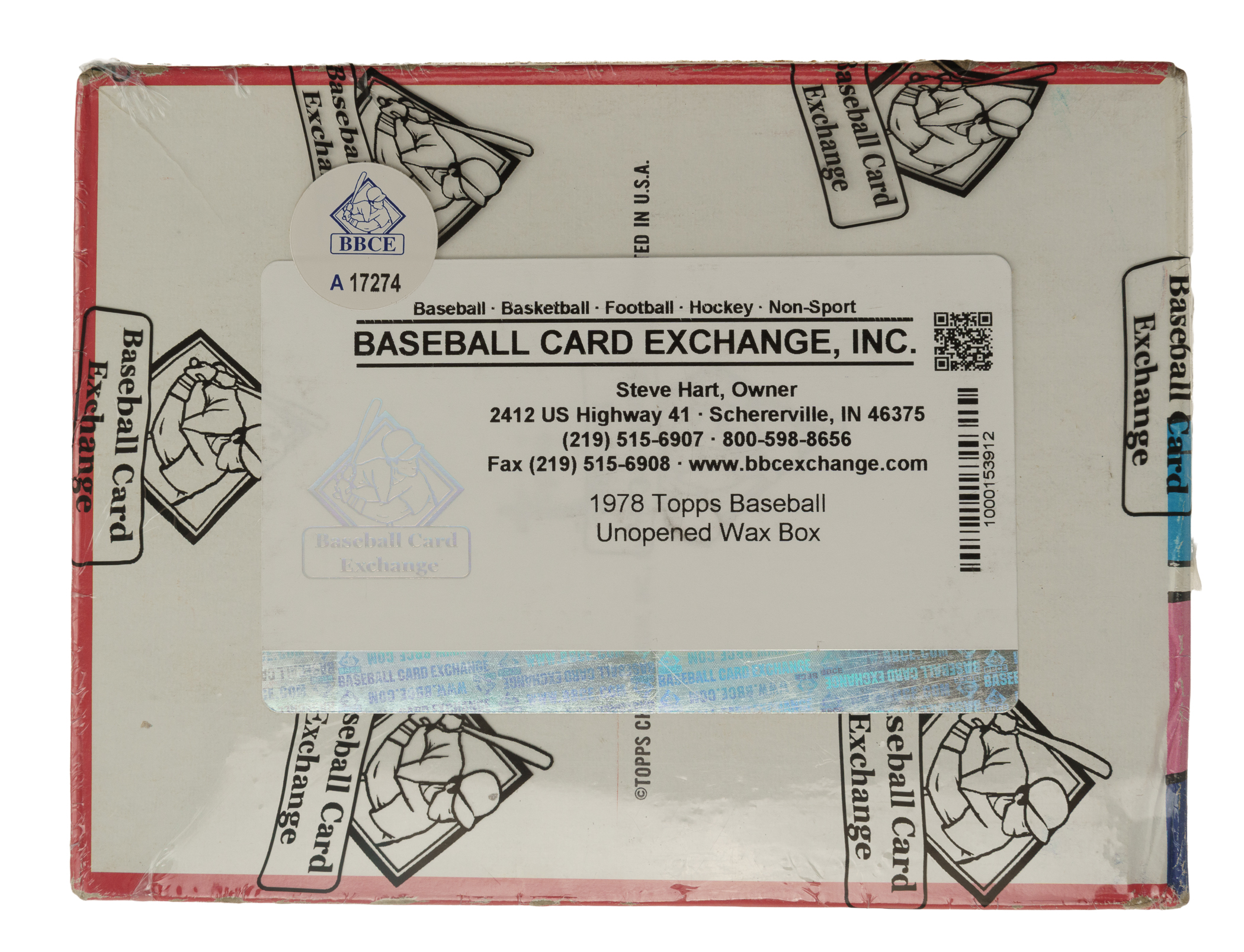 Complete, original unopened wax box of 1978 Topps baseball. The box houses 36 packs with each pack containing 10 cards for a total of 360 cards. The 1978 Topps set includes rookie cards of Eddie Murray and Paul Molitor, as well as cards of many other Hall of Famers, including Nolan Ryan, George Brett, and Robin Yount. This box comes shrink-wrapped by Baseball Card Exchange (owned by Steve Hart, the foremost expert on unopened material). The display box is bright and bold with light shelf wear.