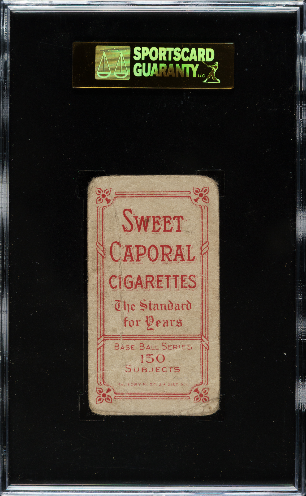 Modestly graded example of one of Detroit Tigers Hall of Famer Ty Cobb's classic cards from the legendary T206 set. The offered example has bright colors and excellent registration. Graded POOR 1 by SGC due to heavy creasing, rounded corners, and a few small spots of paper loss on the front.