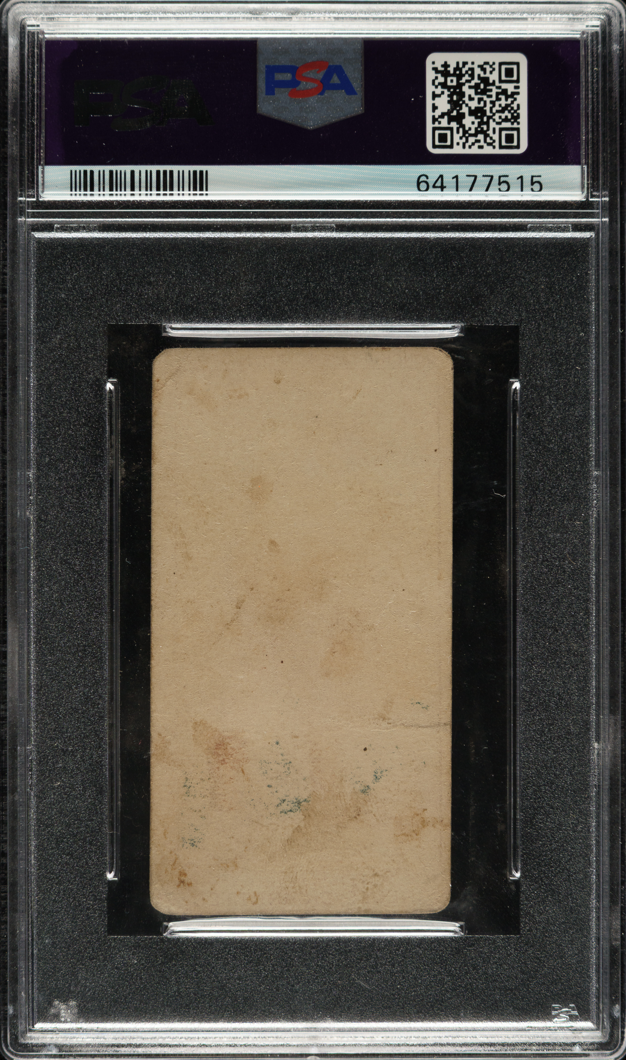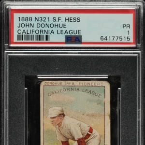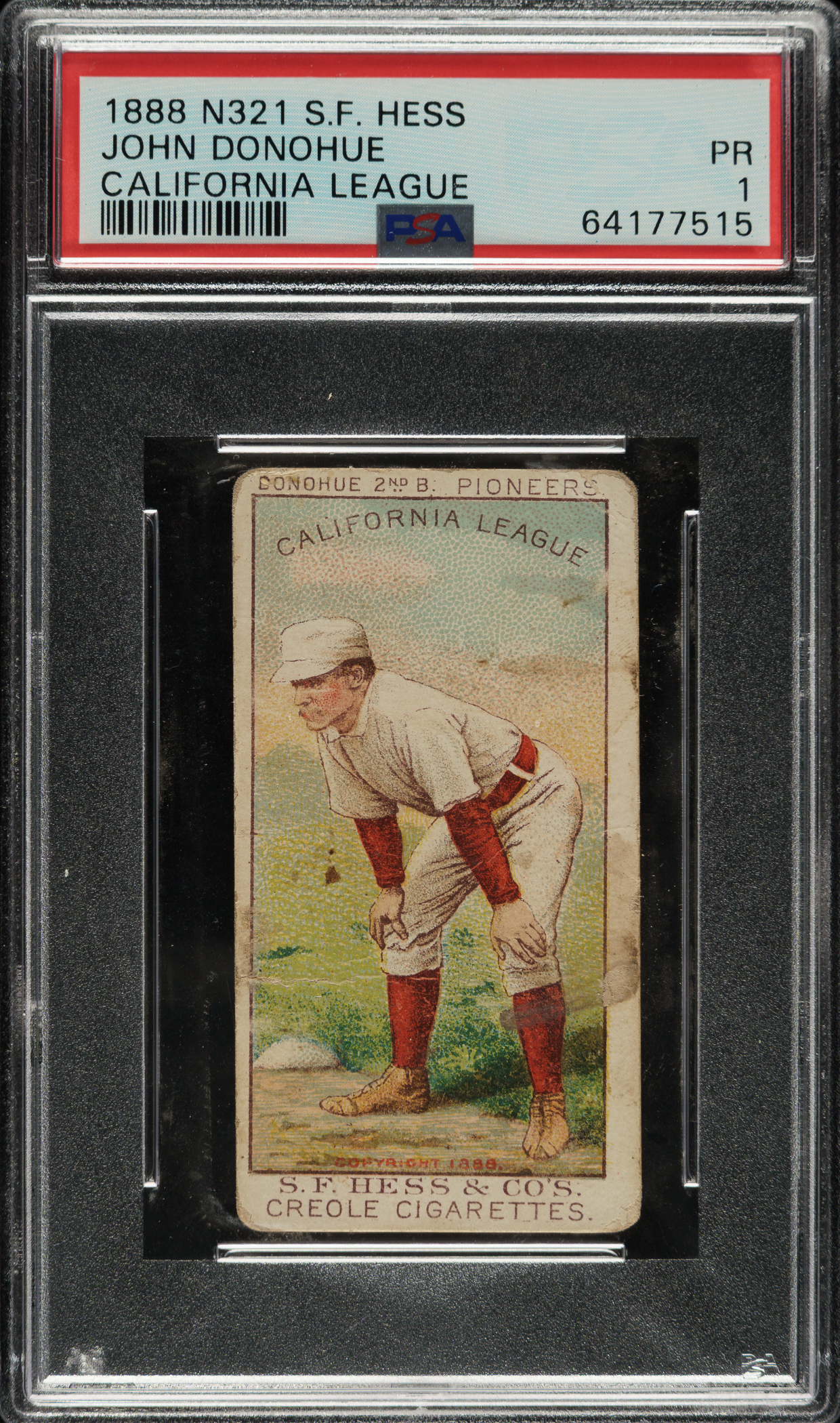 Extremely rare card of John Donohue from the N321 S. F. Hess California League series. Featuring full-color illustrations on the front, the forty-card N321 series depicts players from the California League and is one of the few color issues of the nineteenth century. The player name and position are printed along the top border, with California League arced over the player image and advertising for S. F. Hess & Co.'s. Creole Cigarettes along the bottom border. The offered card has vibrant colors and superb image quality. Graded POO1 by PSA flaws include scattered creasing, a spot of paper loss along the right border, and soiling on the reverse.