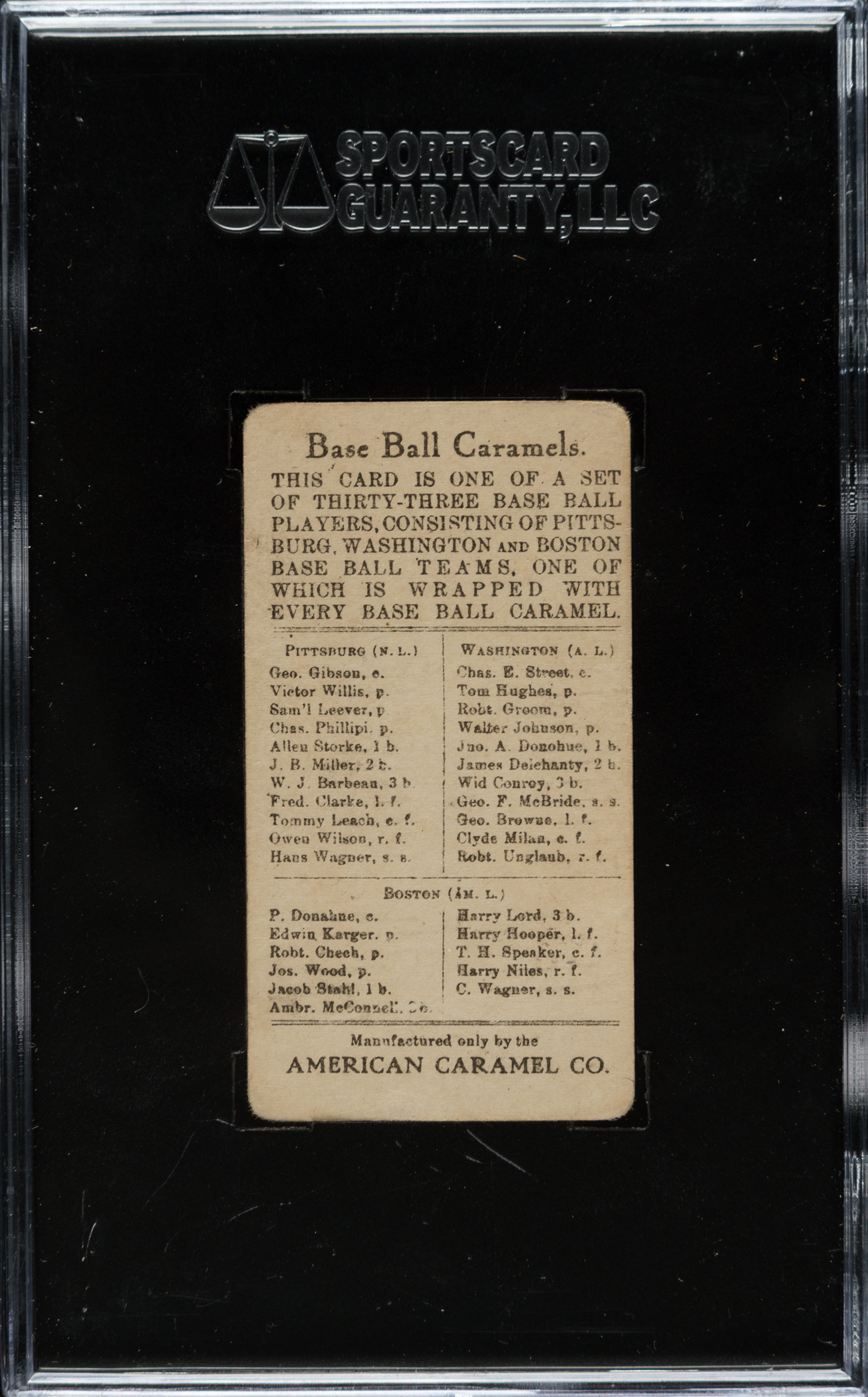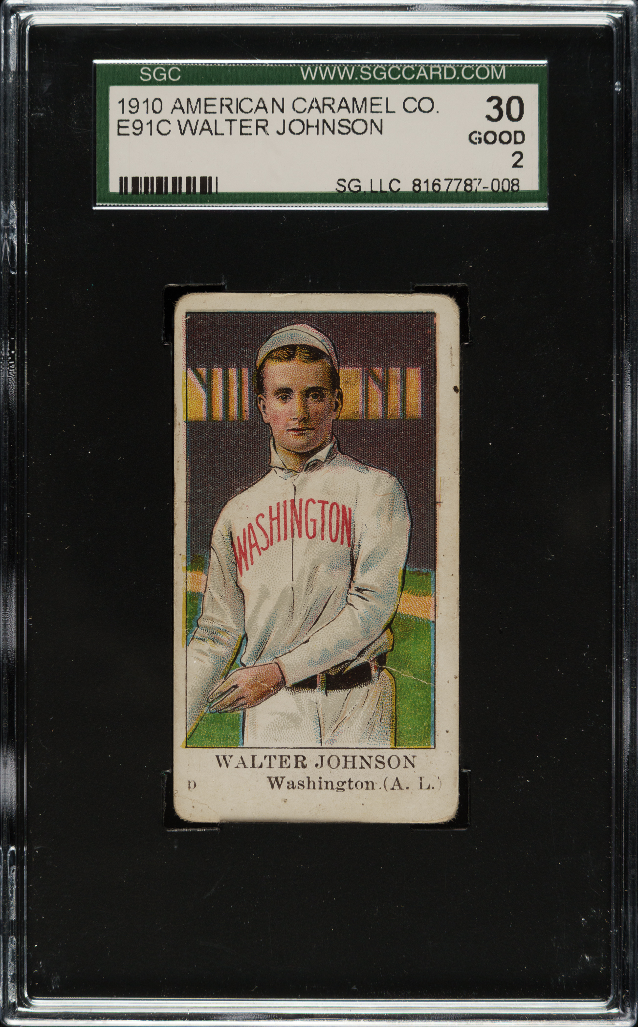 Graded GOOD 30 by SGC. Attractive example of Washington Senators Hall of Famer Walter Johnson from the 1910 E91-C American Caramel series. The E91 set is sometimes referred to as the "fake design" set because the company used generic illustrations, rather than actual likenesses, of ballplayers. Thus, the same drawing (with team change on the uniform) was used for two or three different players. Three series (A, B, and C) were issued for the E91 set. The offered example has vibrant colors, outstanding registration, and slightly rounded corners. The checklist reverse is boldly printed and clean. A few unobtrusive creases contribute to the the assigned grade. This is an appealing example of key card Walter Johnson from this interesting 1910-era caramel-card set.