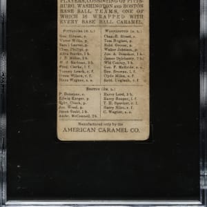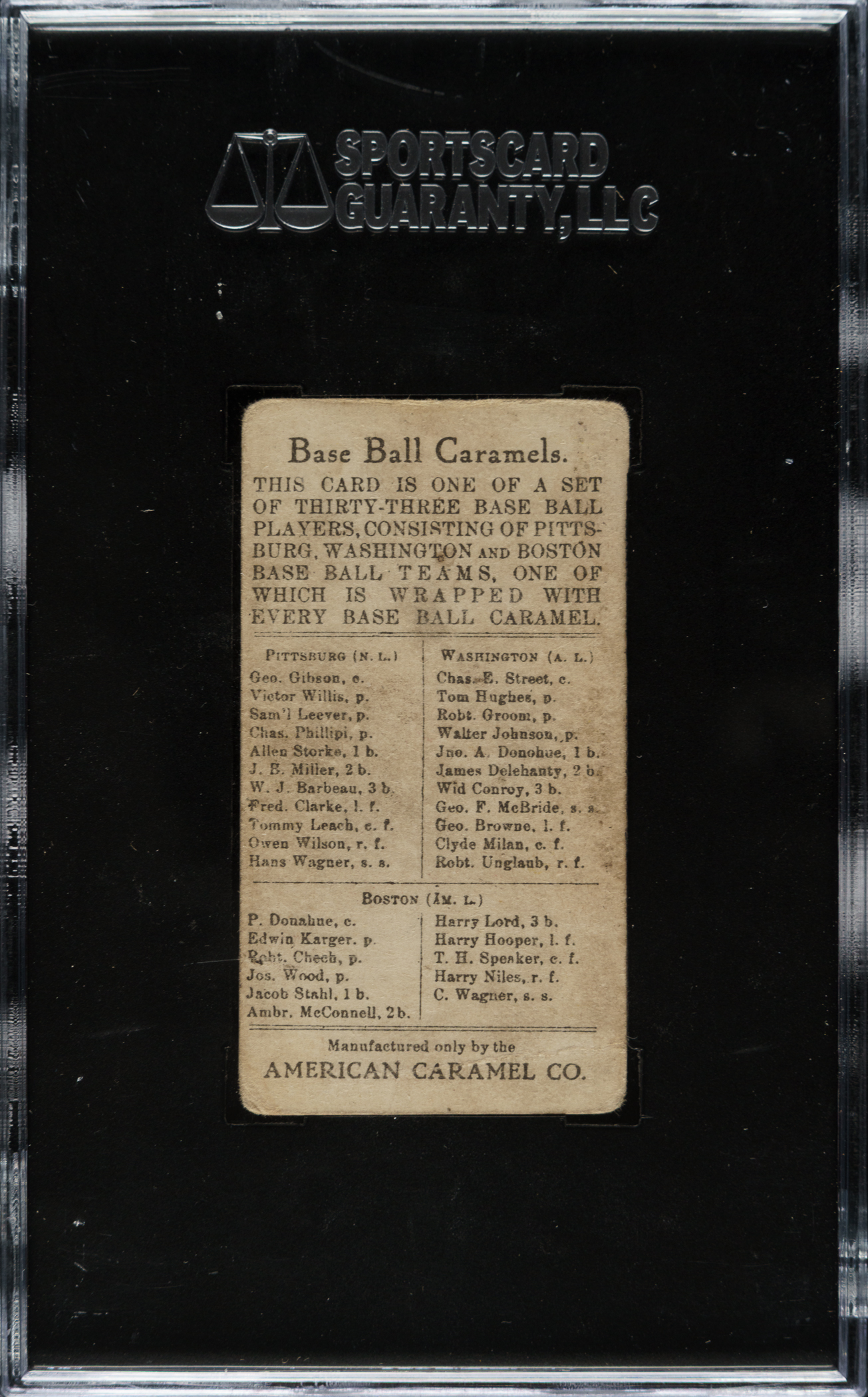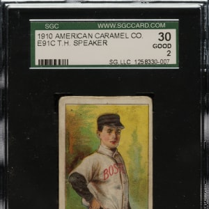 Graded GOOD 30 by SGC. Attractive example of Boston Red Sox Hall of Famer Tris Speaker from the 1910 E91-C American Caramel series. The E91 set is sometimes referred to as the "fake design" set because the company used generic illustrations, rather than actual likenesses, of ballplayers. Thus, the same drawing (with team change on the uniform) was used for two or three different players. Three series (A, B, and C) were issued for the E91 set. The offered example has vibrant colors, outstanding registration, and slightly rounded corners. A few unobtrusive creases and soiling along the checklist reverse factor into the assigned grade. This is a solid example of key card Tris Speaker from this interesting 1910-era caramel-card set.