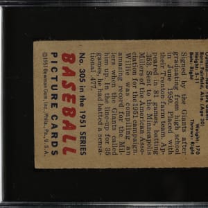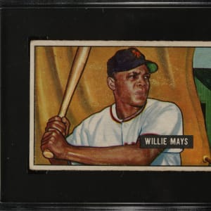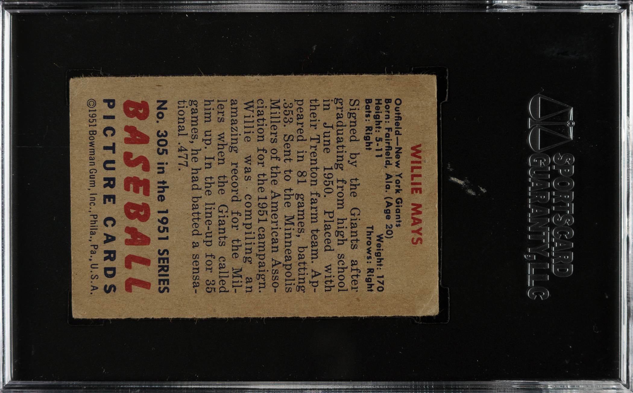 Graded VG/EX 50 by SGC. Mid-grade rookie card example of legendary New York Giants Hall of Famer Willie Mays, one of the most important of all 1950s cards. In addition to being one of the two key cards of the 1951 Bowman set, Mays is part of the scarce high-number series (#253-324). This well-centered card has bold colors, a crisp image, and even corner wear. The reverse is crisp and clean, without even the slightest trace of the gum or wax staining that so frequently affects 1951 Bowmans. Surface wear and a small surface indentation next to Mays' hands contribute to the assigned grade. The 1951 Bowman Willie Mays rookie has always been a card-collecting icon, especially among postwar cards. This is a solid mid-grade example of the 1951 Bowman Willie Mays rookie.