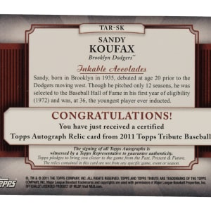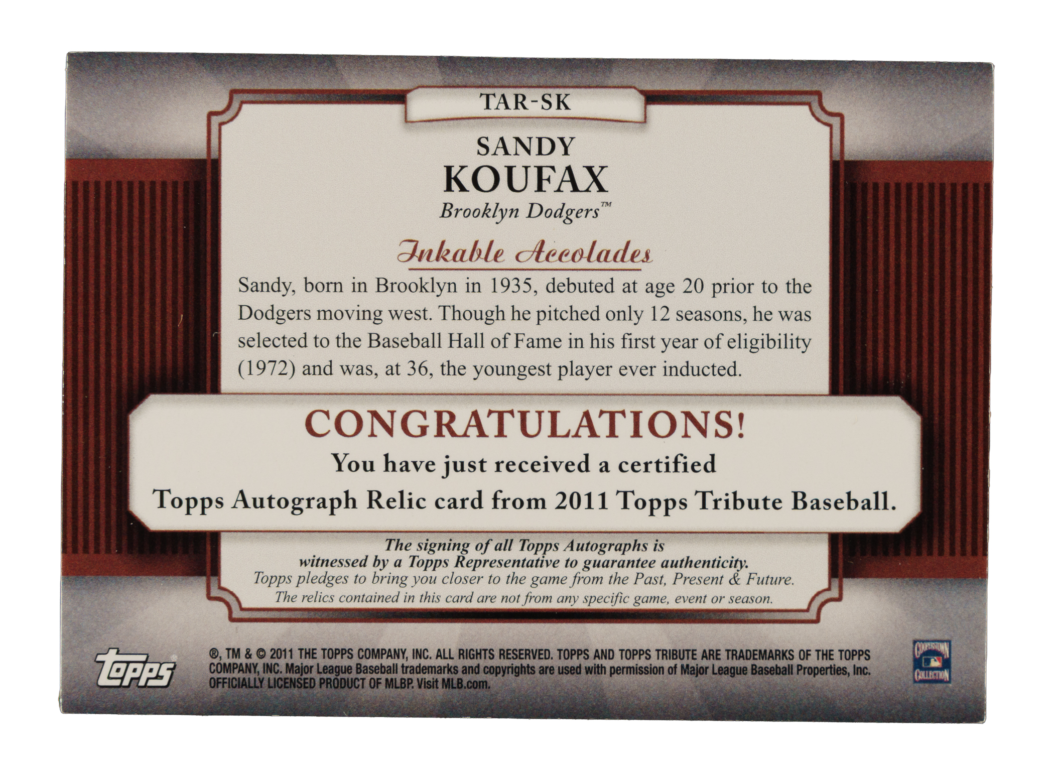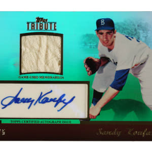 Brooklyn Dodgers Hall of Famer Sandy Koufax. The card has a surface indentation near the patch, but otherwise Ex-Mt condition.