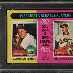 PSA/DNA has encapsulated the card and certified the signature as "Authentic." Los Angeles Dodgers Hall of Famer Sandy Koufax and New York Yankees star catcher Elston Howard.
