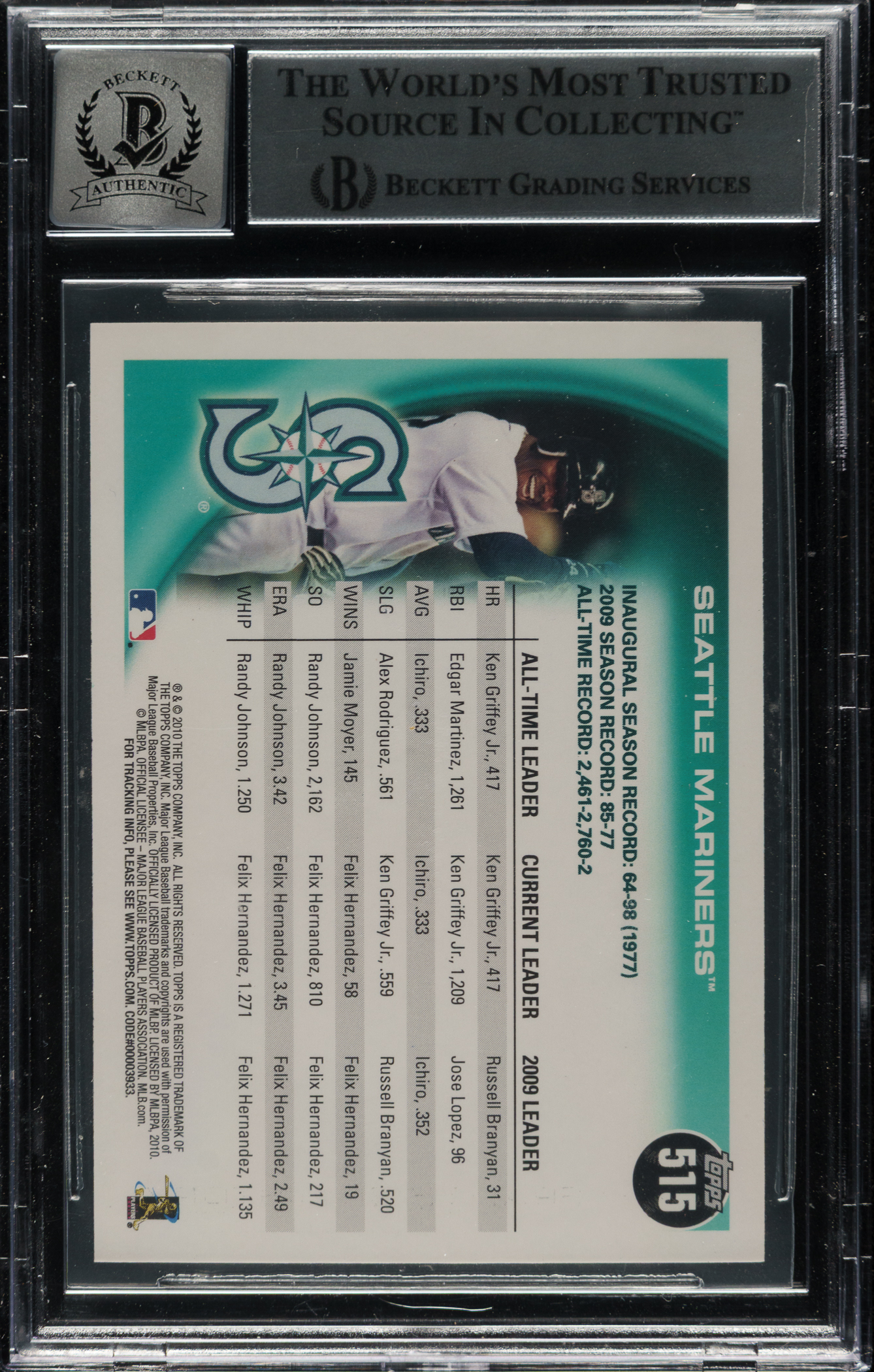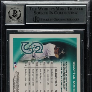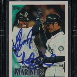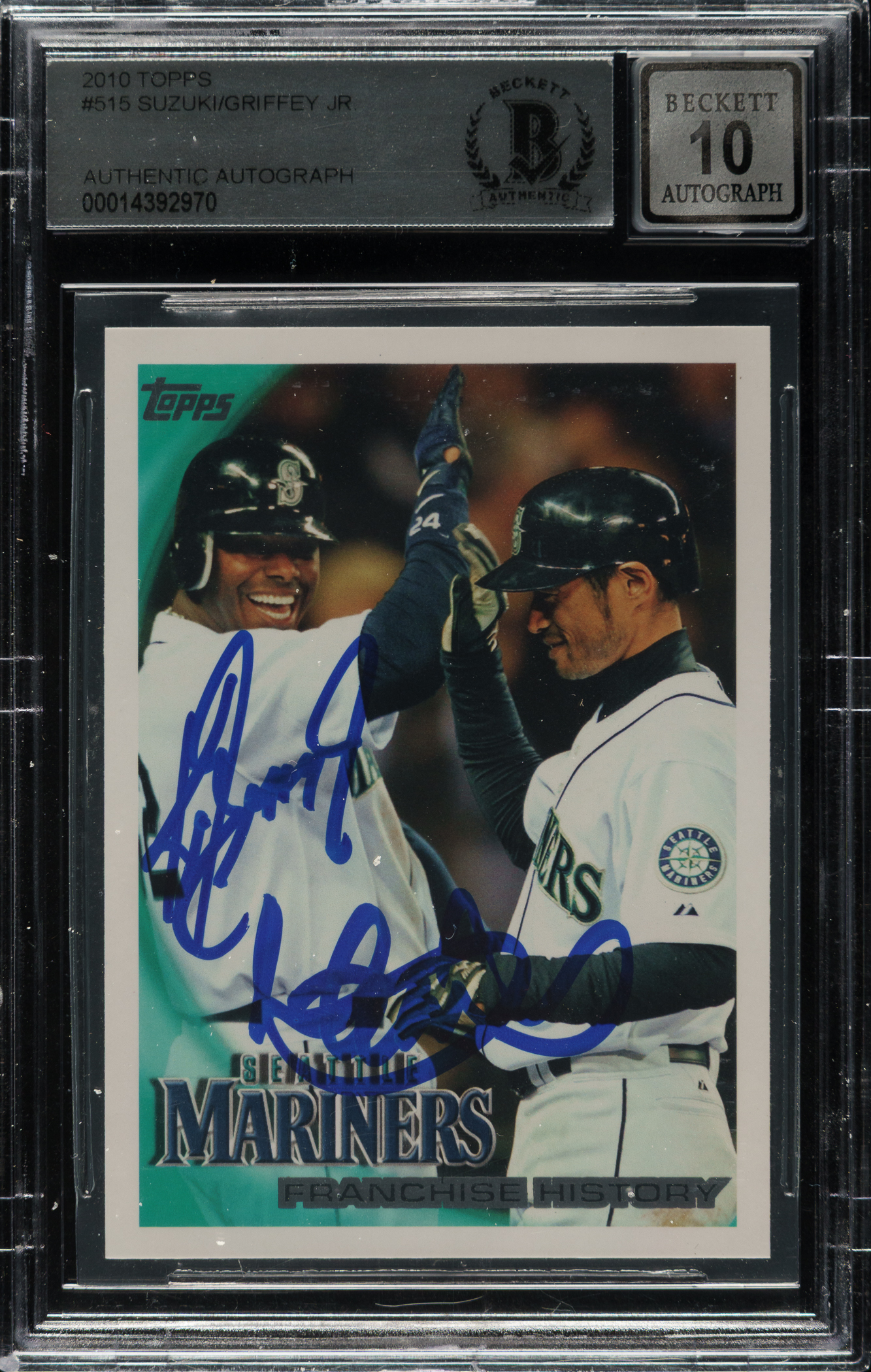 Beckett has encapsulated the card, grading the signatures GEM MINT 10. Seattle Mariners Hall of Famers Ken Griffey Jr. and Ichiro Suzuki.