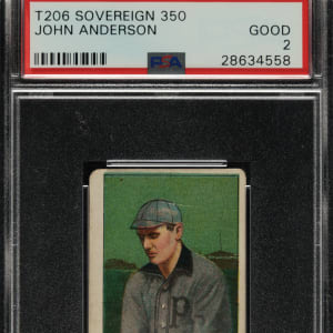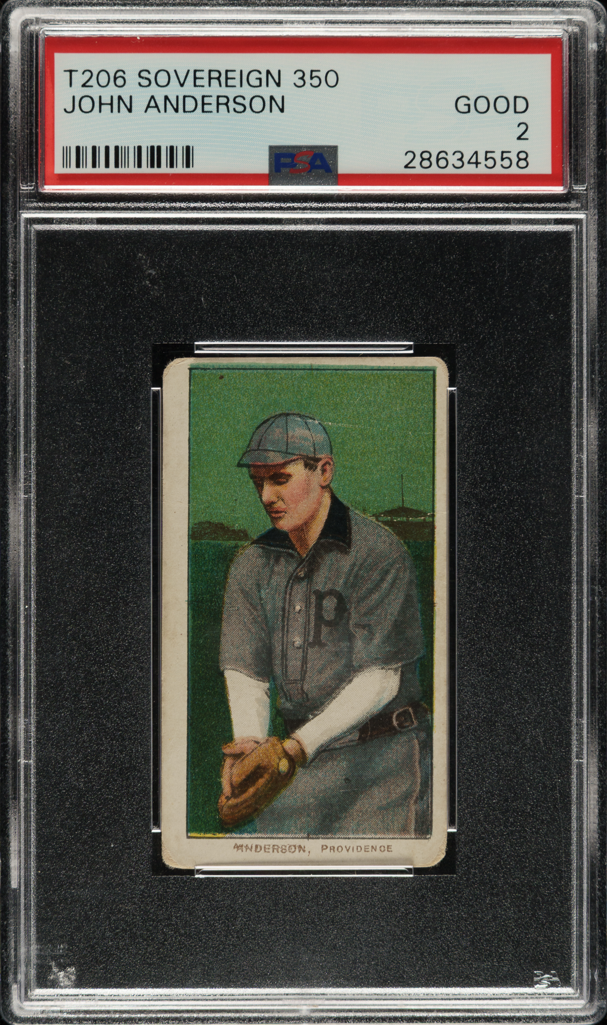 Graded GOOD 2 by PSA. Fascinating example of John Anderson (Providence Grays) from the legendary T206 White Border series with a Sovereign 350 back. This card is notable for a subtle printing anomaly on the front, which has resulted in Anderson's name being struck twice during the production process. The T206 set, affectionately known as "The Monster," is the most popular of all 1910-era sets and is still yielding new and exciting discoveries more than a century after its production. As collectors have become more sophisticated, there has been a growing appreciation for all great rarities and unusual cards associated with this landmark set. This is a noteworthy T206 printing error that we believe will be of great interest to T206 scholars and collectors.