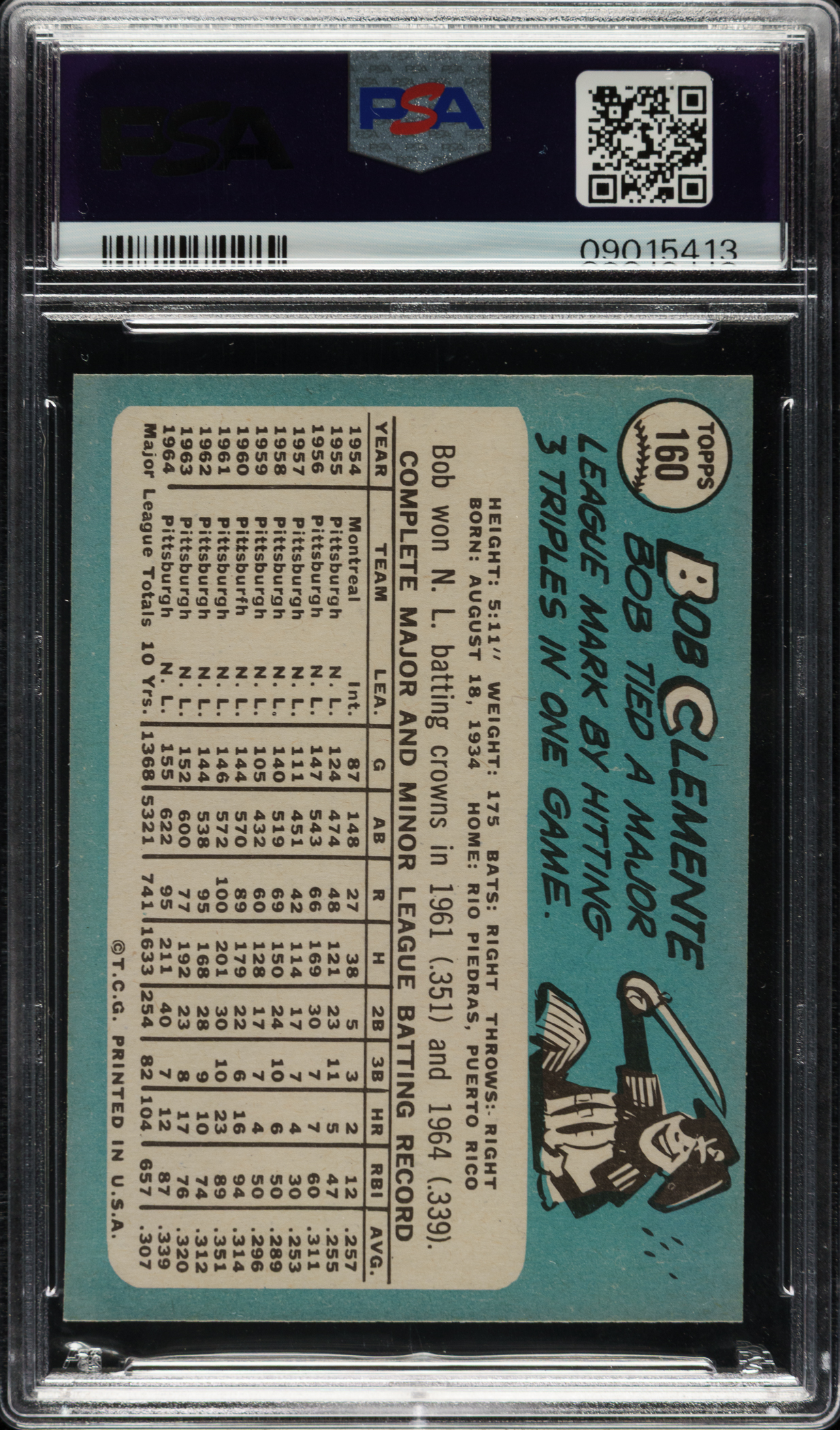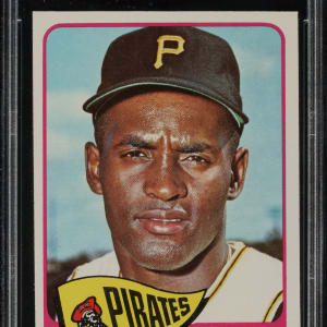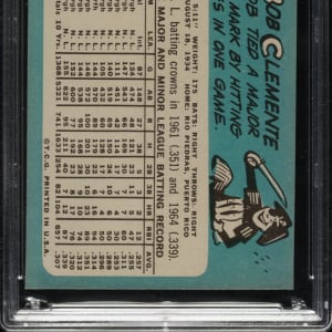 Graded MINT 9 by PSA. Highest-graded example! Ultra-high-grade example of Hall of Famer Roberto Clemente from the 1965 Topps set. One of the key cards in the set, this example is outstanding in every way. Exceptionally bright, crisp, and clean, with bold colors, four sharp corners, and outstanding image clarity. Clean reverse. This is a world-class example of one of Clemente's most popular cards, worthy of the finest 1965 Topps set or Clemente collection.