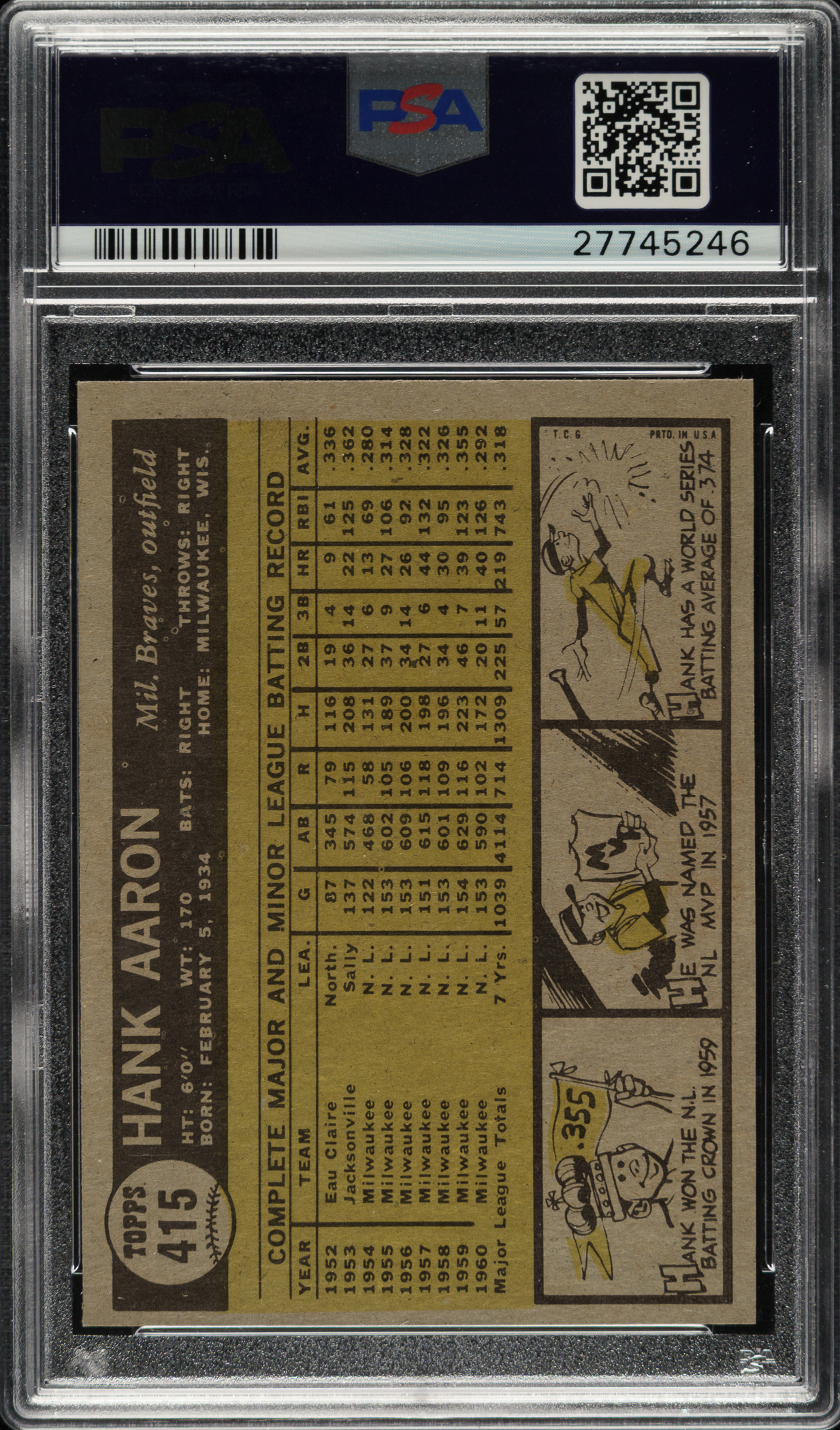 Graded MINT 9 by PSA. Highest-graded example! Tremendous example of Milwaukee Braves Hall of Famer Hank Aaron from the 1961 Topps set. This card boasts bold colors, outstanding image quality, and sharp corners. Clean reverse. This is an extraordinary MINT example that would be a stunning addition to any 1961 Topps, Hank Aaron, or Hall of Fame card collection.