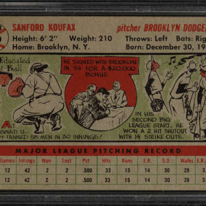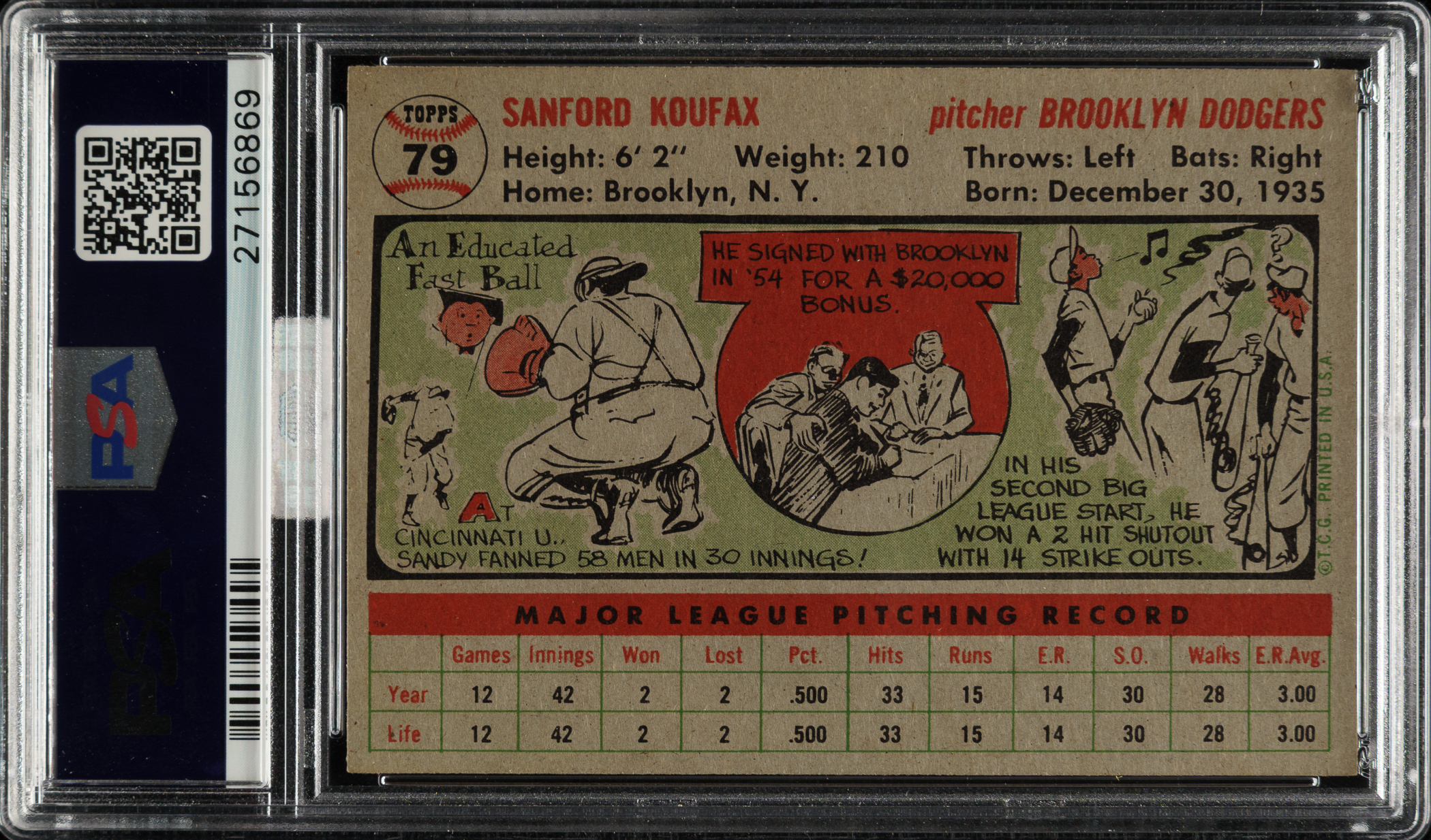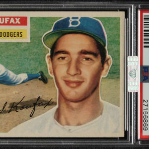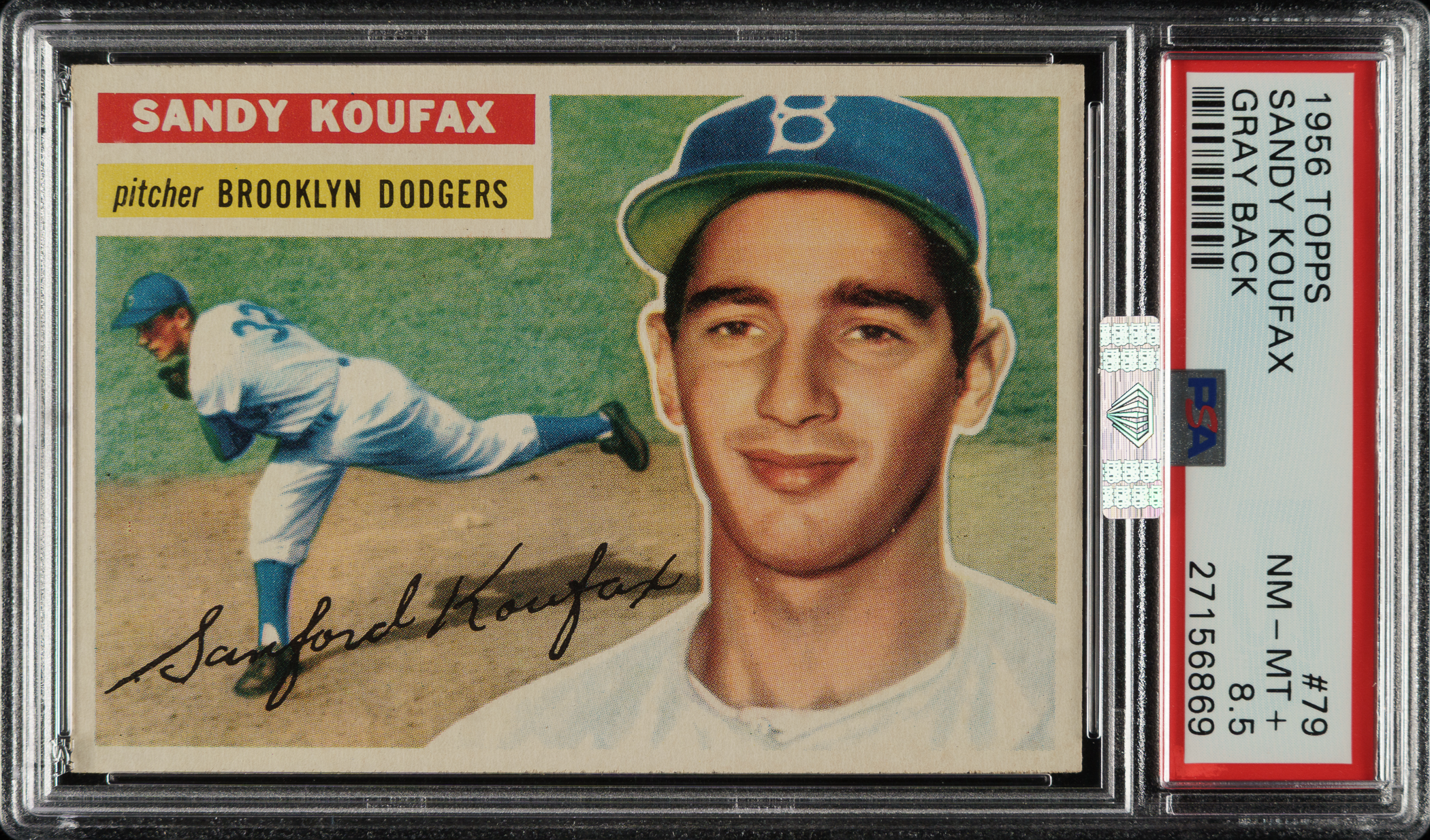 Graded NM-MT+ 8.5 by PSA. Outstanding high-grade example of Sandy Koufax from the classic 1956 Topps set featuring the Brooklyn Dodgers Hall of Famer in his second year in the Major Leagues. The offered example has vibrant colors, outstanding registration, strong corners, and excellent centering. The gray back is boldly printed and clean. This is a stunning high-grade example of one of Koufax’s most classic cards. Awarded an MBA Silver Diamond by Mike Baker Authenticated for high-end eye appeal. A corresponding MBA sticker is affixed to the front of the holder.