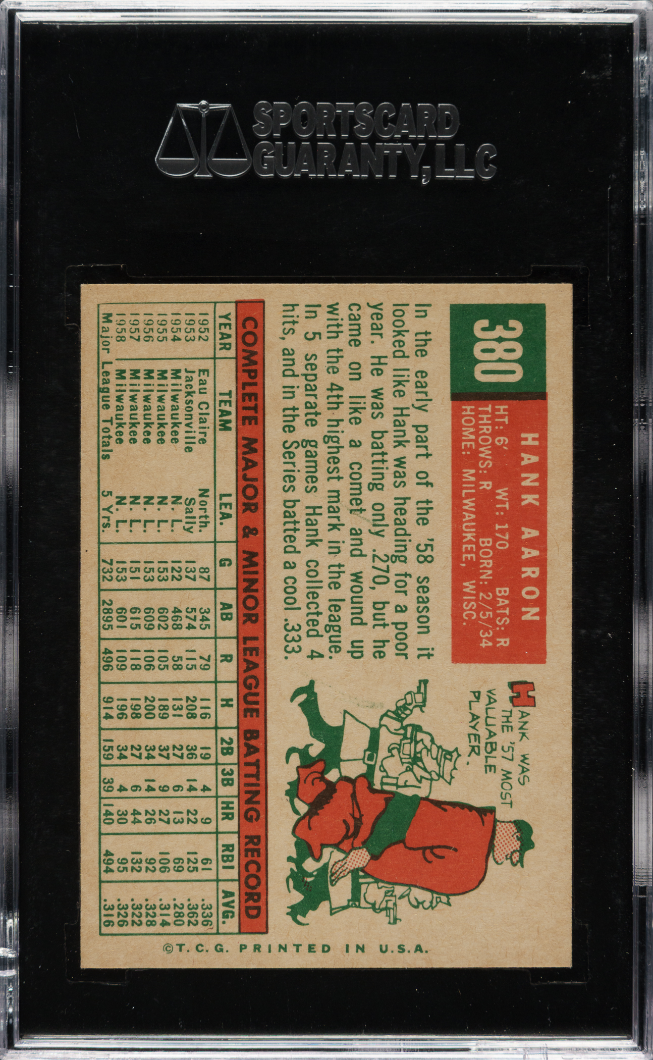 Graded MINT 9 by SGC. One of only two examples graded at this level by SGC with none higher! Ultra-high-grade example of Milwaukee Braves Hall of Famer Hank Aaron from the 1959 Topps set. This card has brilliant colors, exceptional gloss, sharp corners, and a clean reverse. 1959 Topps cards sometimes suffer from a variety of condition problems, including print defects, which make high-grade examples such as this particularly difficult to find. This is a world-class example of one of Aaron's most popular cards, worthy of the finest 1959 Topps set or Aaron collection. Awarded an MBA Gold Diamond by Mike Baker Authenticated for high-end eye appeal. A corresponding MBA sticker is affixed to the front of the holder.