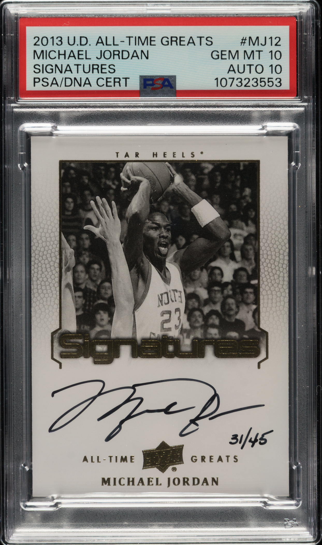 Stunning example of Michael Jordan as a member of the North Carolina Tarheels from the 2013-2014 Upper Deck All-Time Greats Signatures Basketball series. PSA/DNA has encapsulated the card, grading both the card and signature GEM MINT 10. Jordan signatures are known to be difficult to attain on any medium, especially cards. This is the first signed example of this card we have ever offered. Hand-numbered 31/45 on the front. A magnificent example of this scarce signed Jordan card!