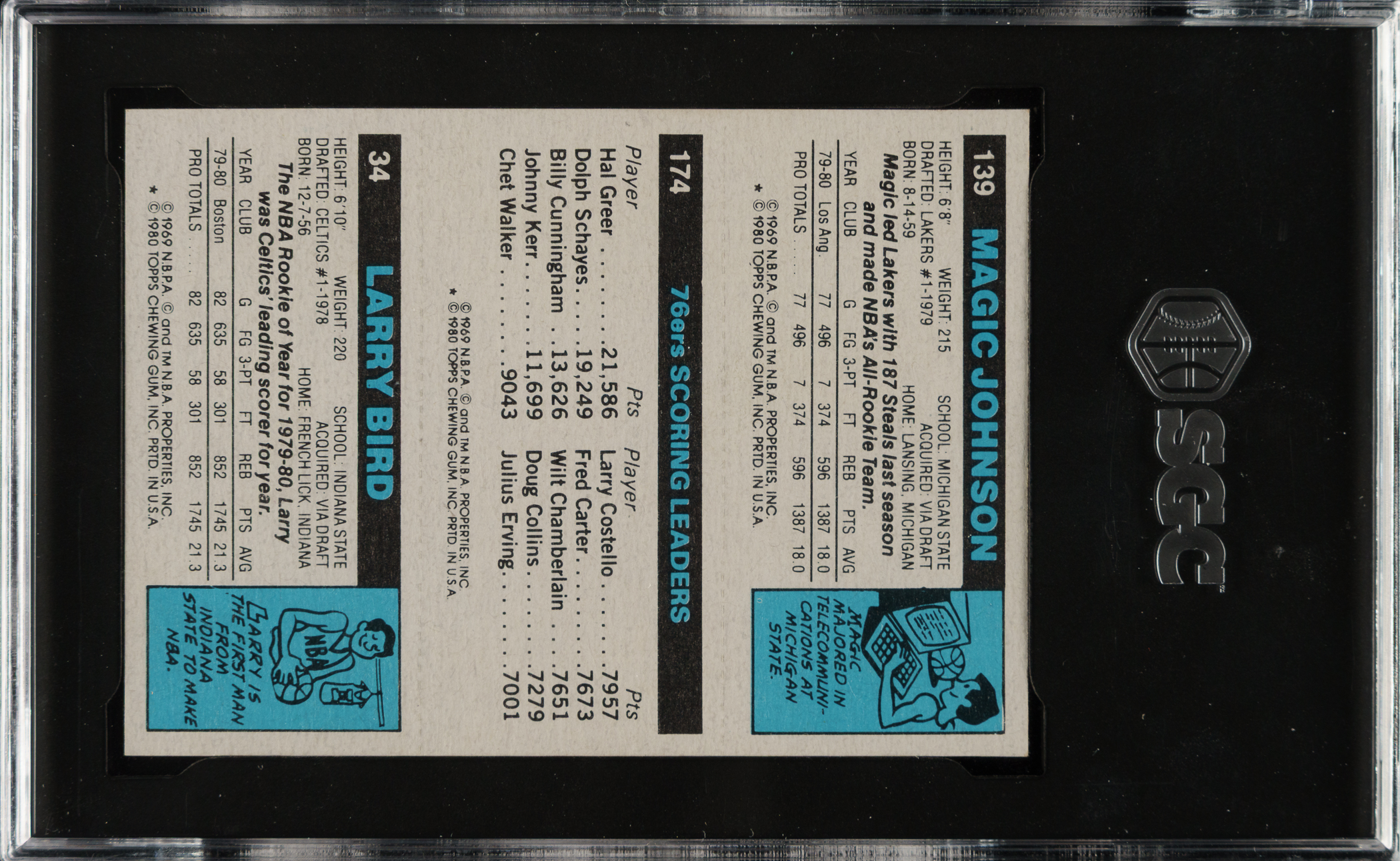 Graded MINT+ 9.5 by SGC. Tremendous ultra high-grade rookie card featuring Larry Bird and Magic Johnson from the 1980-1981 Topps basketball series. The card is bright and crisp with vibrant colors, sharp corners, outstanding registration, and impressive centering. Clean reverse. This is a fantastic ultra high-grade example of Larry Bird and Magic Johnson's rookie card, which is the key card from the set, and arguably the most significant basketball card in the hobby.