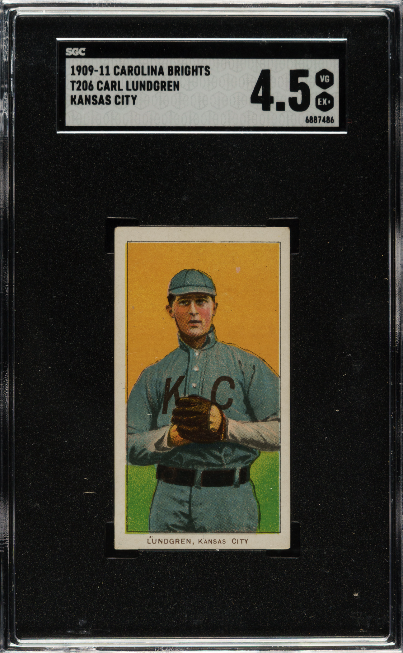 Graded VG/EX+ 4.5 by SGC. This is the ONLY example of this front/back combination graded at this level by SGC with just one higher. Tremendous example of Carl Lundgren (Kansas City Blues) from the T206 White Border set with a desirable Carolina Brights advertising reverse. According to T206Resource.com, Carolina Brights rank as the eleventh toughest back within the T206 set. This example has beautiful colors, a crisp image, and even corner wear. The important advertising reverse is boldly printed and clean.