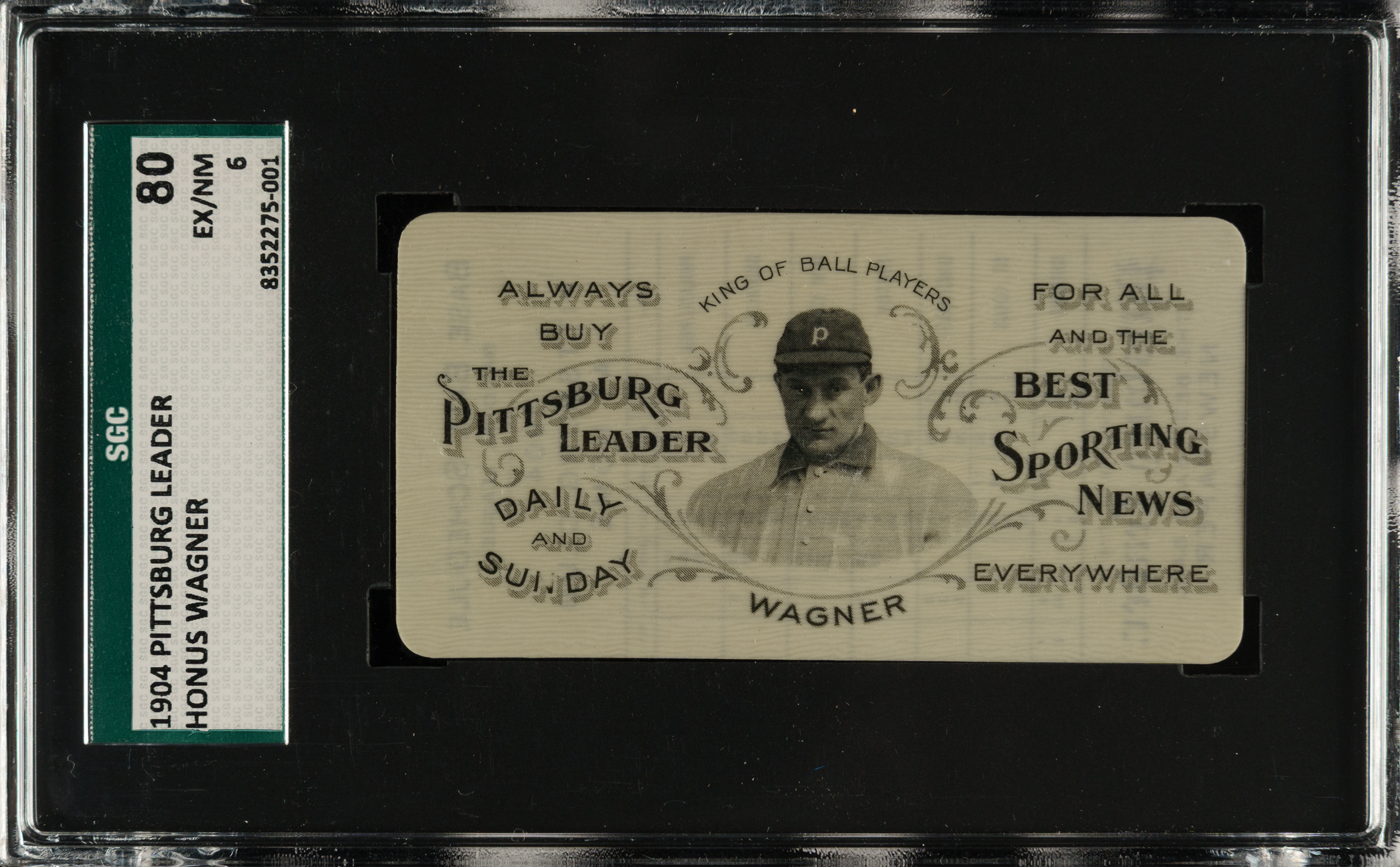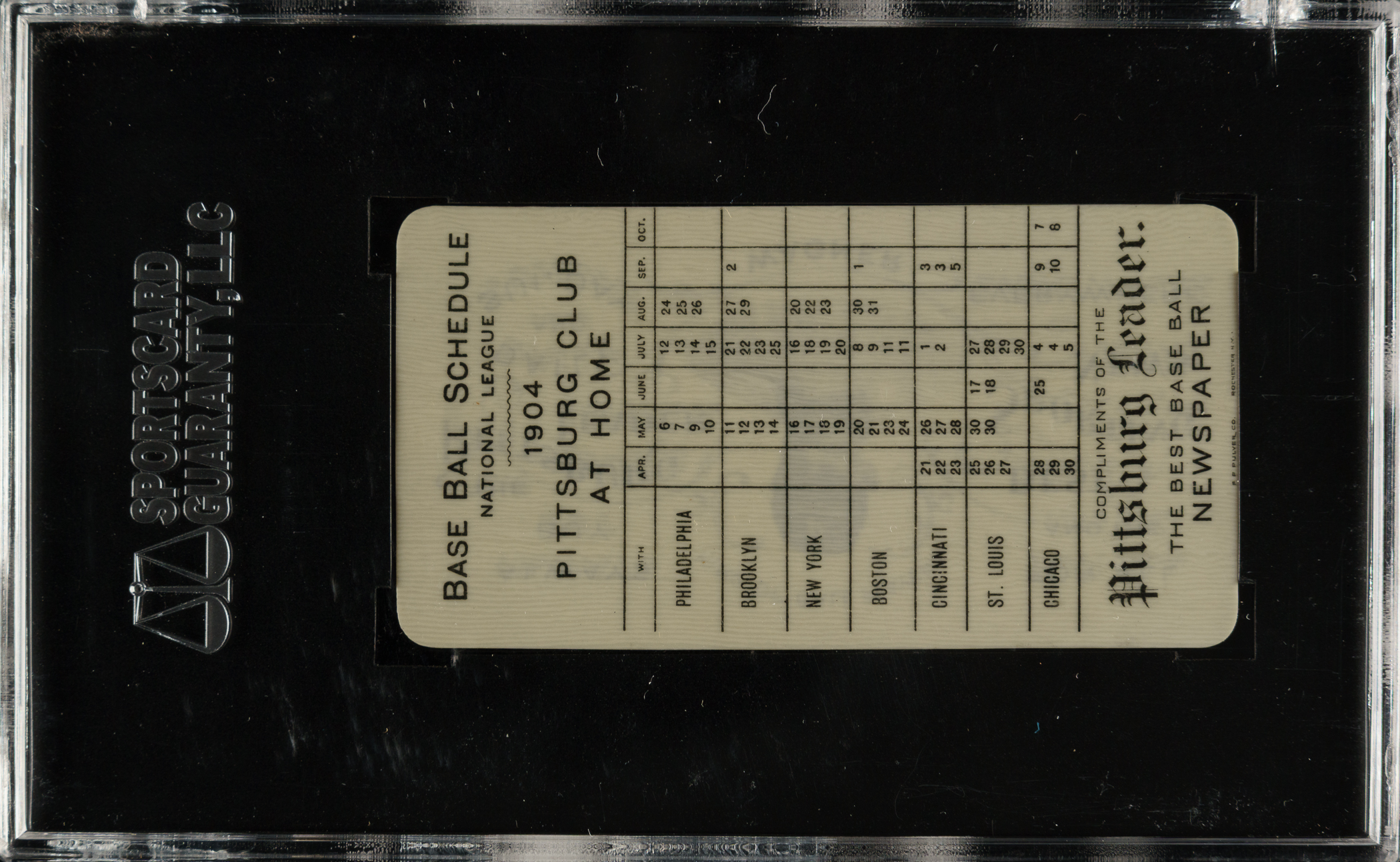 Graded EX/NM 80 by SGC. Extremely rare celluloid pocket schedule card issued by The Pittsburg Leader newspaper featuring a portrait of Honus Wagner, identified as "The King of Ball Players," surrounded by advertising on the front ("Always Buy The Pittsburg Leader Daily And Sunday - For All And The Best Sporting News Everywhere"), with the complete 1904 schedule for Pittsburg's home games and additional advertising on the reverse ("Compliments of The Pittsburg Leader. The Best Base Ball Newspaper"). Essentially a one-card set printed on celluloid, this is one of the most interesting, substantial, and classic of all early Honus Wagner items. This is an item that fits into many collecting categories. It is a card issued to promote a newspaper, but is not part of a traditional set. It is a schedule. It is, of course, a Honus Wagner item. Being made of celluloid, it is also highly prized by button collectors. In fact, the portrait image on this piece is the very same as the Honus Wagner "Our Protection Against Loss" insurance company advertising pinback, also dating from 1904, which is one of pinback collecting's most desirable and legendary rarities (only four are known). The offered example remains in exceptional condition with minimal handling wear. One of our favorite early 20th century baseball advertising items, this schedule would be a significant addition to any world-class Honus Wagner or vintage baseball collection. Dimensions: 3.25 x 1.75 inches.