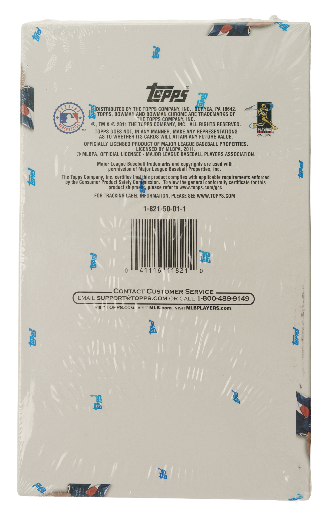 Presented is an unopened 2011 Bowman Chrome hobby box containing 18 packs and four cards per pack for a total of 72 cards. The box is wrapped in its original factory cellophane. According to Bowman's production information, there is one autographed prospect card in every box. This is an outstanding opportunity to acquire an unopened hobby box of this desirable modern baseball-card issue.