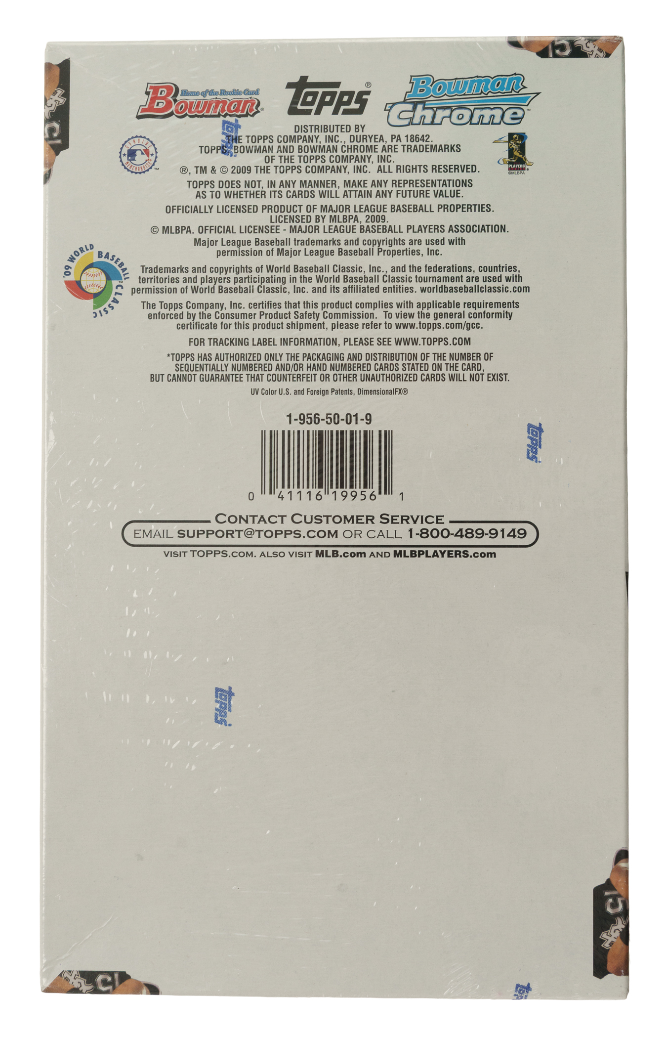 Presented is an unopened 2009 Bowman Draft Picks & Prospects Baseball hobby box containing 24 packs and seven cards per pack for a total of 168 cards. The box is wrapped in its original factory cellophane. Hobby boxes are preferable to retail boxes as they offer more favorable insert distribution. The set is highlighted by the rookie card of Mike Trout. According to Bowman's production information, there is one Bowman Chrome autographed prospect card per box. This is an outstanding opportunity to acquire an unopened hobby box of this desirable modern baseball card issue.