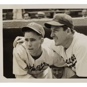 Vintage news photo of Pee Wee Reese and Joe Medwick as members of the Brooklyn Dodgers, circa 1940. Medwick is captured advising his young teammate. The reverse displays an "ACME Newspictures" credit stamp, the original paper news caption, and a "Jun 25 1940" date stamp. The photo (6 x 8 inches) is in Excellent condition overall.