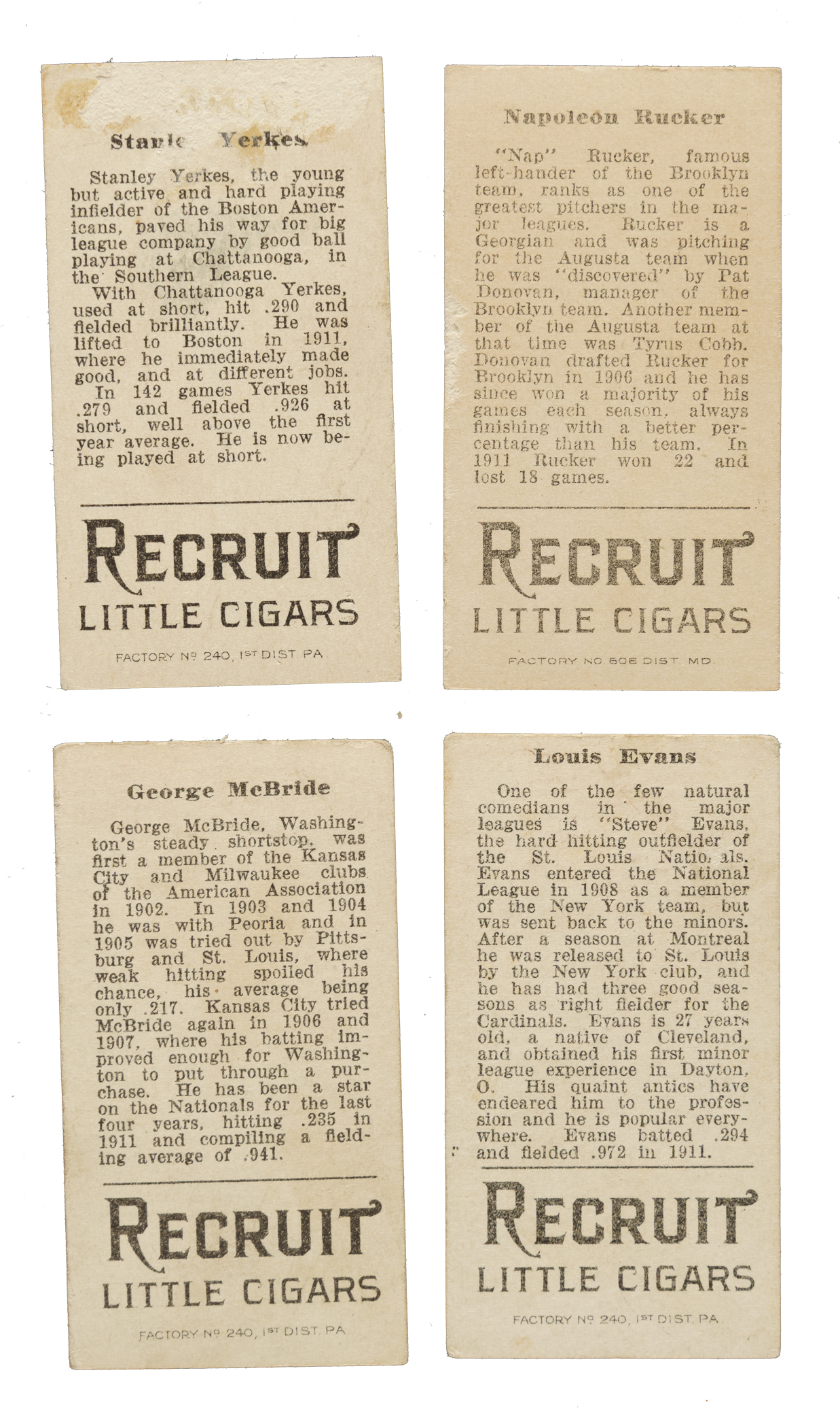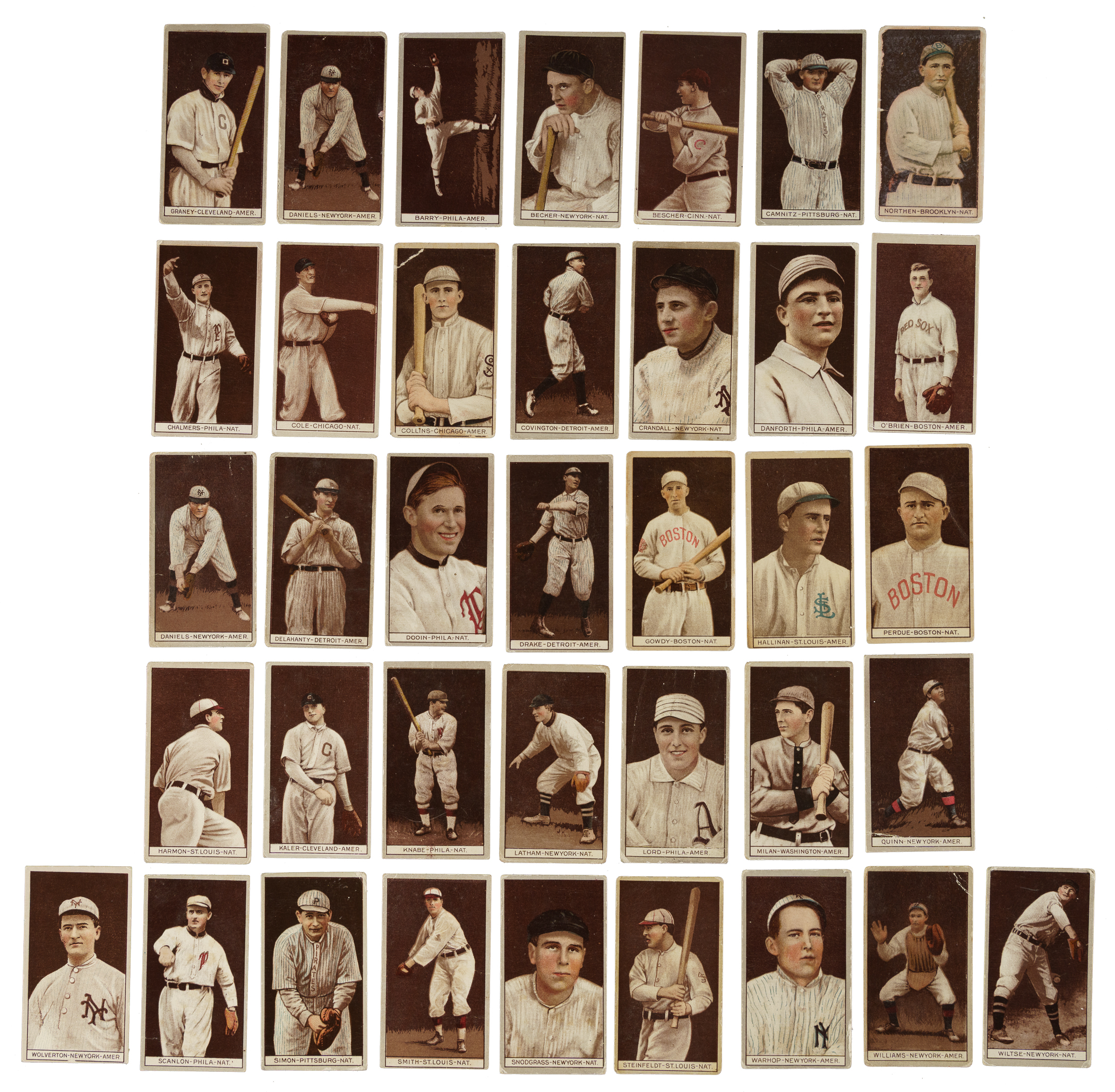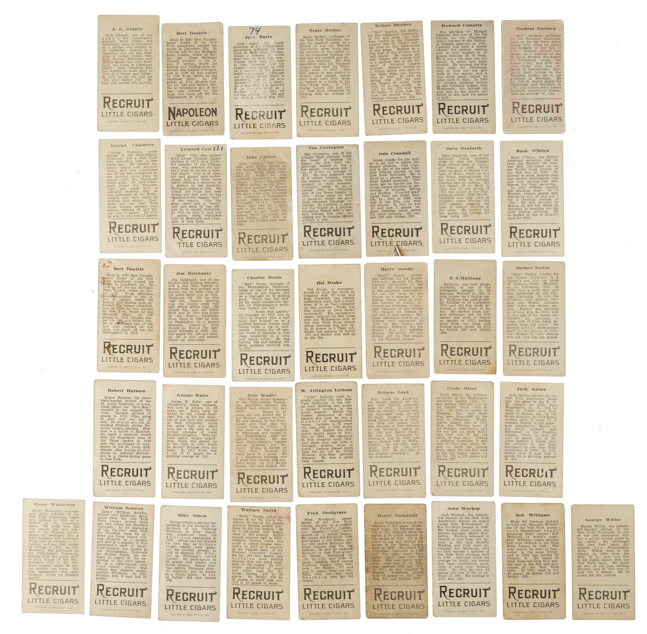 Collection of 40 different T207 Brown Background cards (plus one duplicate), all with a Recruit Little Cigars advertisement except for one Napoleon (as noted). Condition is 68% Gd to Vg and 32% Pr to Fr (including two trimmed). This collection consists of the following: Barry, Becker, Bescher, Camnitz, Chalmers, Cole, Collins, Covington, Crandall, Danforth, Daniels (Recruit back), Daniels (Napoleon back, trimmed, otherwise Fr), Delahanty, Dooin, Drake, Evans, Gowdy, Graney (Vg), Hallinan, Harmon, Kaler, Knabe, Latham, B. Lord, McBride, Milan, Northern, O'Brien, Perdue, Quinn, Rucker, Scanlon, Simon, W. Smith, Snodgrass, Steinfeldt, Warhop, Williams, Wiltse, Wolverton, and Yerkes. This is a very pleasing medium- to lower-graded grouping from the popular T207 Brown Background series. Total: 41 cards.