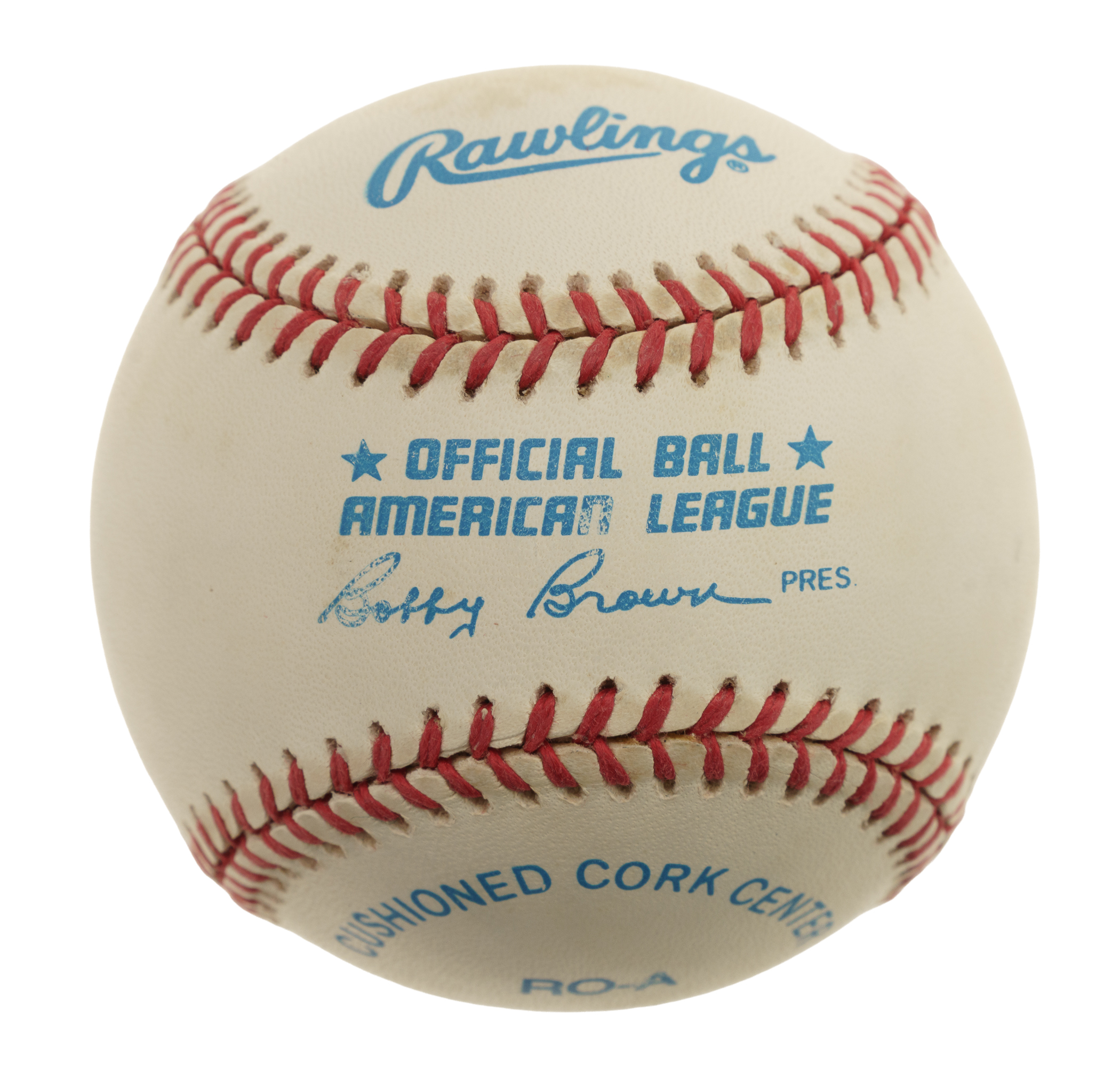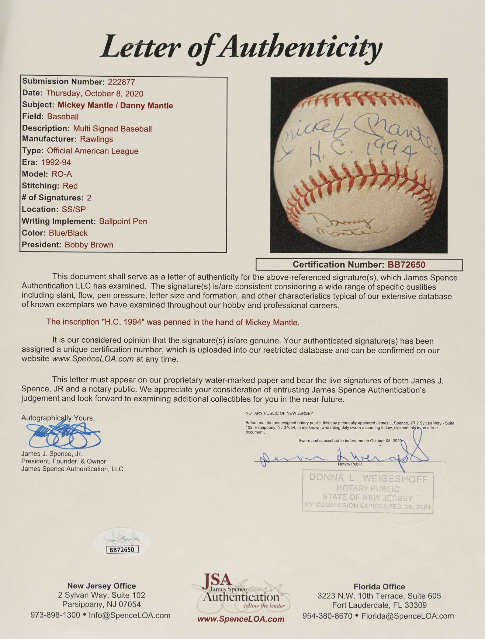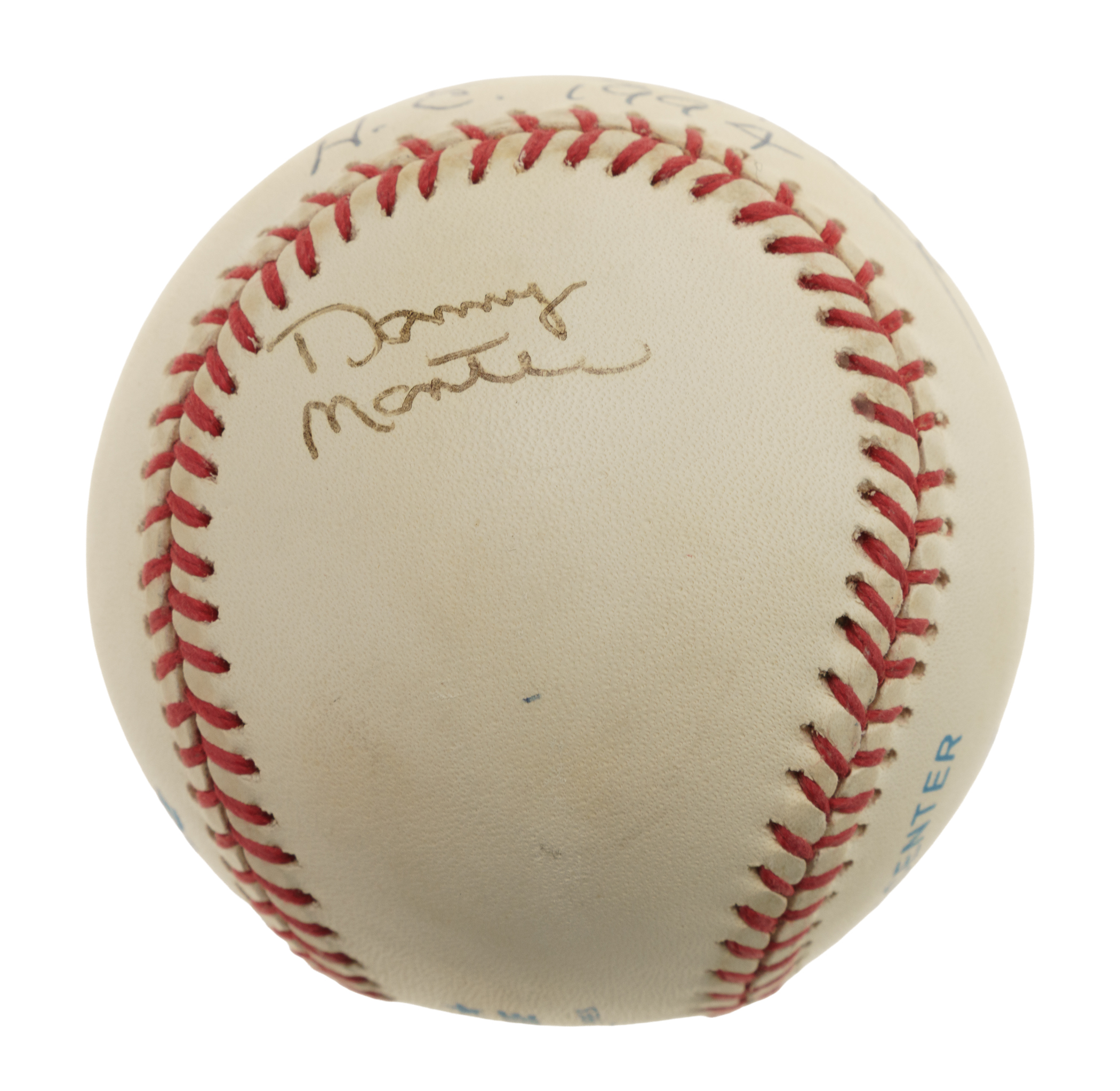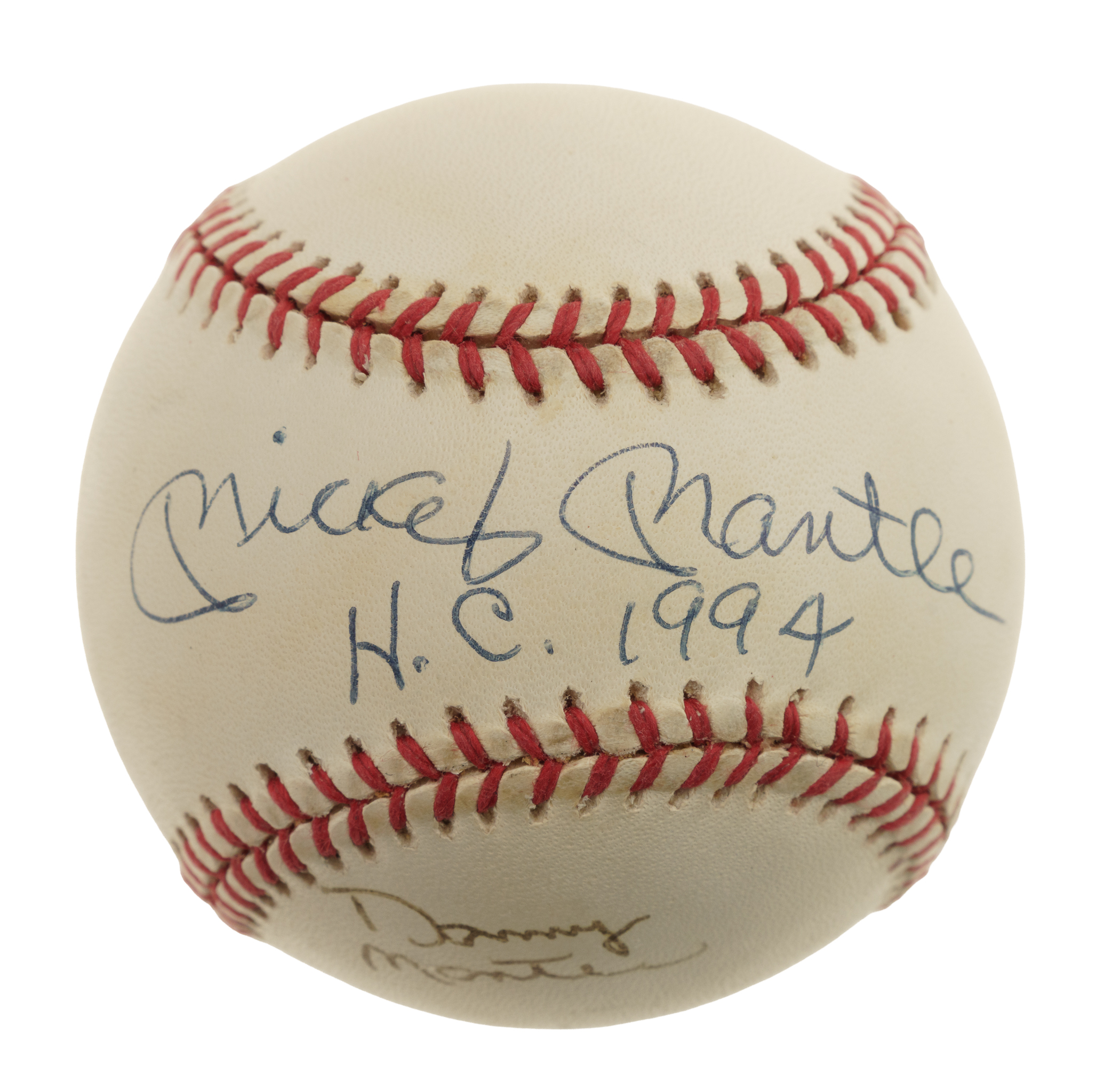 Official American League baseball (Brown) signed in blue ink by Mickey Mantle and his son, Danny. Mickey's blue ink signature occupies the sweet spot, while Danny's black ink signature appears on the side panel below. Mickey has added a "H.C. 1994" inscription below his signature. Mantle was a member of the Harbor Club on Lake Oconee in Greensboro, Georgia, during the final years of his life. The ball displays scattered spots of moderate toning but is otherwise in Near Mint condition overall.