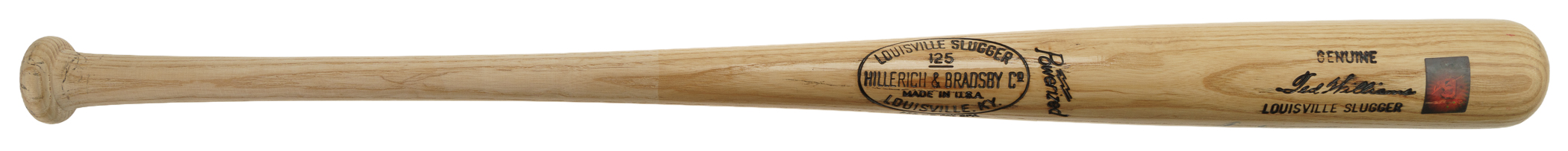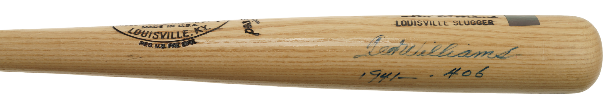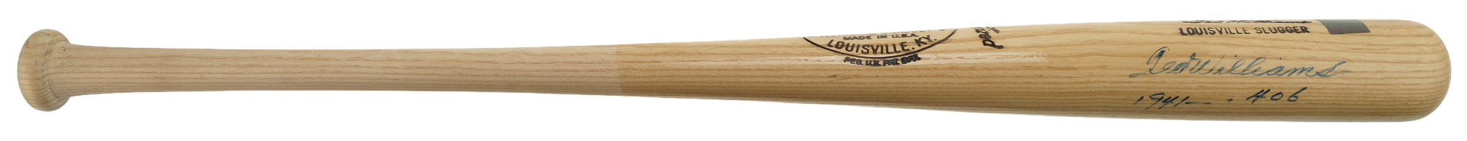 Extremely desirable full-size baseball bat signed by Boston Red Sox Hall of Famer Ted Williams. Williams has scripted his name in blue directly below the barrel stamping. He has added the special inscription "1941 - .406" below his signature. Louisville Slugger model 125. A "Green Diamond" hologram label is affixed to the barrel (Green Diamond was Williams' personal marketing company). A certification sticker from James Spence/JSA is affixed to the knob. The size/weight of this item requires that there will be an additional shipping charge for this lot.