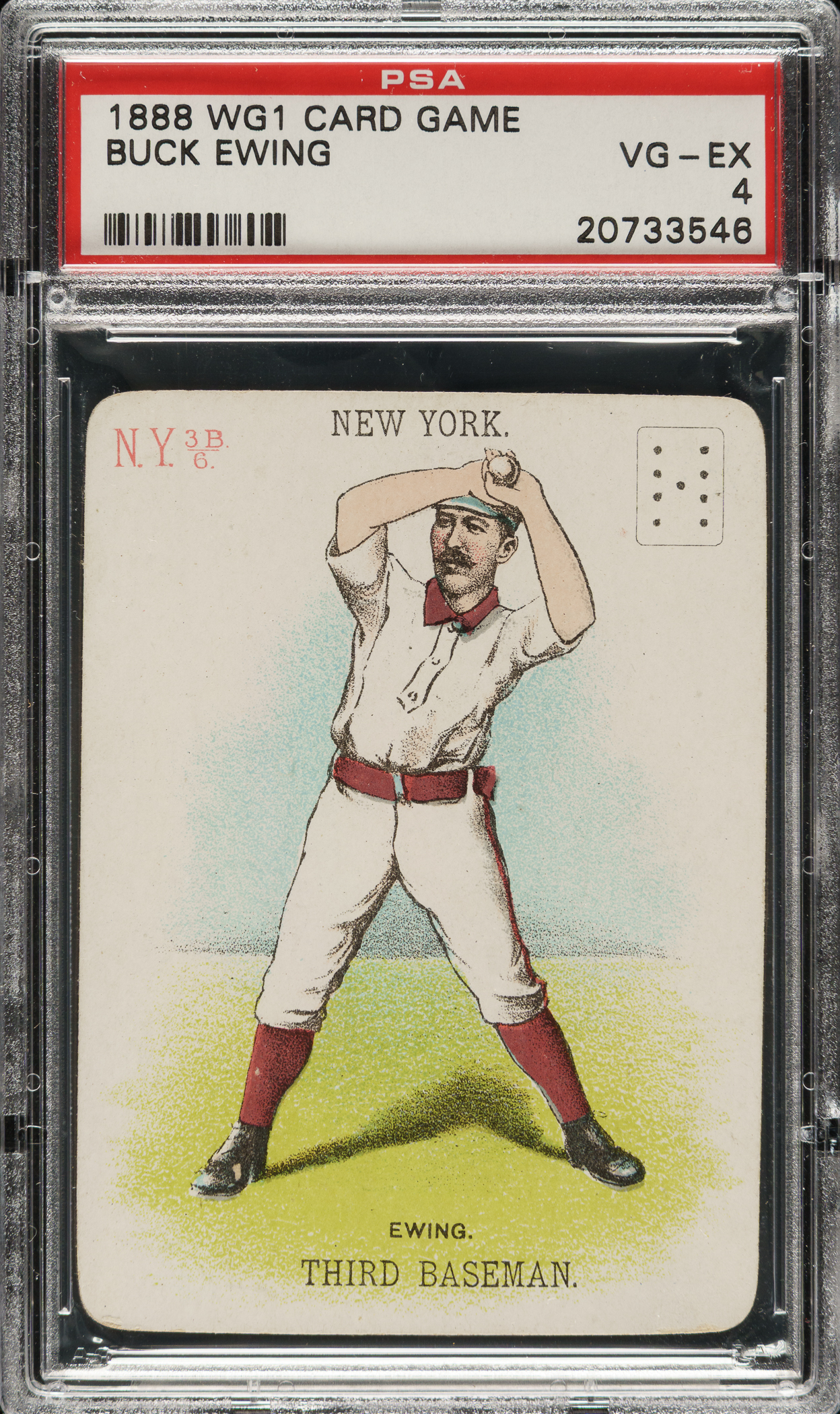 Graded VG-EX 4 by PSA. One of only two examples graded at this level by PSA with just two higher. Outstanding mid-grade example from the WG1 Playing Cards set featuring Hall of Famer Buck Ewing. This is an exceptional key card from this rare set issued in 1888. The WG1 Playing Card set is one of the few 19th century sets printed in color. While this set has not received as much attention as many other pre-1900 issues, possibly because it is not a tobacco issue, it is a very rare set, far rarer than many of the most popular issues of the 1880s such as N28 and N29 Allen & Ginter. The offered card is bright, crisp, and clean, with minor edge and corner wear visible, and a small touch of paper loss on the blue reverse. This is an exceptional Hall of Fame example worthy of any high-quality WG1, Hall of Fame, or type-card collection.