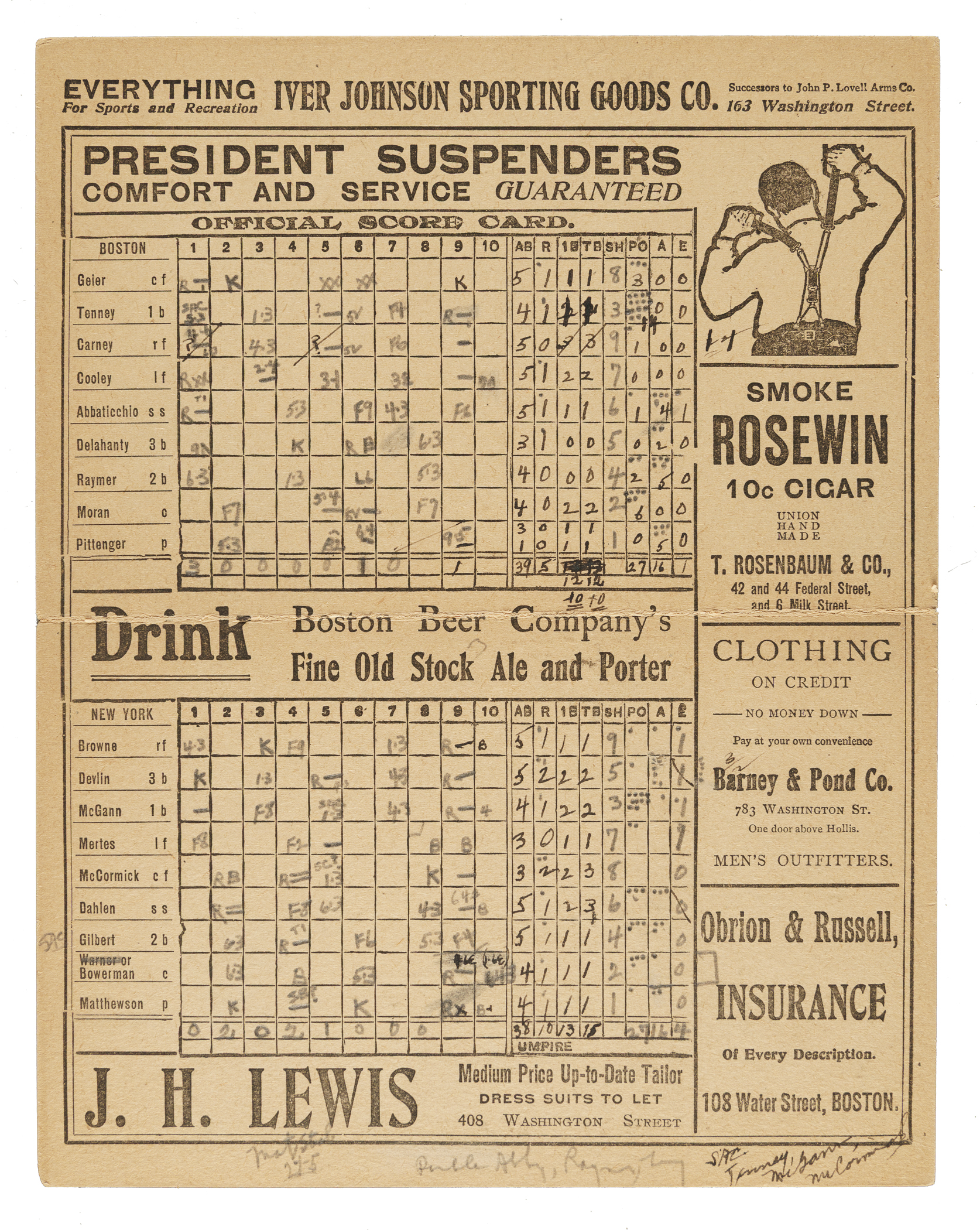 Rare 1904 Boston Beaneaters fold-over scorecard issued for a game against the New York Giants. The preprinted lineups include McGann, Devlin, Mathewson, and Dahlen for New York, and Tenney, Abbaticchio, Delahanty and Moran for Boston. Neatly scored in both ink and pencil to record a 10-5 win by New York. Although the scorecard is not dated, research indicates that the only 10-5 road victory by the Giants over Boston in 1904 occurred in the game played on May 5. The Giants won a franchise-record 106 games in 1904, finishing 13 games in front of Chicago. However, despite a previous agreement between the two leagues, the Giants refused to meet the American League champion Boston Pilgrims in the World Series. In a statement issued by Giants owner John T. Brush, and supported by John McGraw, he disparages the American League by saying the Giants “are entitled to the honor of champions of the United States without being called upon to contend with or recognize clubs from minor leagues.” It was the only year since the start of the modern World Series in 1903, with the exception of the strike-torn season of 1994, that the Series was not played. The program (7.5 x 9.5 inches; unfolded) is toned and displays clear tape in repair to a split along the spine. A pencil notation ("Boston NL 1904") appears on the front cover. In Fair condition overall.