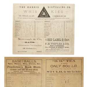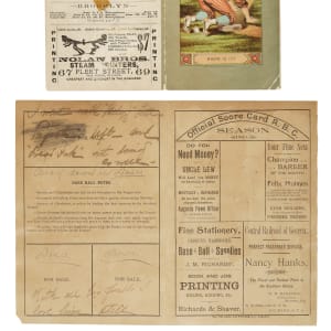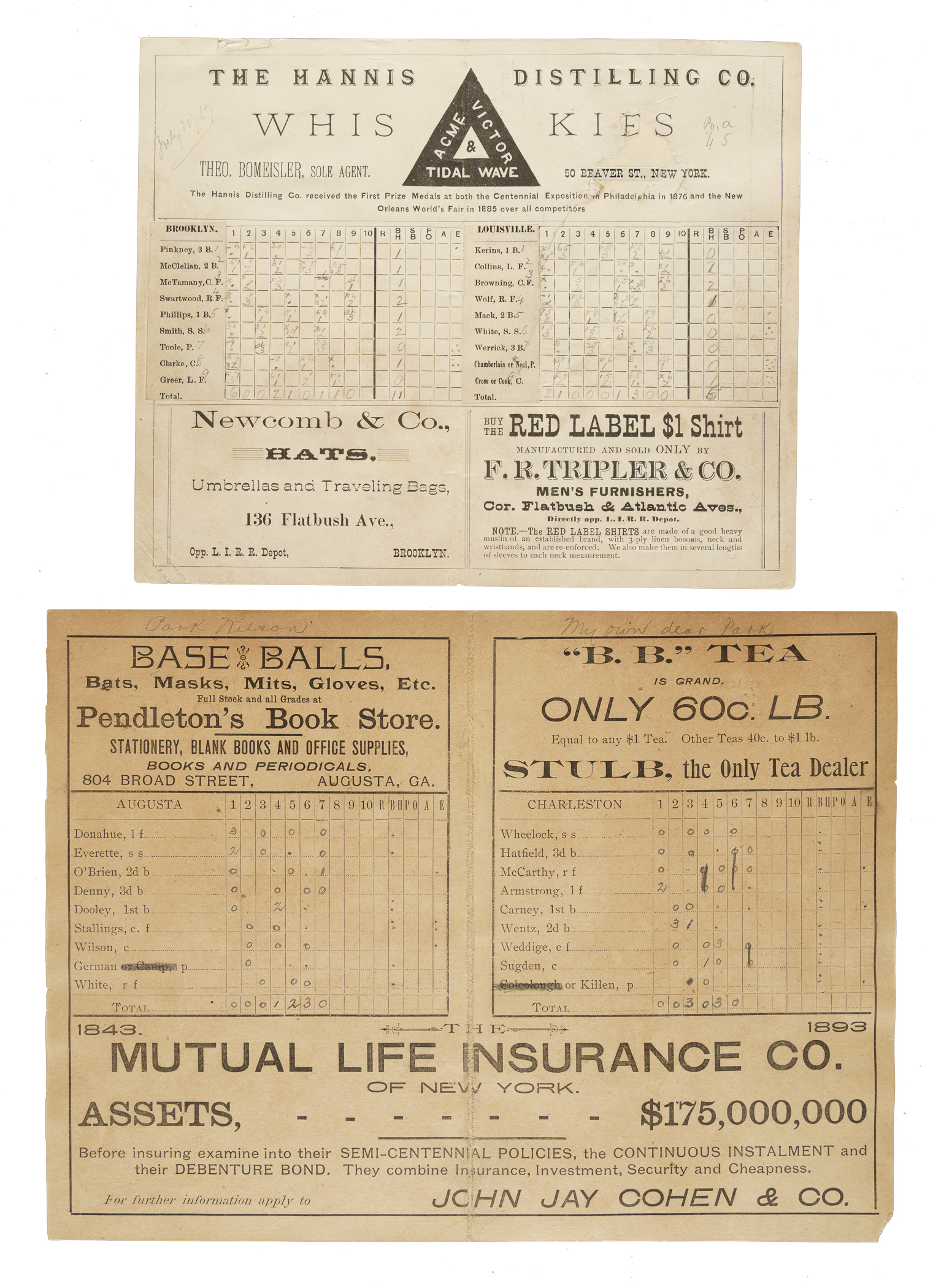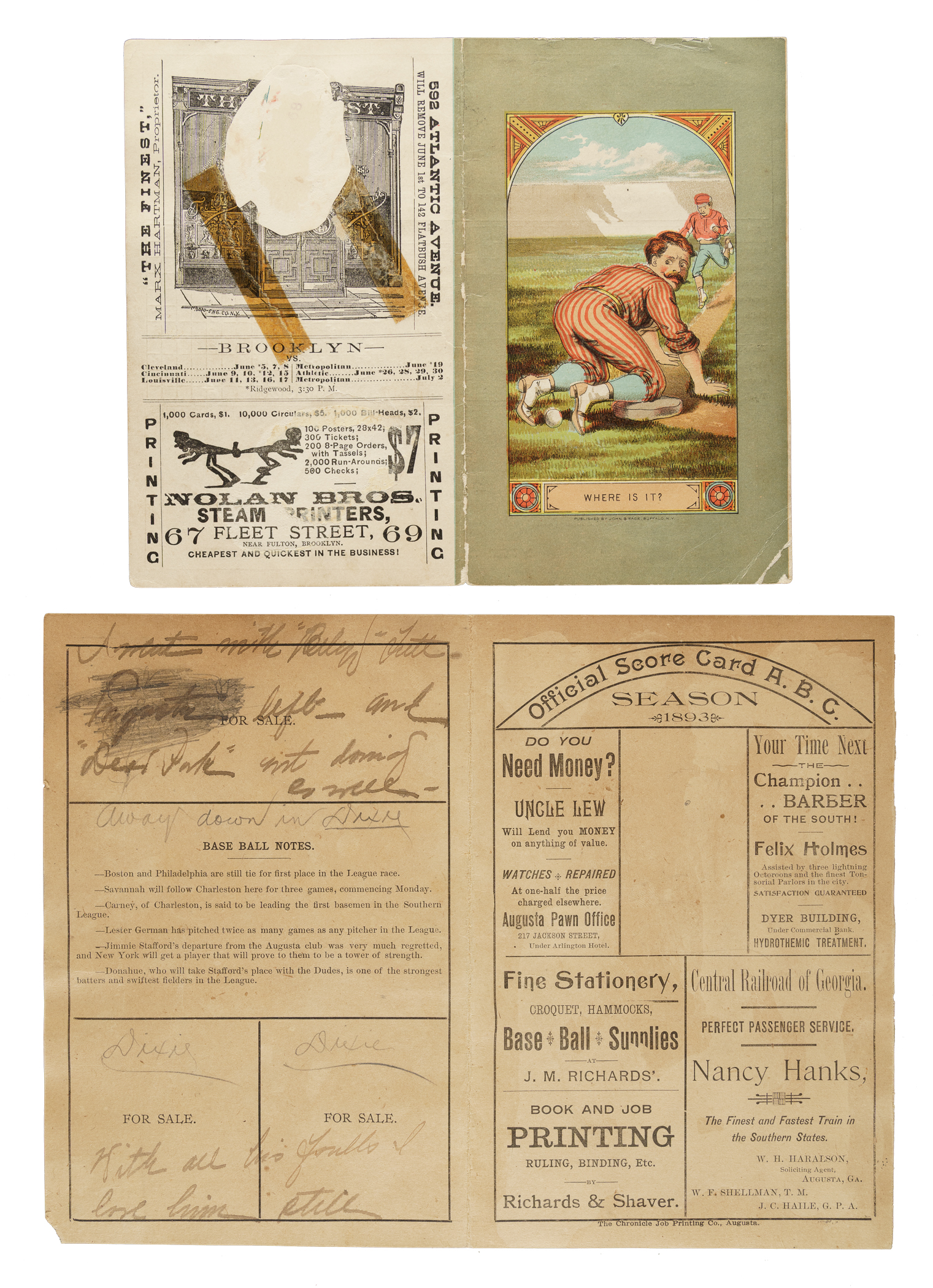 Pair of fold-over baseball scorecards issued for contests dating from the nineteenth-century. 1) 1887 Brooklyn (vs. Louisville) American Association Scorecard. The scorecard features a colorful illustration of a generic player on the cover, below which is the caption "Where Is It." Records an 11-7 Brooklyn victory on July 20, 1887. The date of the game is noted in pencil on the interior and has been verified by research. The preprinted lineups include Pinkney, McClelland, Swartwood, and Toole for Brooklyn, and Browning, Mack, Wolf, Kerins and Werrick for Louisville. The scorecard (8.75 x 7 inches; unfolded) has heavy creasing and tape repairs to large tears on the back cover. In Poor condition. 2) 1893 Augusta (vs. Charleston) Southern Association Scorecard. Records a 10-7 Charleston victory on July 8, 1893. The date of the game has been verified by research. The preprinted lineups include Denny, Everitt, Stallings, and Dooley for Augusta, and Carney, Wheelock, Hatfield, and McCarthy for Charleston. The scorecard (11-1/8 x 8-3/8 inches; unfolded) has heavy creasing, a chipped corner, and extensive writing on the back cover. In Poor condition. Total: 2 scorecards.