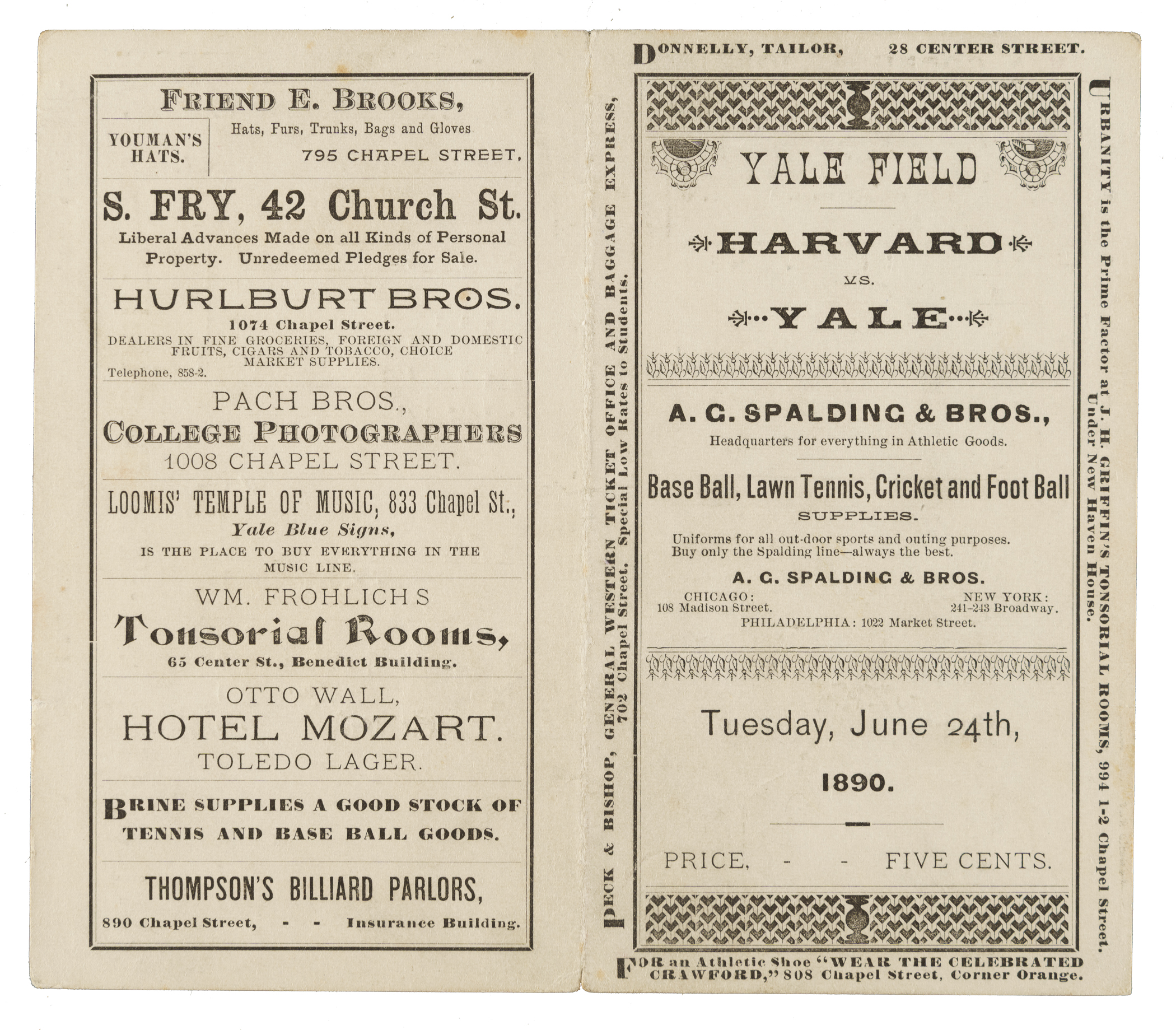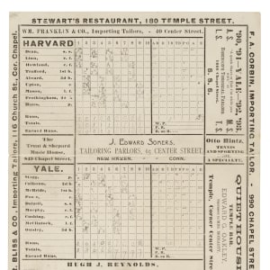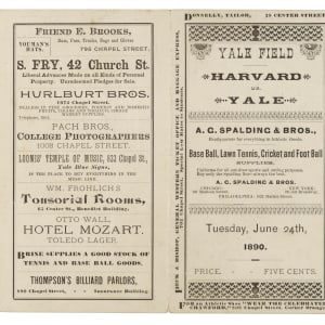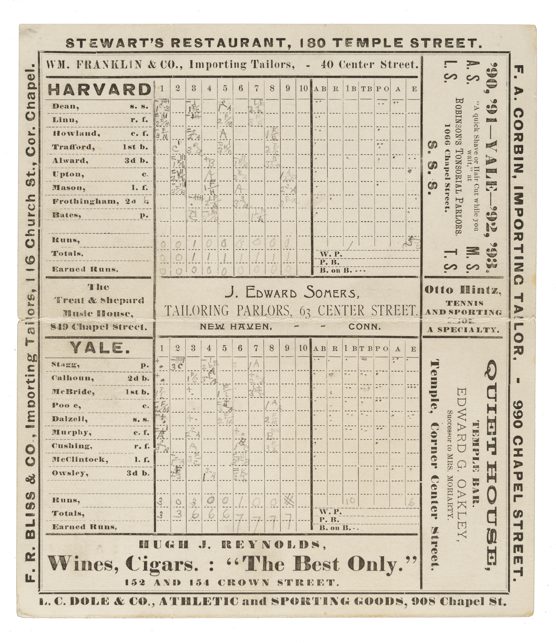 Fold-over scorecard issued for a collegiate baseball game between Yale and Harvard on June 24, 1890, at Yale Field. The preprinted lineup for Yale includes Amos Alonzo Stagg batting first and pitching. Neatly scored in pencil to record a 7-1 Yale victory. Stagg, who is best known today as the "Grand Old Man of Football" for his many contributions to the game as a coach, was the star pitcher on the Yale baseball team between the years 1884-1888 (college rules at the time allowed players to participate in sports during their postgraduate year). In addition to his talent on the mound, Stagg was also an outstanding football player and was chosen as a member of Walter Camp's first All-America Team in 1889. In 1890, Stagg turned down numerous offers from professional baseball clubs, including the New York Giants, and opted, instead, to become a college football coach at Springfield College. Two years later, he became the head football coach at the University of Chicago, where he remained for the next 41 years. During his tenure at Chicago, Stagg also coached the basketball team (he was a colleague of Dr. James Naismith at Springfield), the baseball team, and the track and field team. In 1951, he was inducted into the College Football Hall of Fame, and seven years later he was also elected to the Basketball Hall of Fame. The scorecard (6-1/2 x 7-3/8 inches; unfolded) displays moderate creasing. In Fair to Good condition overall.