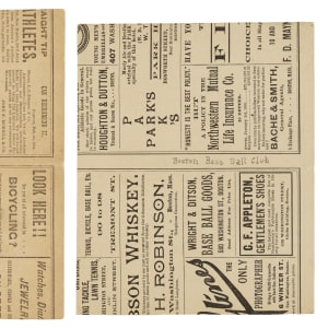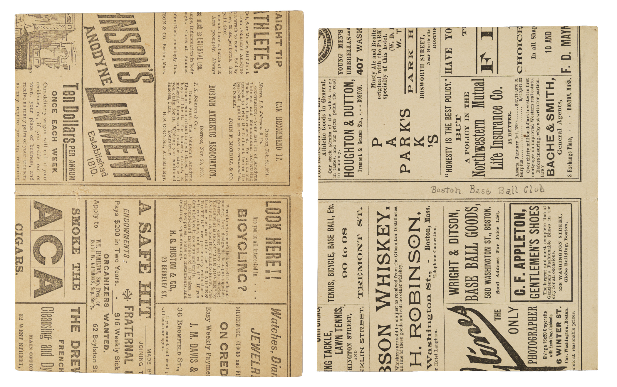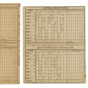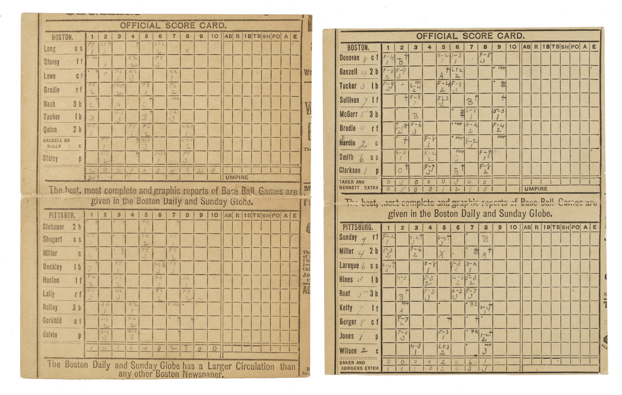 Pair of fold-over scorecards issued for contests between the Boston Beaneaters of the National League and the Pittsburgh Alleghanys. Each of these examples has been trimmed along the edges, leaving only remnants of the additional text visible. The preprinted lineups include Clarkson, Kelly, Nash, and Tucker for Boston; and Beckley, Galvin, Hanlon, and Sunday for Pittsburgh. Each is neatly scored in pencil on the scoring pages. Research indicates the one game took place on May 31, 1890, while the other game took place on September 17, 1891. Without respect to the previously mentioned trimming, the scorecards remain in Good condition overall, with bold printing. Total: 2 scorecards.