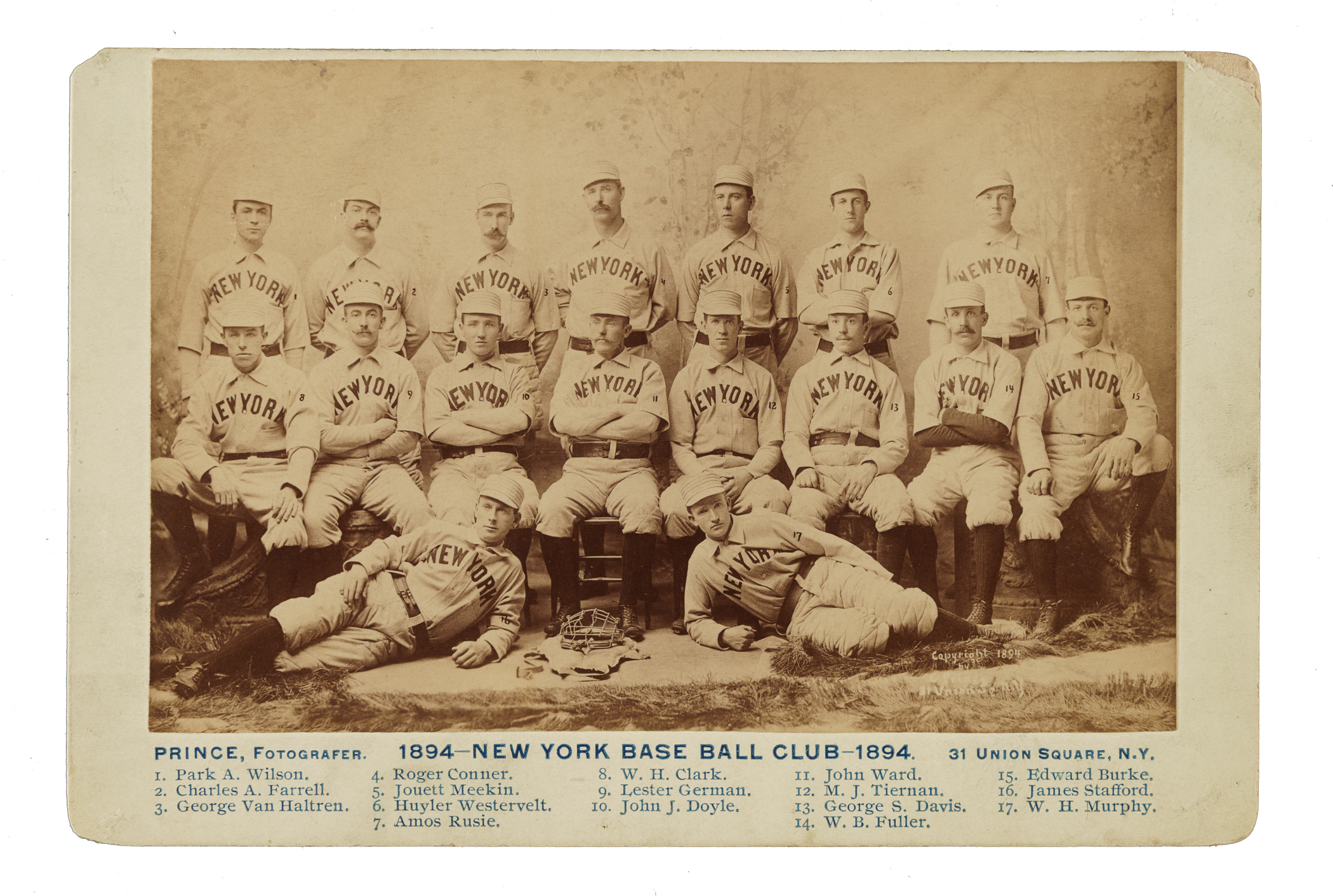Rare team cabinet card capturing the National League New York Giants in 1894. This is only the second example of this particular team cabinet we have ever seen. All the players are identified in print on the base of the mount, including Hall of Famers Roger Connor, John Ward, George Davis, and Amos Rusie. The team name and year ("1894-New York Base Ball Club-1894") and the photographer's credit ("Prince, Fotografer - 91 Union Square, N. Y.,") also appear in print on the mount. The New York Giants won the World Championship in 1894 by sweeping the Baltimore Orioles in the first ever Temple Cup series that fall. The photo, which offers outstanding clarity, remains in Very Good condition with a few surface indentations visible above the equipment pictured on the ground in front of the players. The mount (6.5 x 4.25 inches) displays a tiny chip in the upper left corner, paper loss on the upper right corner and evidence of album on the reverse. In Fair condition overall. Major League team cabinets from this era are both scarce and highly prized by collectors, especially those featuring several future Hall of Famers like this example.