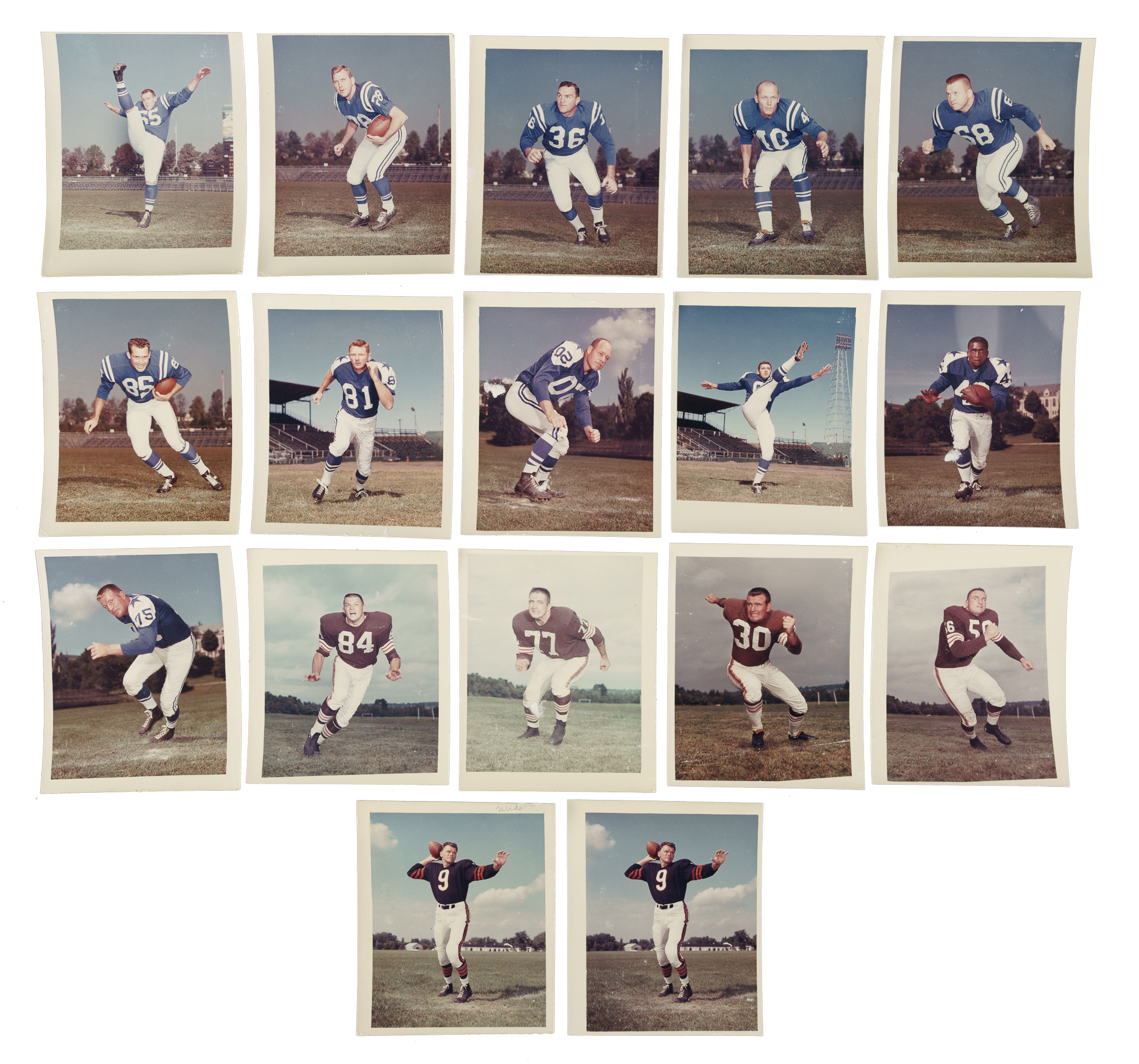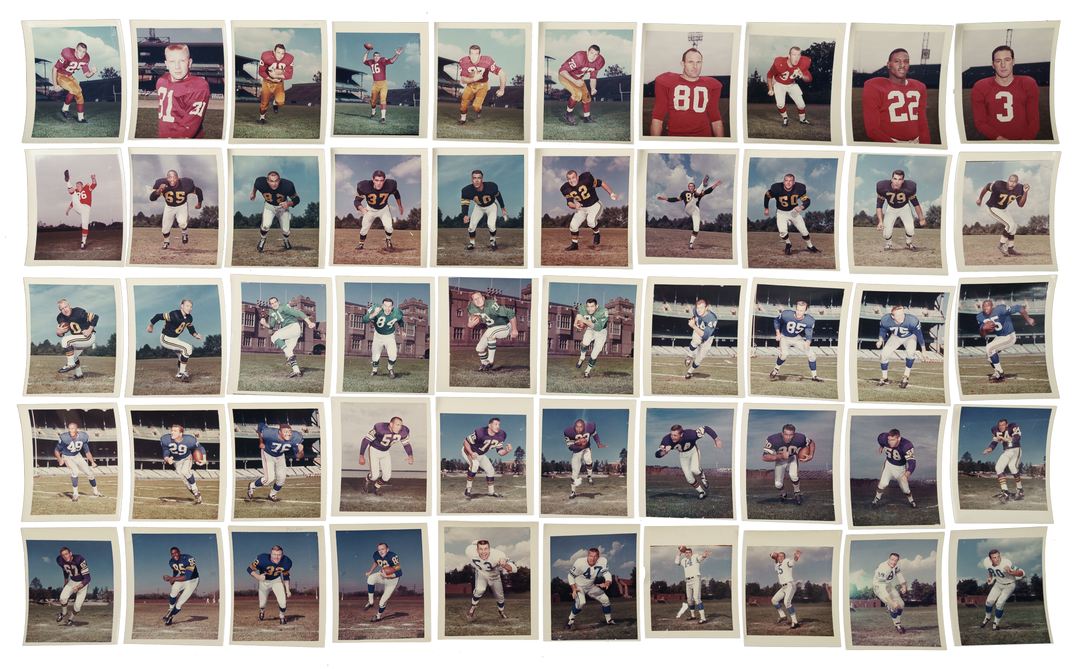 Offered is a rare and very interesting collection of 89 (of 87 different) photographs featuring players from teams of the National Football League, all used in the production of the 1962 Post Cereal football cards. These photos were used as components of the art boards that were created during the production process. Each color-photo measures approximately 4 x 4.75 inches and has the player's name and team affiliation written on either the front or back. This collection consists of photographs from the following NFL teams: Baltimore Colts (12, including two Berry, Donovan, Marchetti, Moore, and Parker), Chicago Bears (4, including Ditka and B. George), Cleveland Browns (5, including McCormack), Dallas Cowboys (7, including Lilly and Meredith), Detroit Lions (7, including Karras), Green Bay Packers (1 Hornung), Los Angeles Rams (3), Minnesota Vikings (10, including McElhenny and Tarkenton), New York Giants (10, including R. Brown, R. Grier, Huff, Robustelli, and Rote), Philadelphia Eagles (6, including Jurgenson and McDonald), Pittsburgh Steelers (12, including John Henry Johnson), San Francisco 49ers (2, including Jimmy Johnson), St. Louis Cardinals (4), and Washington Redskins (6). The photos remain in Very Good condition overall. This is an outstanding and unique collection that offers great insight into the production process for Post Cereal football cards. It would be a significant addition to any original card-artwork or card-production collection. Total: 89 photos.