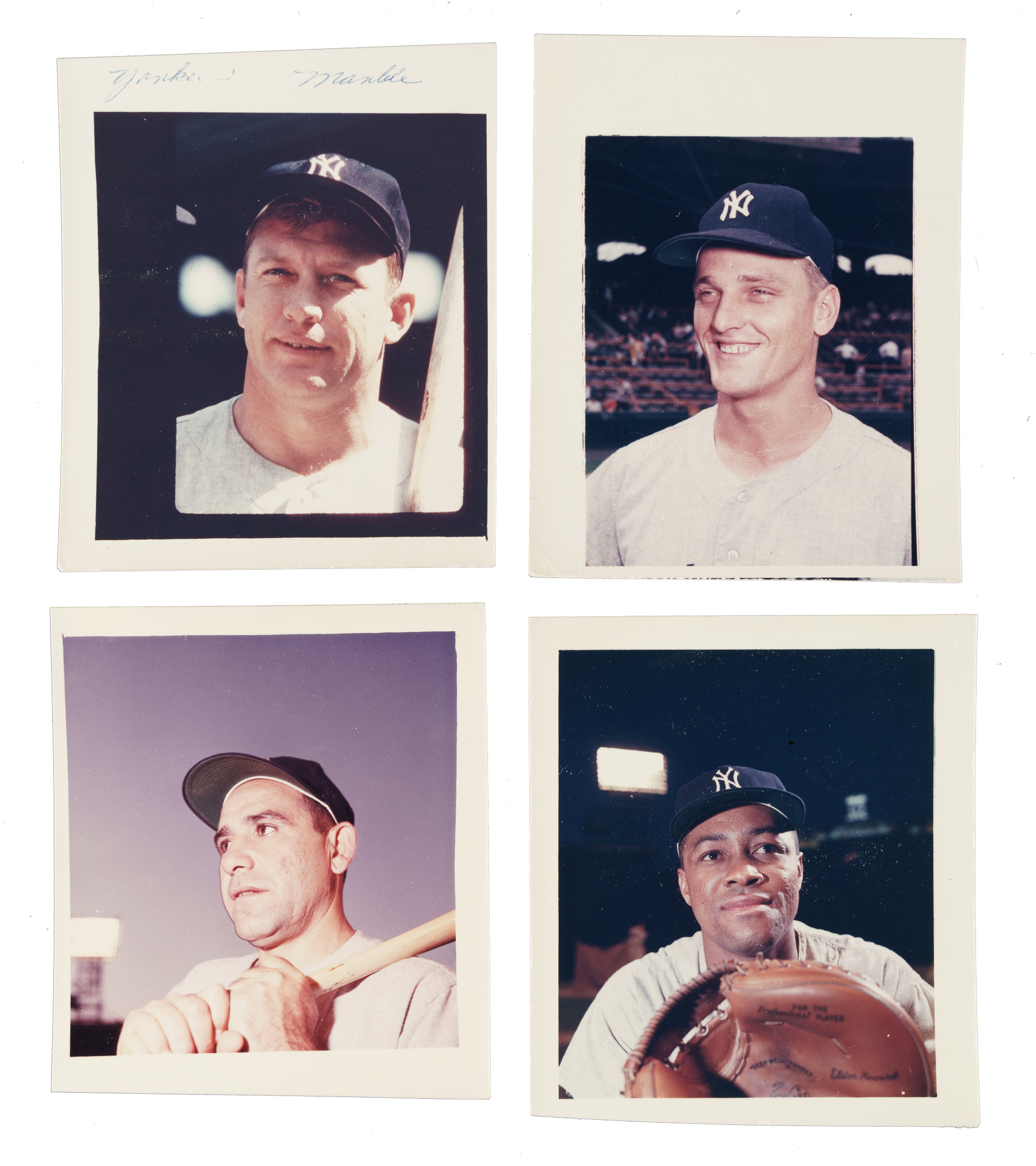 Offered is a rare and very interesting collection of 11 photographs featuring members of the New York Yankees, all but one (Mantle) used in the production of the 1963 Post Cereal and Jell-O baseball cards. These photos were used as components of the art boards that were created during the production process. Each color-photo measures approximately 4 x 4.75 inches and has the player's name and team affiliation written on the reverse (except Mantle, which is noted on the front). This collection consists of the following players: Berra, Blanchard, Boyer, E. Howard, Mantle (please note this image is not the same as used on his final card), Maris, Richardson, Skowron, Stafford, Terry, and Tresh. The photos remain in Very Good to Excellent condition overall. This is an outstanding and unique collection that offers great insight into the production process for Post Cereal and Jell-O cards. It would be a significant addition to any original card artwork or card-production collection. Total: 11 photos.