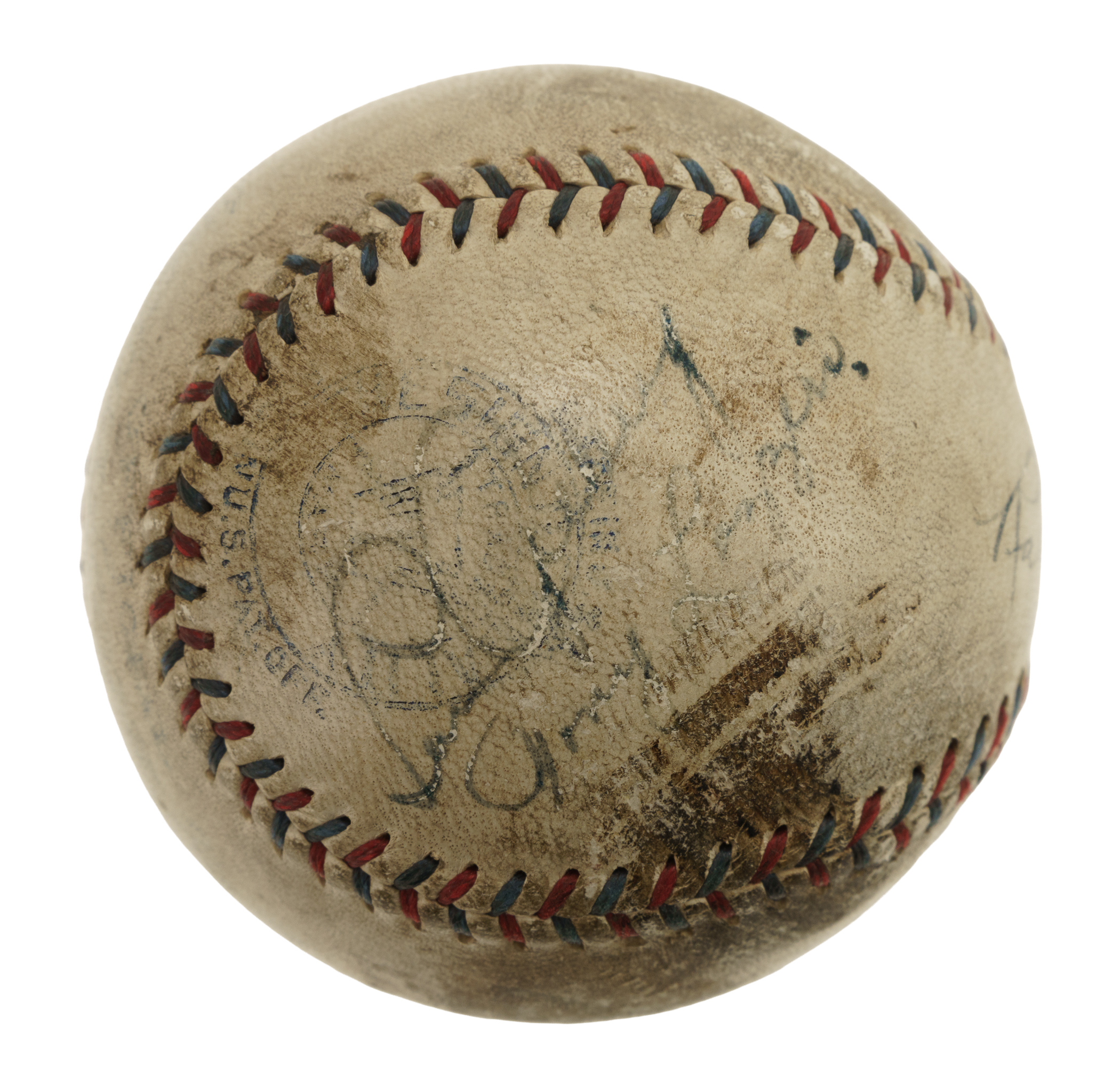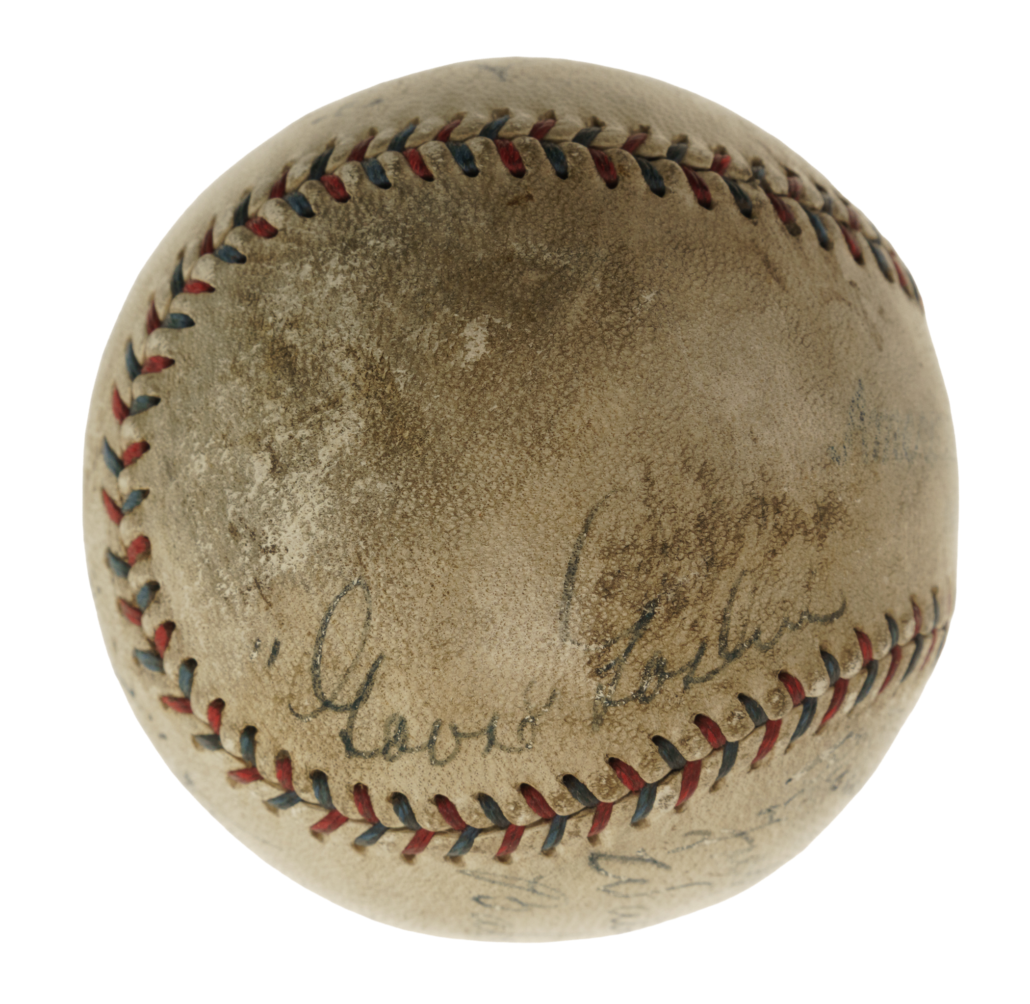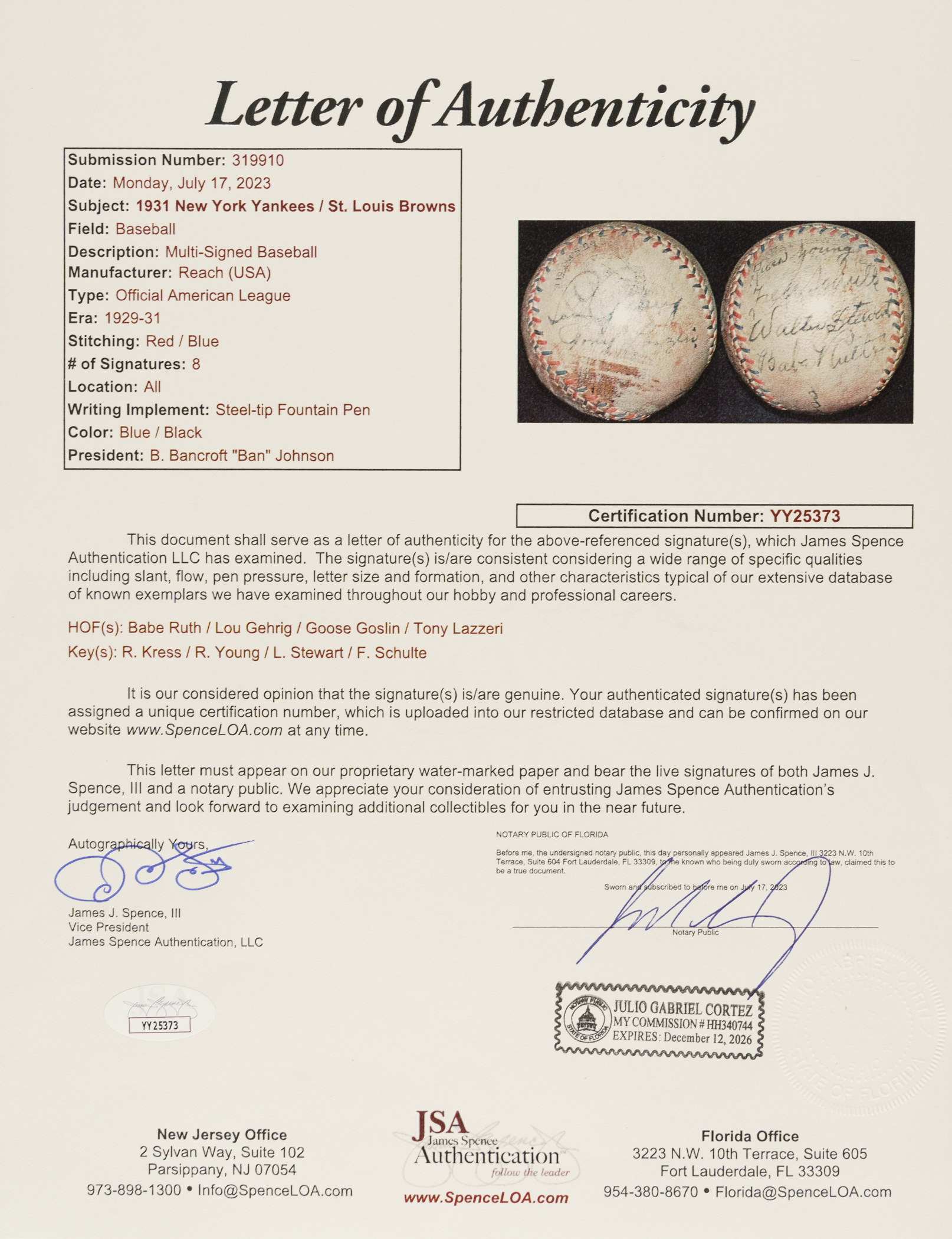 Official American League baseball (Johnson) signed in either black and blue fountain pen by eight members of either the 1931 New York Yankees or St. Louis Browns, including Babe Ruth, Lou Gehrig, Goose Goslin, Tony Lazzeri, Red Kress (sweet spot), Russ Young (only played for the Browns in 1931), Lefty Stewart, and Fred Schulte. The ball is moderately soiled with a number of surface abrasions. The manufacturer's labels are partially faded. In Fair to Good condition overall. Full LOA from James Spence/JSA.