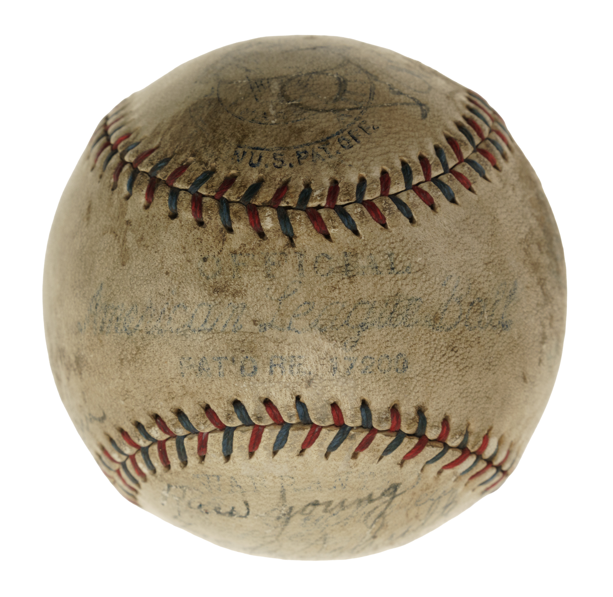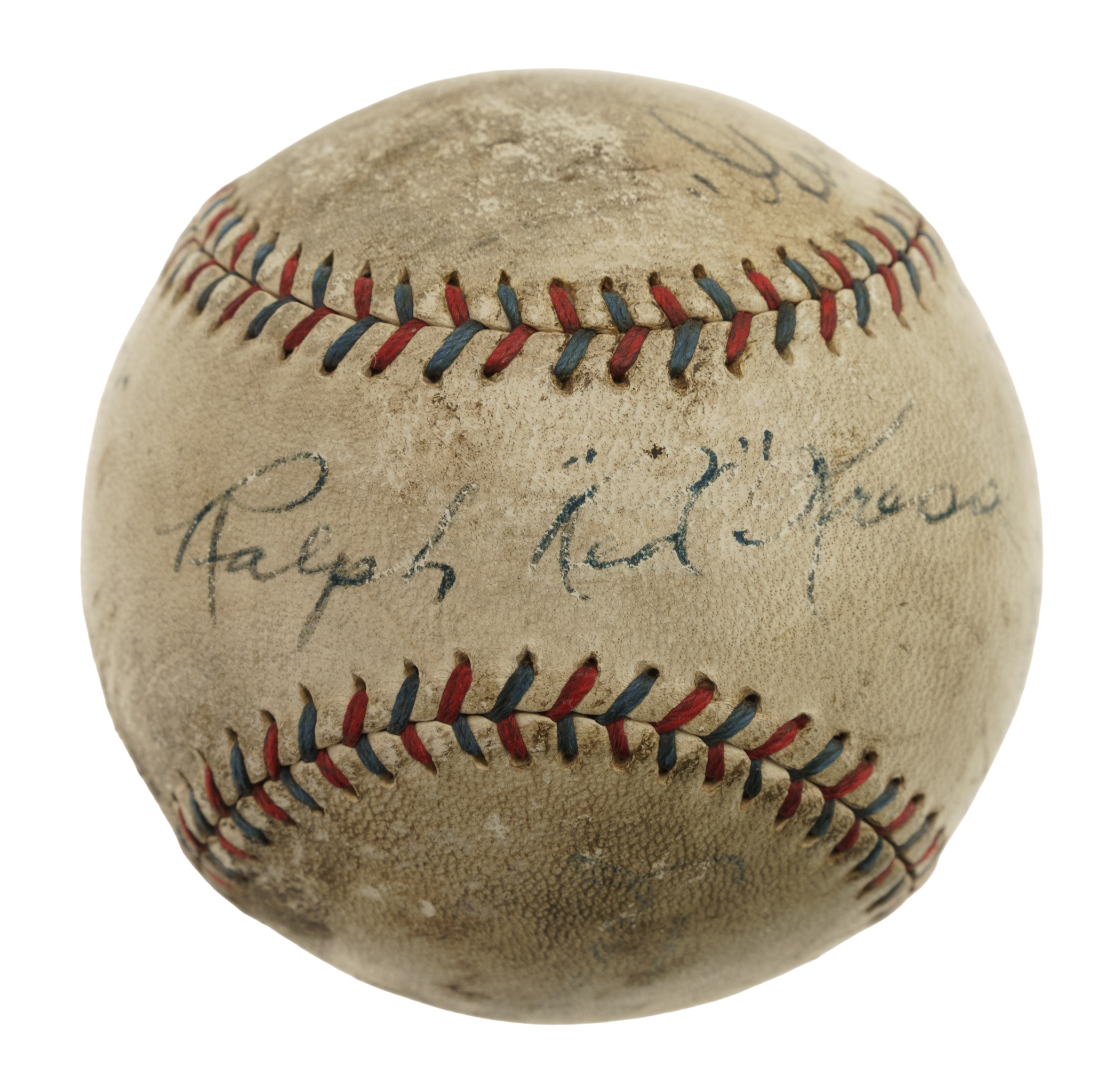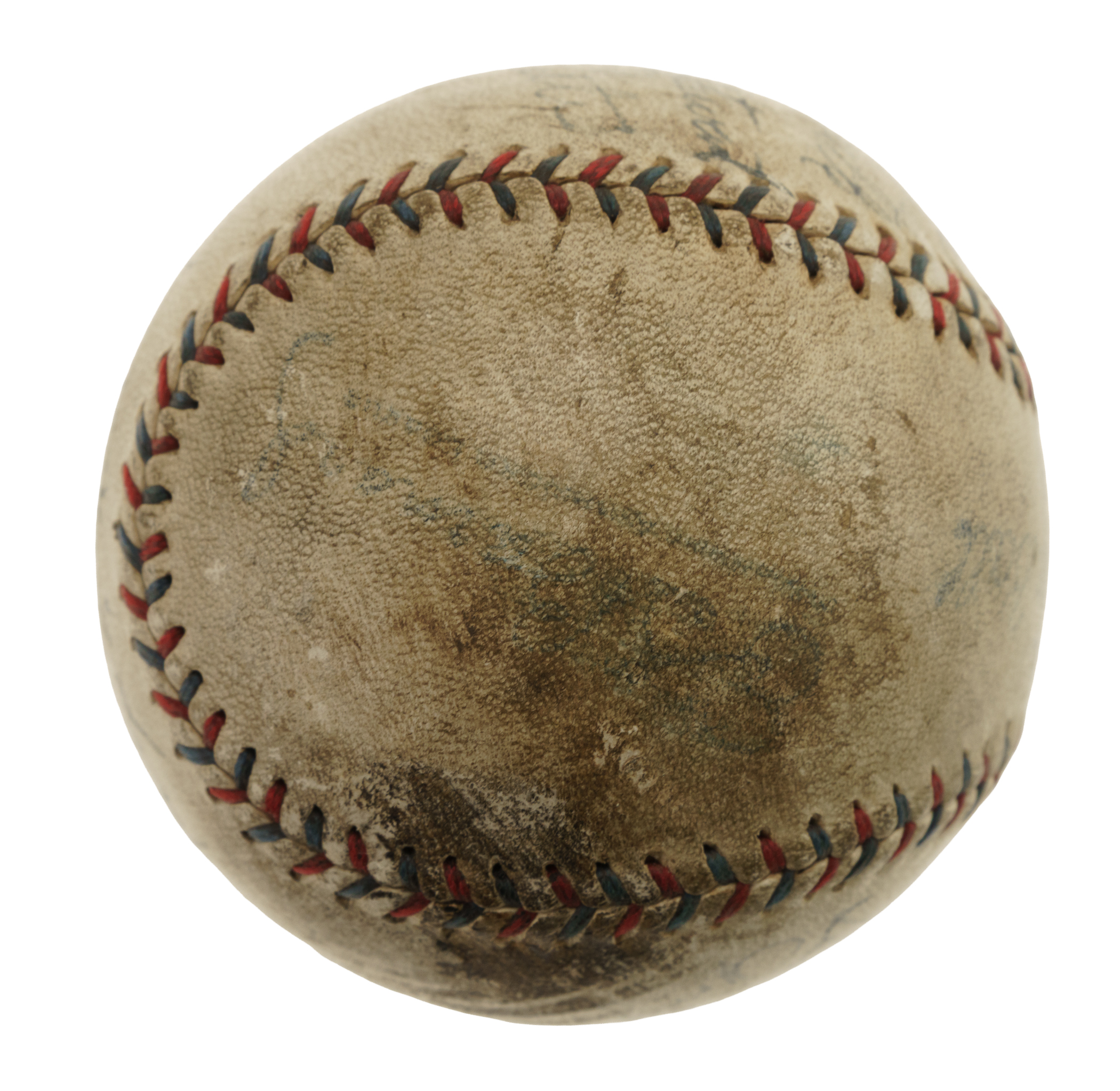 Official American League baseball (Johnson) signed in either black and blue fountain pen by eight members of either the 1931 New York Yankees or St. Louis Browns, including Babe Ruth, Lou Gehrig, Goose Goslin, Tony Lazzeri, Red Kress (sweet spot), Russ Young (only played for the Browns in 1931), Lefty Stewart, and Fred Schulte. The ball is moderately soiled with a number of surface abrasions. The manufacturer's labels are partially faded. In Fair to Good condition overall. Full LOA from James Spence/JSA.