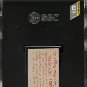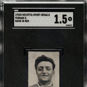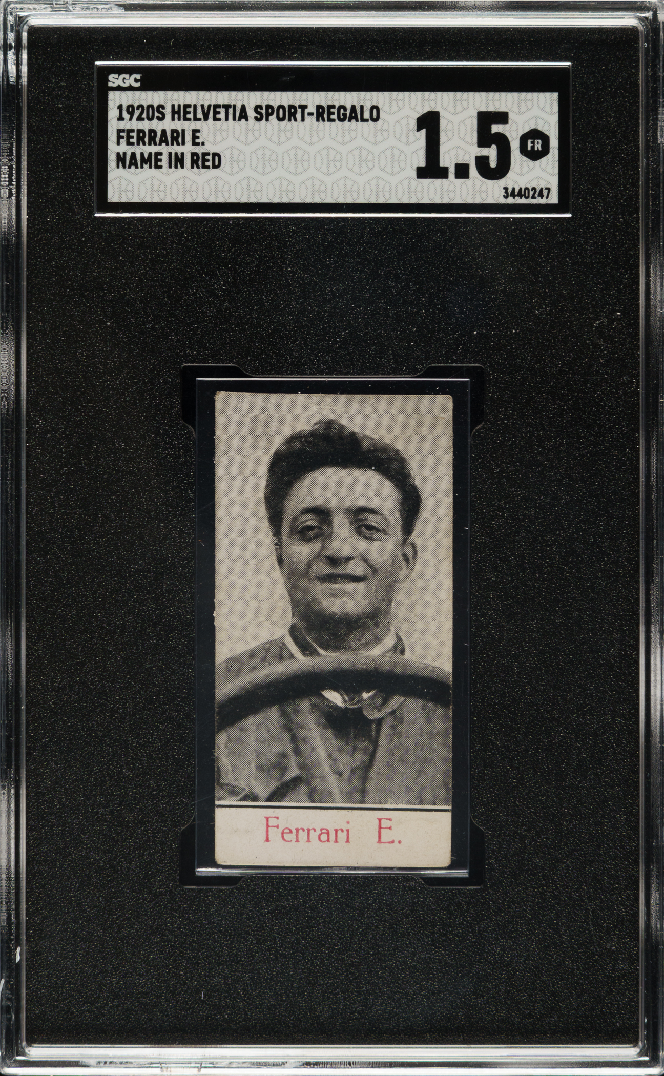 Graded FAIR 1.5 by SGC. Extremely rare example of Enzo Ferrari's rookie card from the circa 1924-1925 Cioccolato Helvetia Sport-Regalo series. To date, only five examples of this card have been graded between SGC and PSA. Before founding his iconic automobile brand in 1947, Ferrari was a race car driver, competing first with CMN (Costruzioni Meccaniche Nazional) and later with Alfa Romeo. The offered card features a black and white image of Ferrari from his racing days, with his name printed in red ink below. The text on the reverse, printed in Italian, outlines the redemption offer for collectors who completed the 90-card set. Despite the modest technical grade, this card retains outstanding eye appeal and would be a welcome addition to any world-class racing collection.