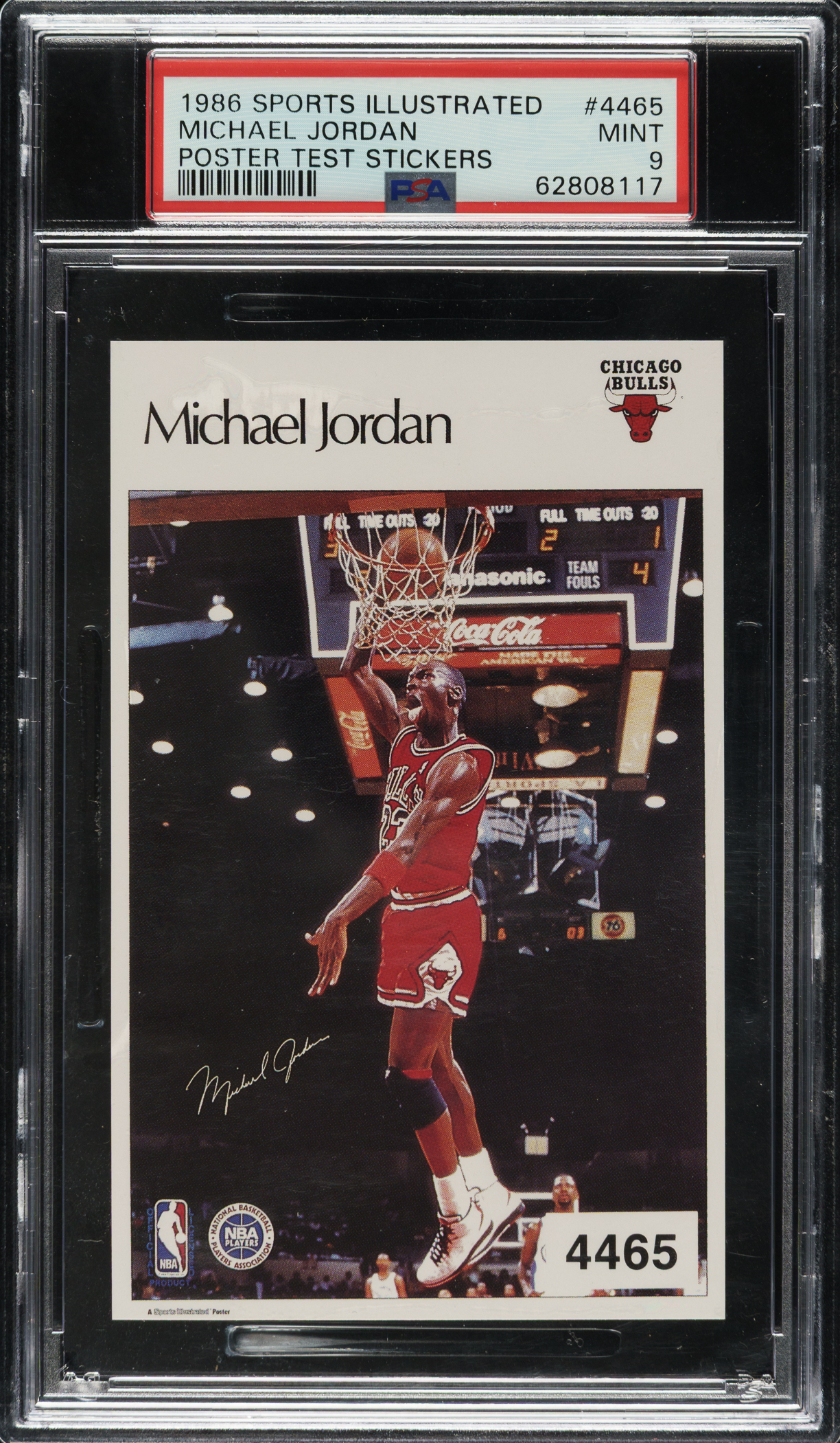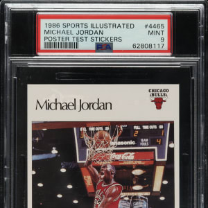 Graded MINT 9 by PSA. Highest-graded example! Outstanding example of Michael Jordan from the 1986-1987 Sports Illustrated Poster Test Stickers series. This example boasts vibrant colors, superb image quality, and sharp corners. The blank reverse is clean. This is a spectacular example of this desirable and rarely offered Jordan piece.