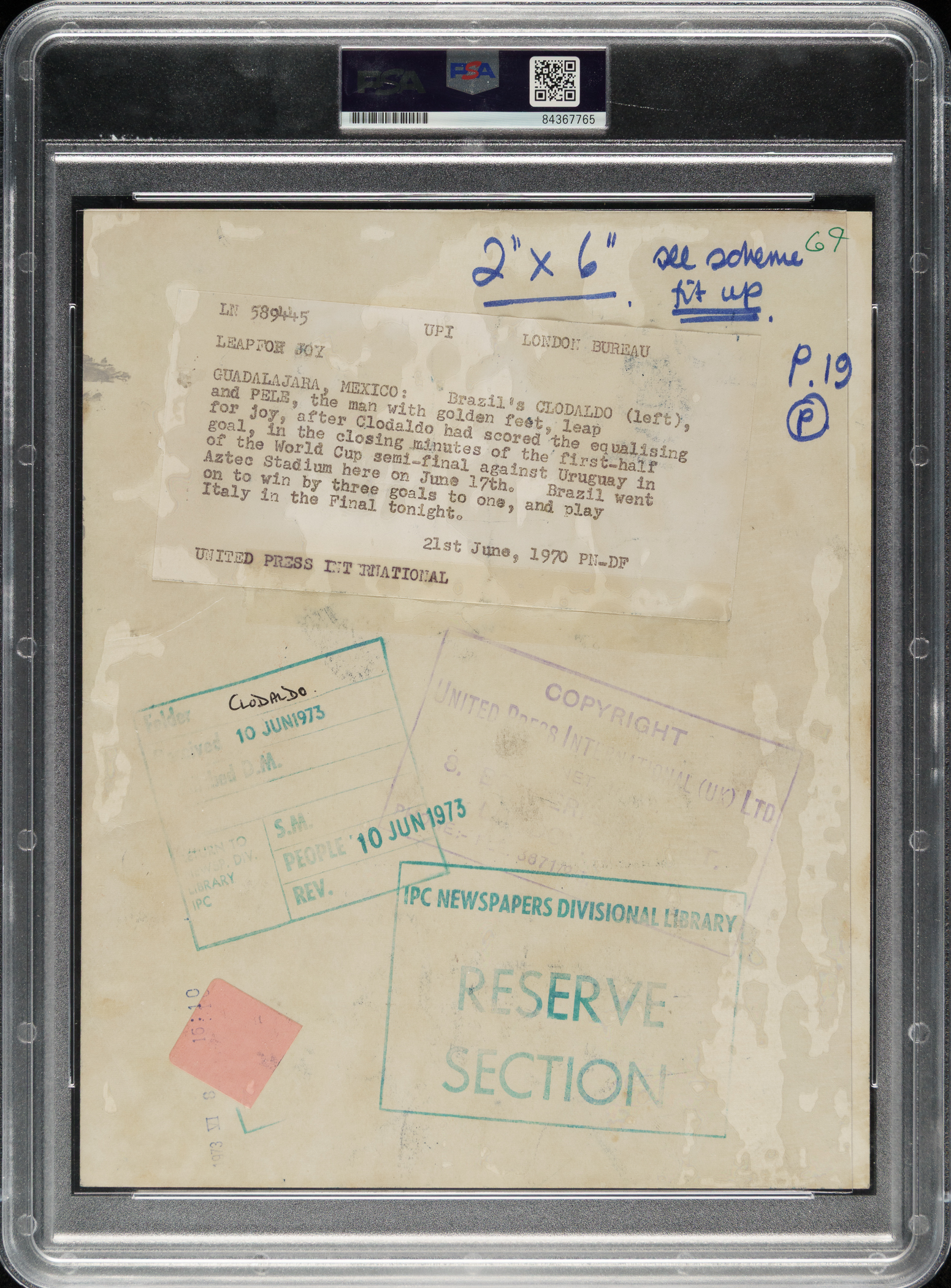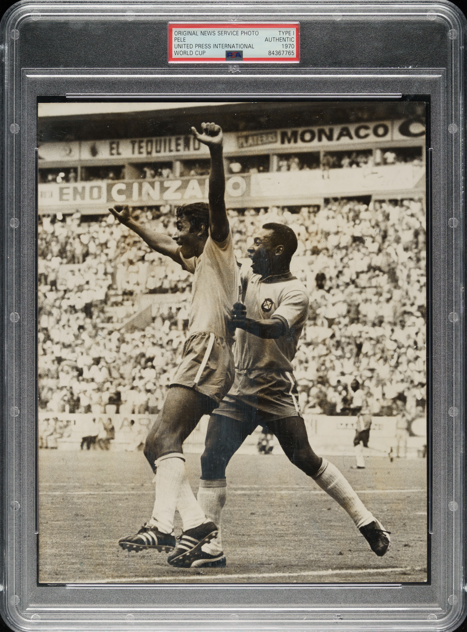 Original news photo of Pelé as a member of the Brazilian soccer team during the 1970 World Cup semi-final. Encapsulated and certified as an original Type I photograph by PSA/DNA. Pelé is captured celebrating with teammate Clodoaldo after the latter had just scored the equalizing goal against Uruguay just before halftime. Brazil would go on to win the game 3-1 and defeat Italy 4-1 in the final. Today, the 1970 Brazilian squad is often cited as one of the greatest international teams of all time. The reverse displays the original "United Press International" paper news caption, editorial notations, a "United Press International" credit stamp, and a few additional filing stamps. The photo (8 x 10 inches) is in Excellent condition overall.