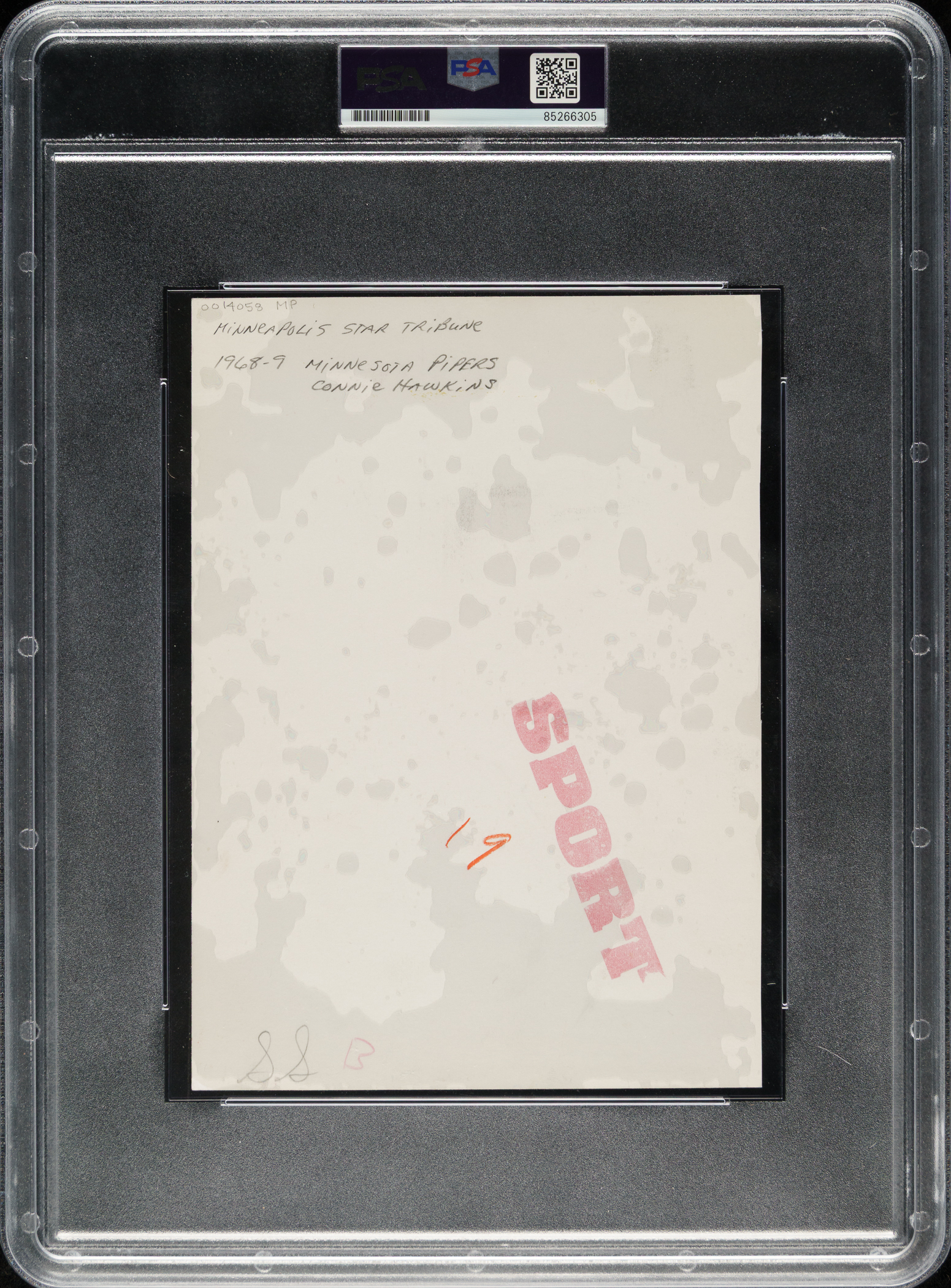 Original photo of Connie Hawkins as a member of the Minnesota Pipers of the ABA, circa 1968-1969. Encapsulated and certified as an original Type I photograph by PSA/DNA. Hawkins is captured in uniform, dribbling during a photo shoot. The reverse displays editorial notations and a "SPORT" stamp. The photo (5.75 x 8 inches), which has been trimmed to its current dimensions, features Hawkins' name and team handwritten along the bottom border. Excellent condition overall.