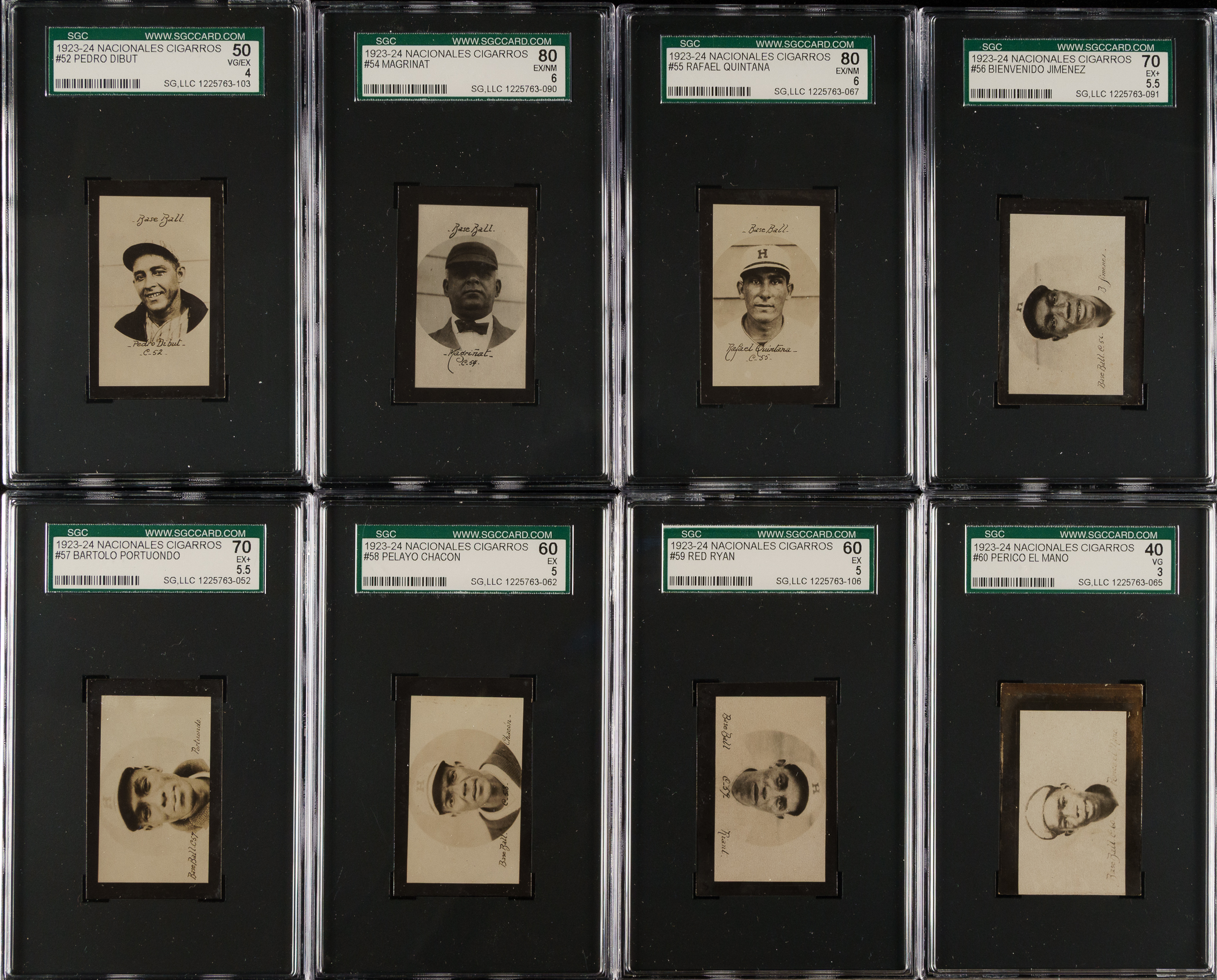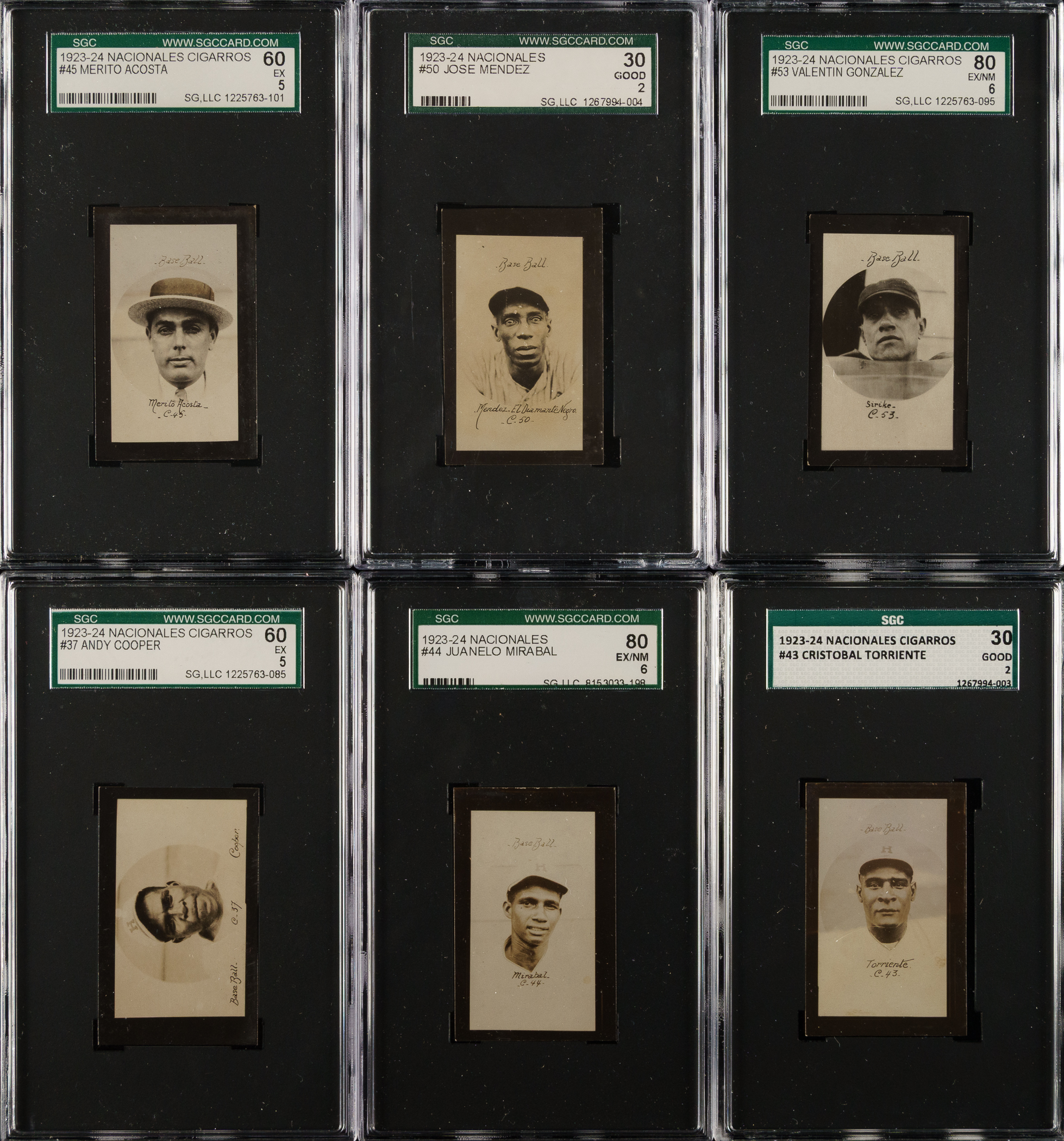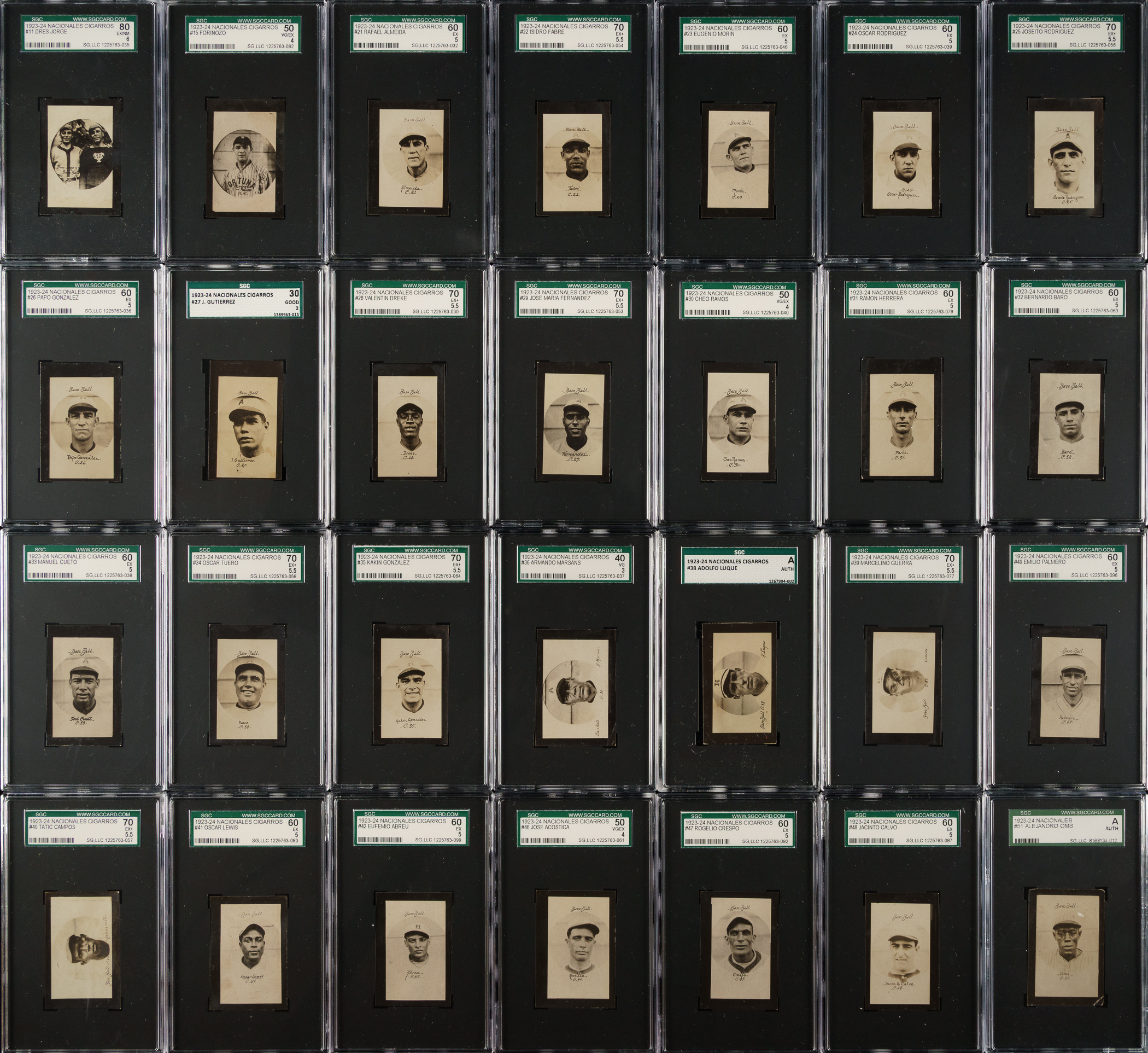 One of the rarest of all Cuban card issues is the Nacionales Cigarros tobacco set, issued in 1923-1924. This set includes many Negro Leaguers who played in the Cuban Winter League, including several major Negro League stars who appear in very few sets. Highlighted by Hall of Famers Andy Cooper (rookie card), Jose Mendez (rookie card) and Cristobal Torriente (rookie card), and many other stars, including Adolfo Luque and Armando Marsans. Offered is a complete set of this rare issue consisting of 40 different cards (#20-60) plus two additional cards not from this subset (#11 Dres Jorge and 15 Forinozo). These cards have striking, real-photo style portrait images with advertising on the reverse. All 42 cards have been professionally graded and encapsulated by SGC. SGC Grading Composite: EX/NM 80 (5 cards): #11, 44, 53, 54, and 55. EX+ 70 (10 cards): #22, 25, 28, 29, 34, 35, 39, 40, 56, and 57. EX 60 (16 cards): #21 Almeida, 23, 24, 26, 31, 32, 33, 37 Cooper RC, 41, 42, 45, 47, 48, 49, 58, and 59. VG/EX 50 (4 cards): #15, 30, 46, and 52. VG 40 (2 cards): #36 Marsans and 60. GOOD 30 (3 cards): #27, 43 Torriente RC, and 50 Mendez RC. Authentic (2 cards): #38 Luque and 51 Oms. This is an extremely rare complete set of this important and popular 1920s Cuban issue, the first we have ever offered. Total: 42 cards. The size/weight of this item requires that there will be an additional shipping charge for this lot.