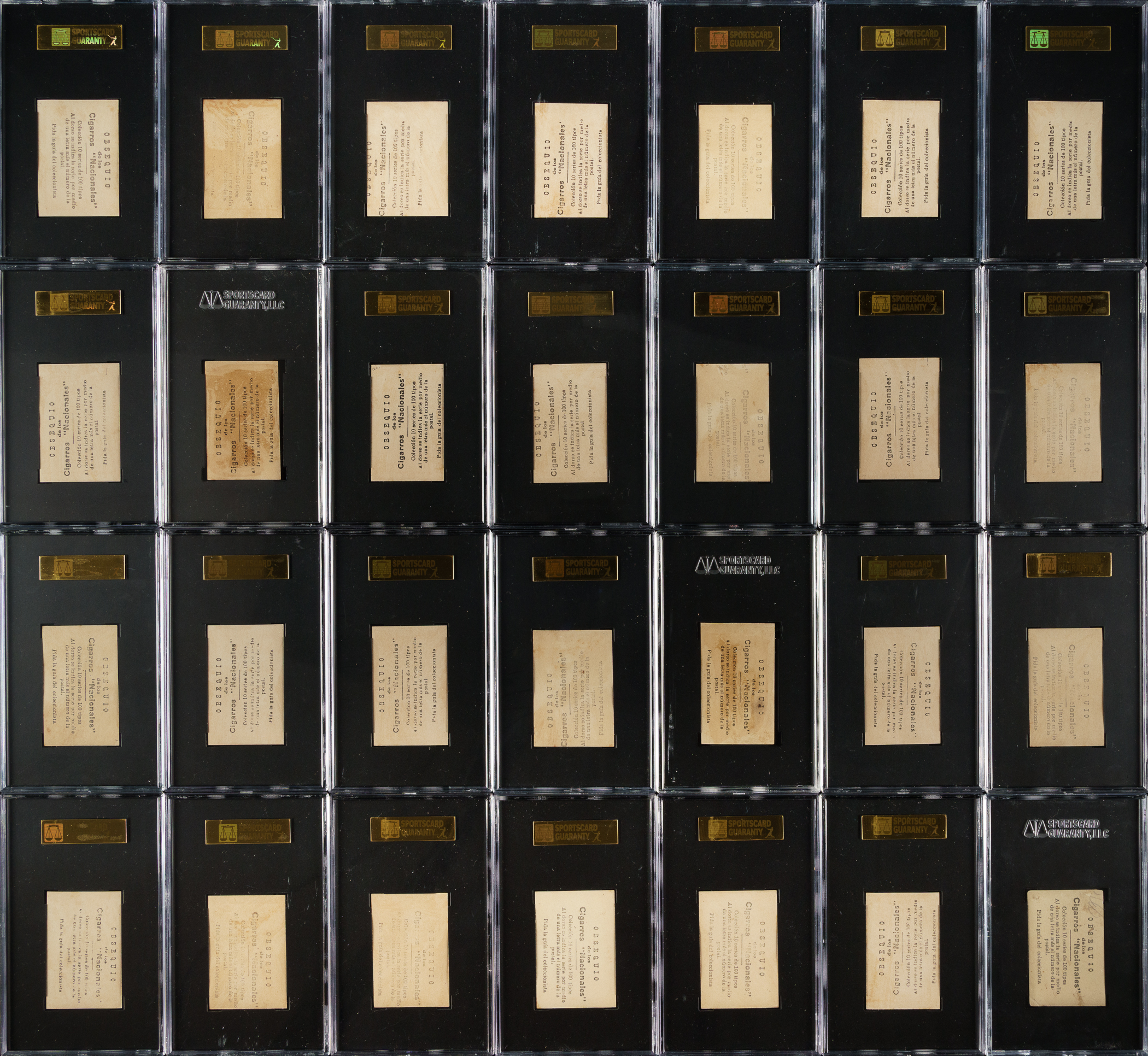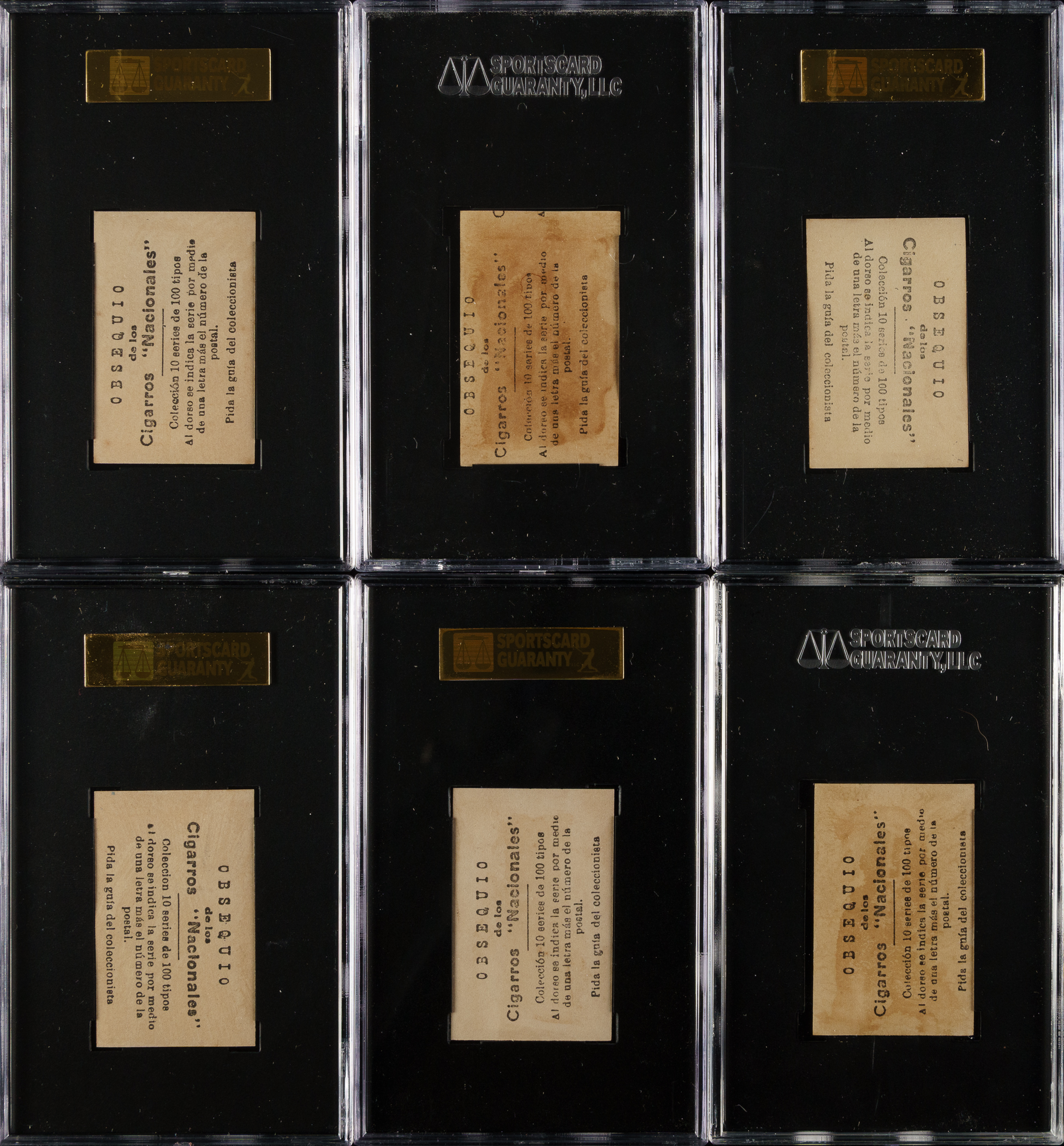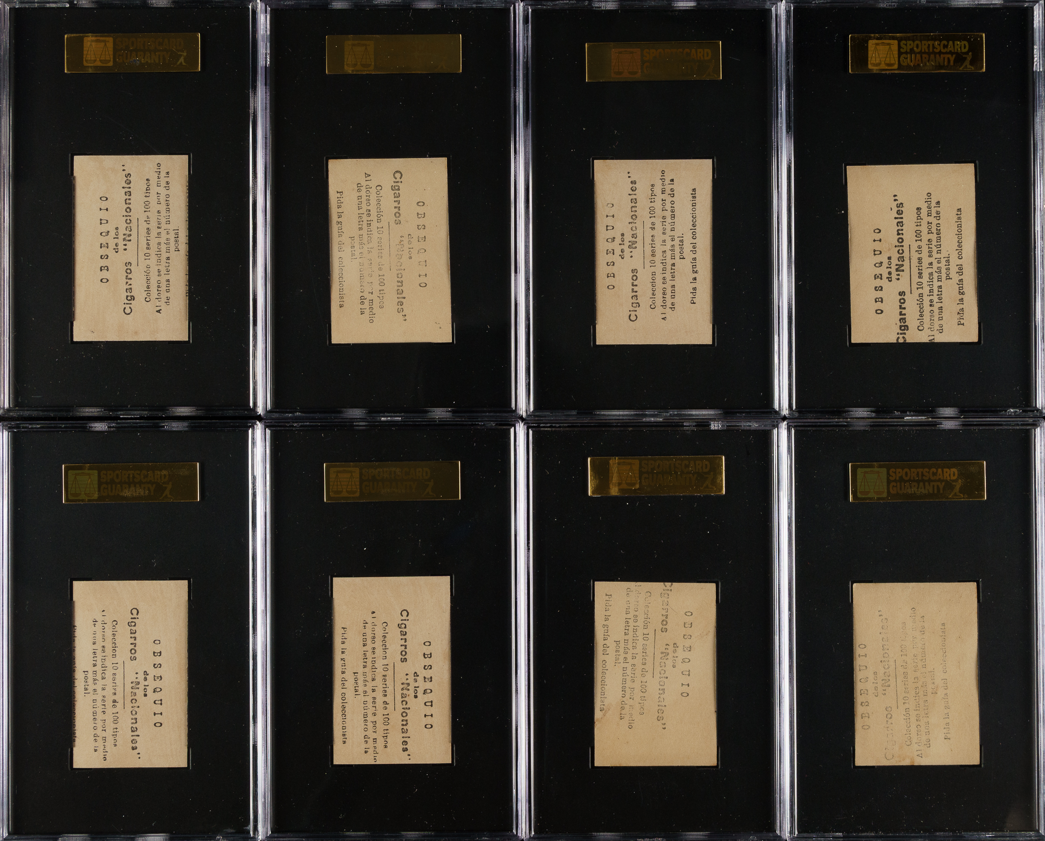 One of the rarest of all Cuban card issues is the Nacionales Cigarros tobacco set, issued in 1923-1924. This set includes many Negro Leaguers who played in the Cuban Winter League, including several major Negro League stars who appear in very few sets. Highlighted by Hall of Famers Andy Cooper (rookie card), Jose Mendez (rookie card) and Cristobal Torriente (rookie card), and many other stars, including Adolfo Luque and Armando Marsans. Offered is a complete set of this rare issue consisting of 40 different cards (#20-60) plus two additional cards not from this subset (#11 Dres Jorge and 15 Forinozo). These cards have striking, real-photo style portrait images with advertising on the reverse. All 42 cards have been professionally graded and encapsulated by SGC. SGC Grading Composite: EX/NM 80 (5 cards): #11, 44, 53, 54, and 55. EX+ 70 (10 cards): #22, 25, 28, 29, 34, 35, 39, 40, 56, and 57. EX 60 (16 cards): #21 Almeida, 23, 24, 26, 31, 32, 33, 37 Cooper RC, 41, 42, 45, 47, 48, 49, 58, and 59. VG/EX 50 (4 cards): #15, 30, 46, and 52. VG 40 (2 cards): #36 Marsans and 60. GOOD 30 (3 cards): #27, 43 Torriente RC, and 50 Mendez RC. Authentic (2 cards): #38 Luque and 51 Oms. This is an extremely rare complete set of this important and popular 1920s Cuban issue, the first we have ever offered. Total: 42 cards. The size/weight of this item requires that there will be an additional shipping charge for this lot.