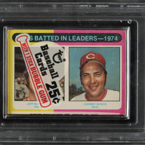 Graded NM-MT 8 by PSA. High-grade original unopened cello pack from the 1975 Topps baseball set featuring #308 Jeff Burroughs/Johnny Bench RBI Leaders on top and Hall of Famer Bob Gibson (#150) on the bottom. The set features the rookie cards of Hall of Famers Gary Carter, George Brett, Jim Rice, and Robin Yount. This is an outstanding original, unopened cello pack.